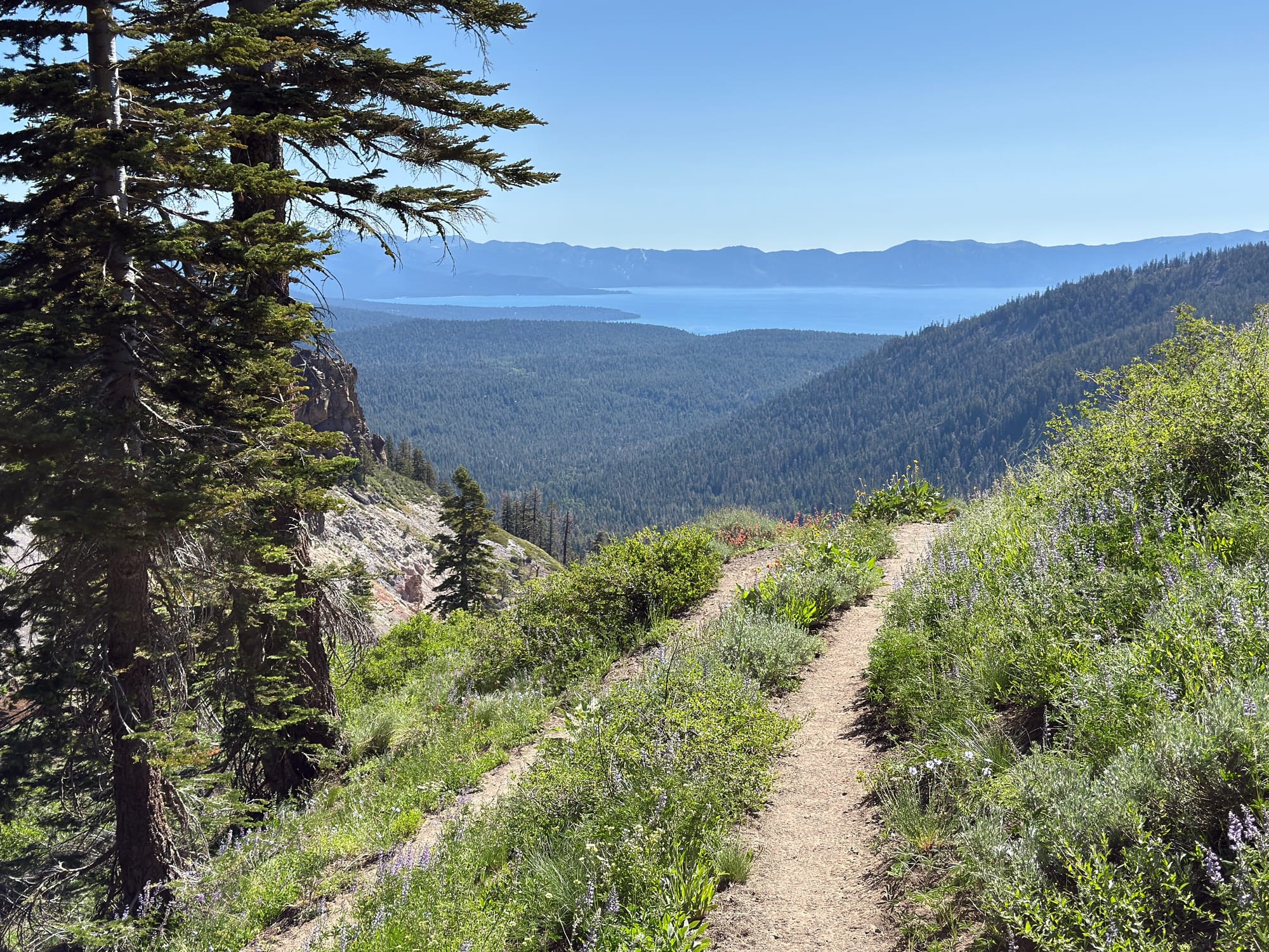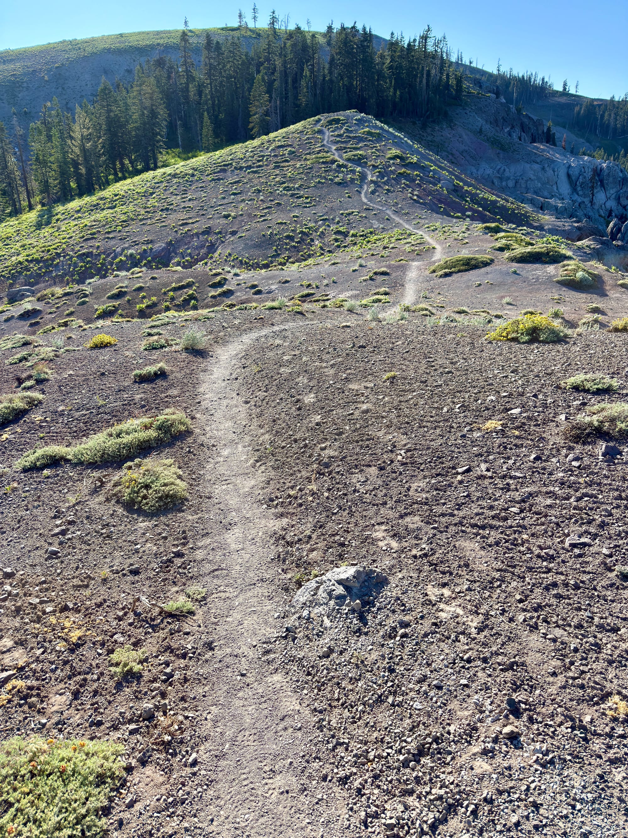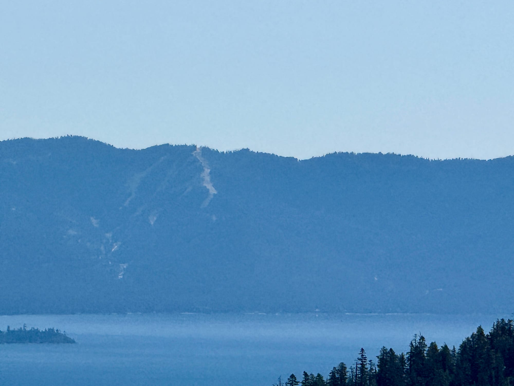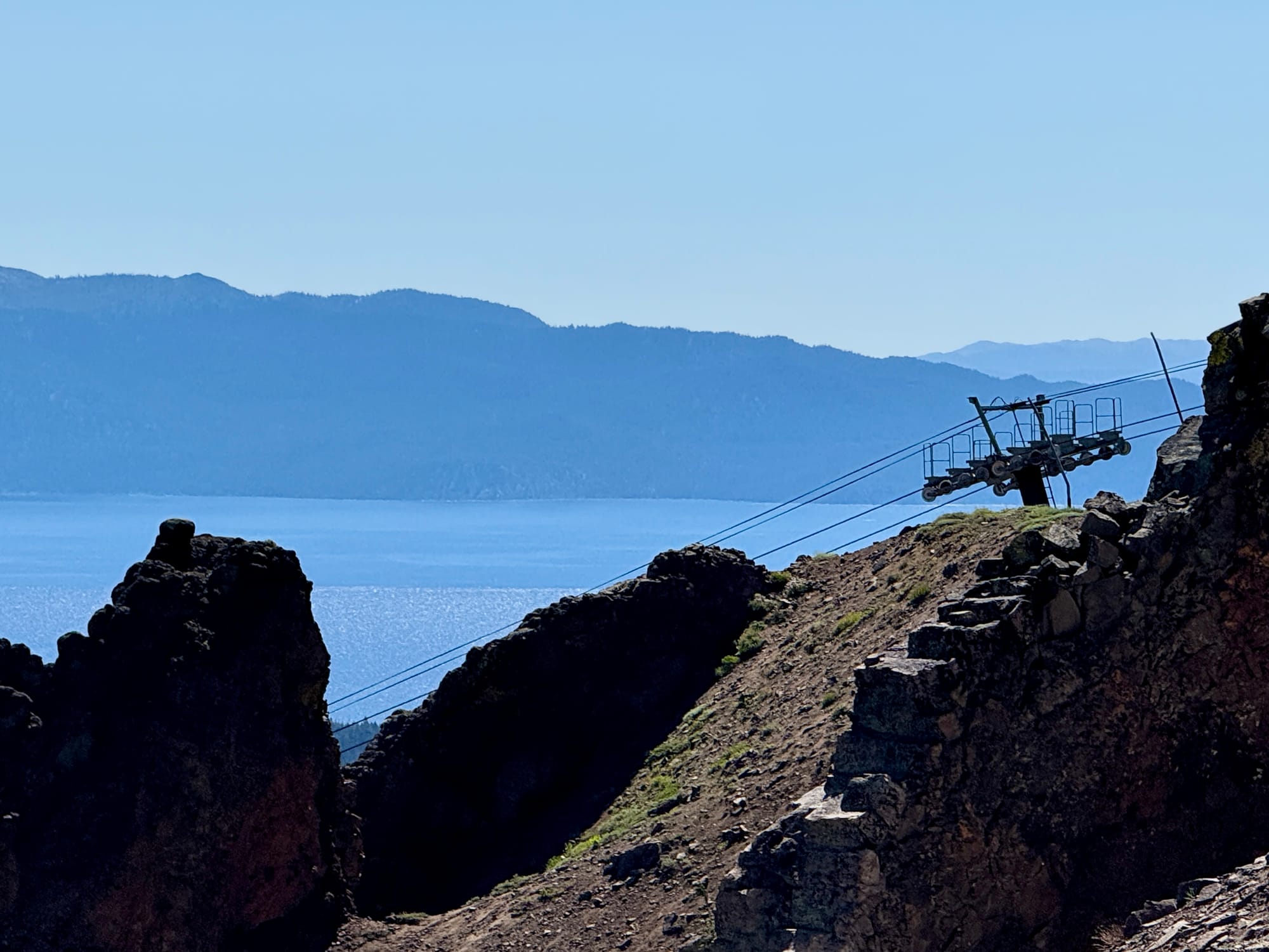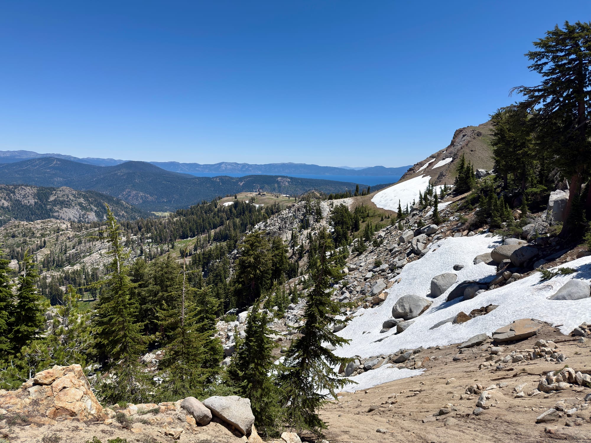 The trail cut across one of those steep snow chutes, and everyone having sent their snow gear home unable to kick steps meant that we were routed directly up to the highest lift at Tahoe Donner on a detour consisting of the steepest ~500 feet of the entire trail so far.