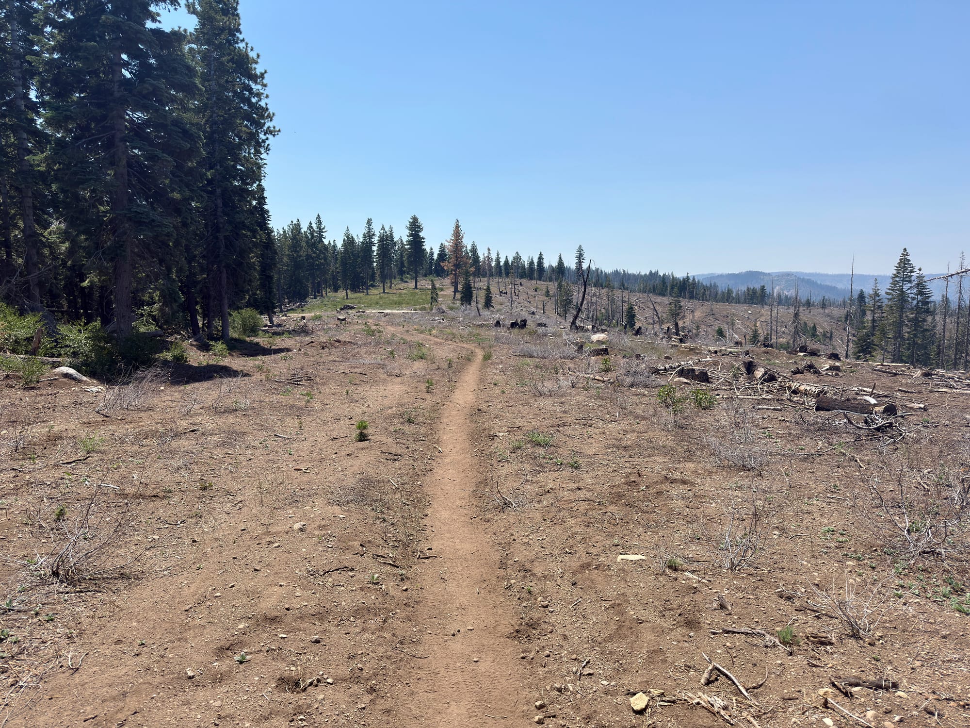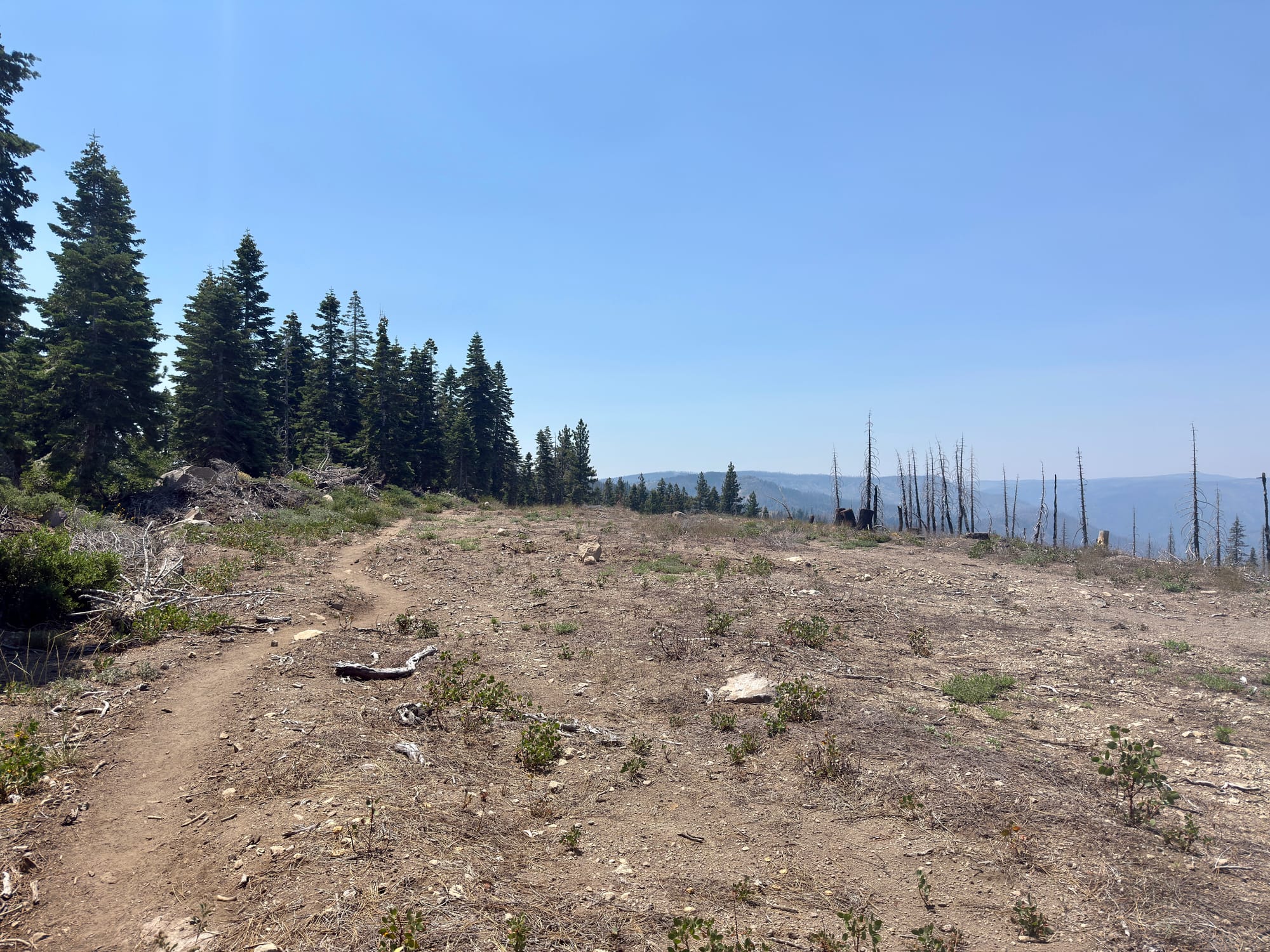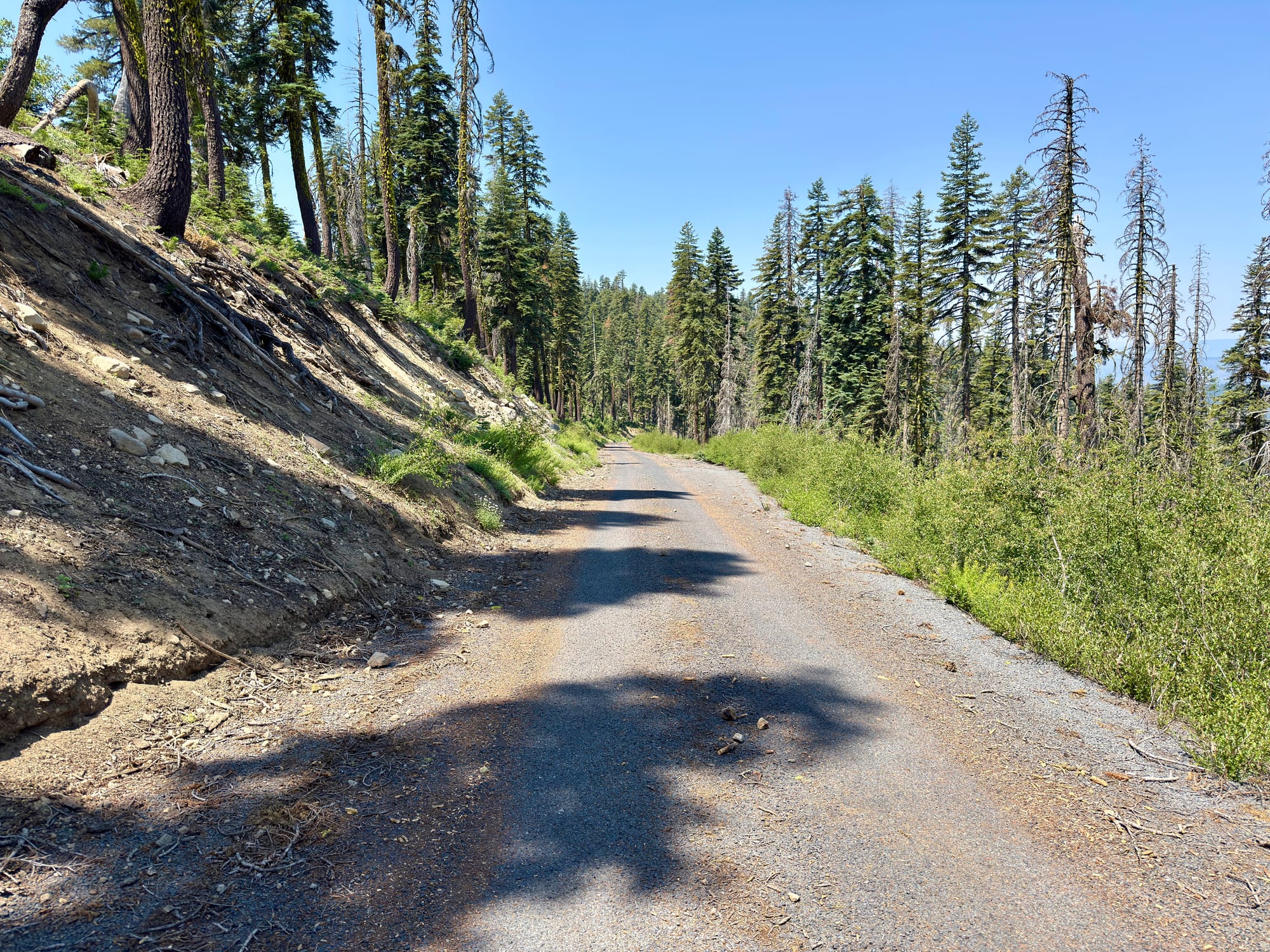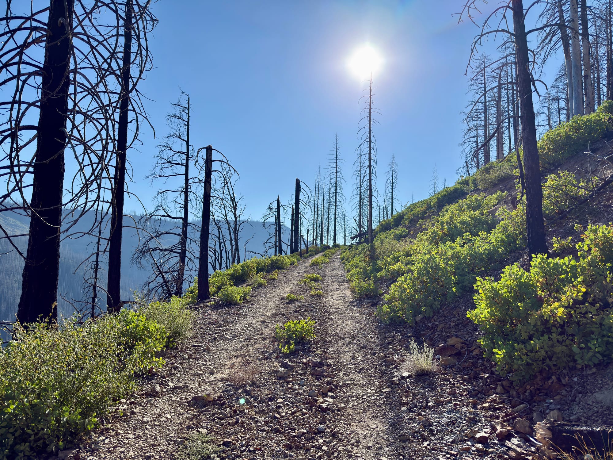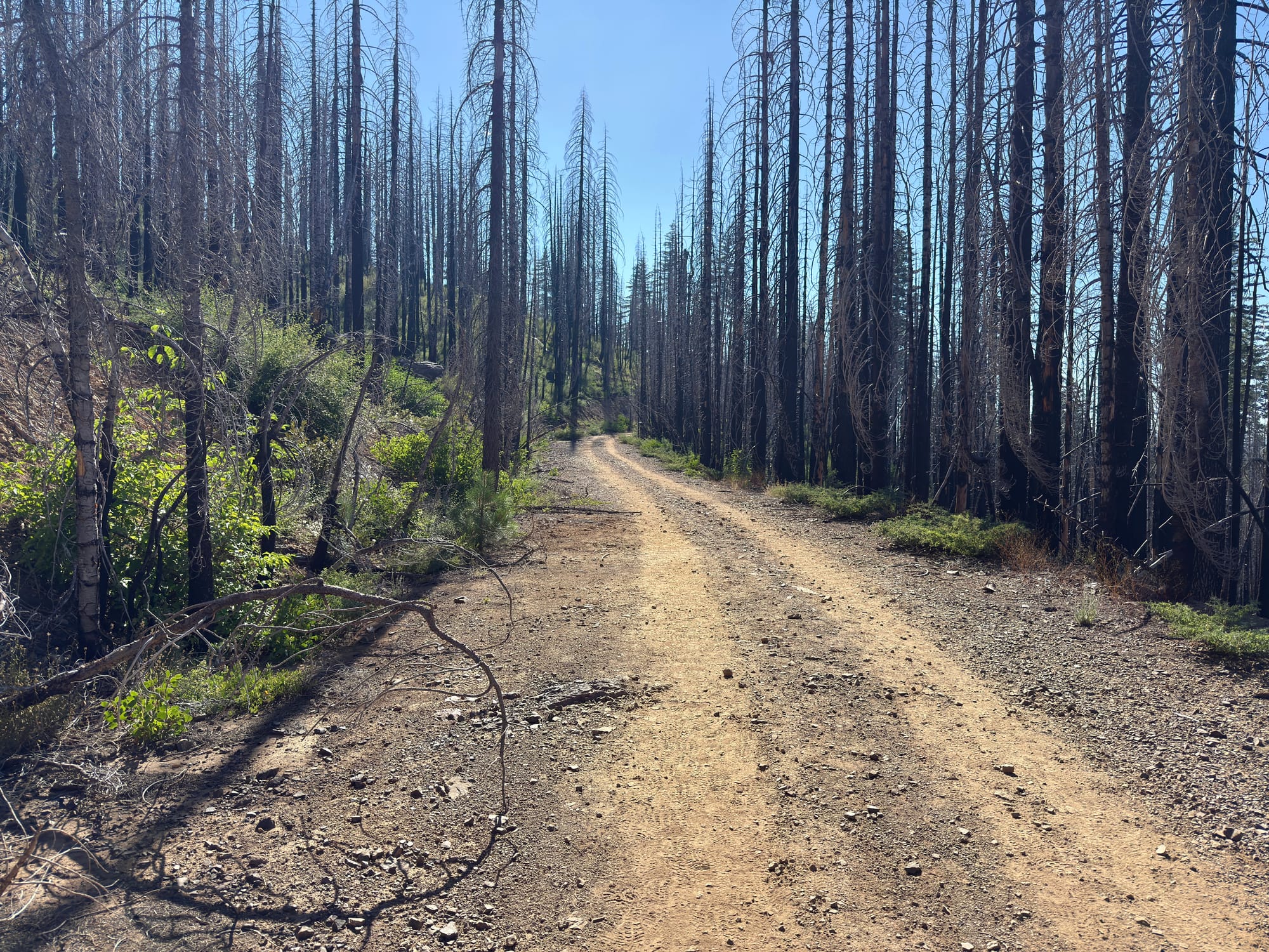 There’s not a whole lot of sun protection out here. A forest road turned into a detour around an overgrown fire ravaged blow down obstacle course.