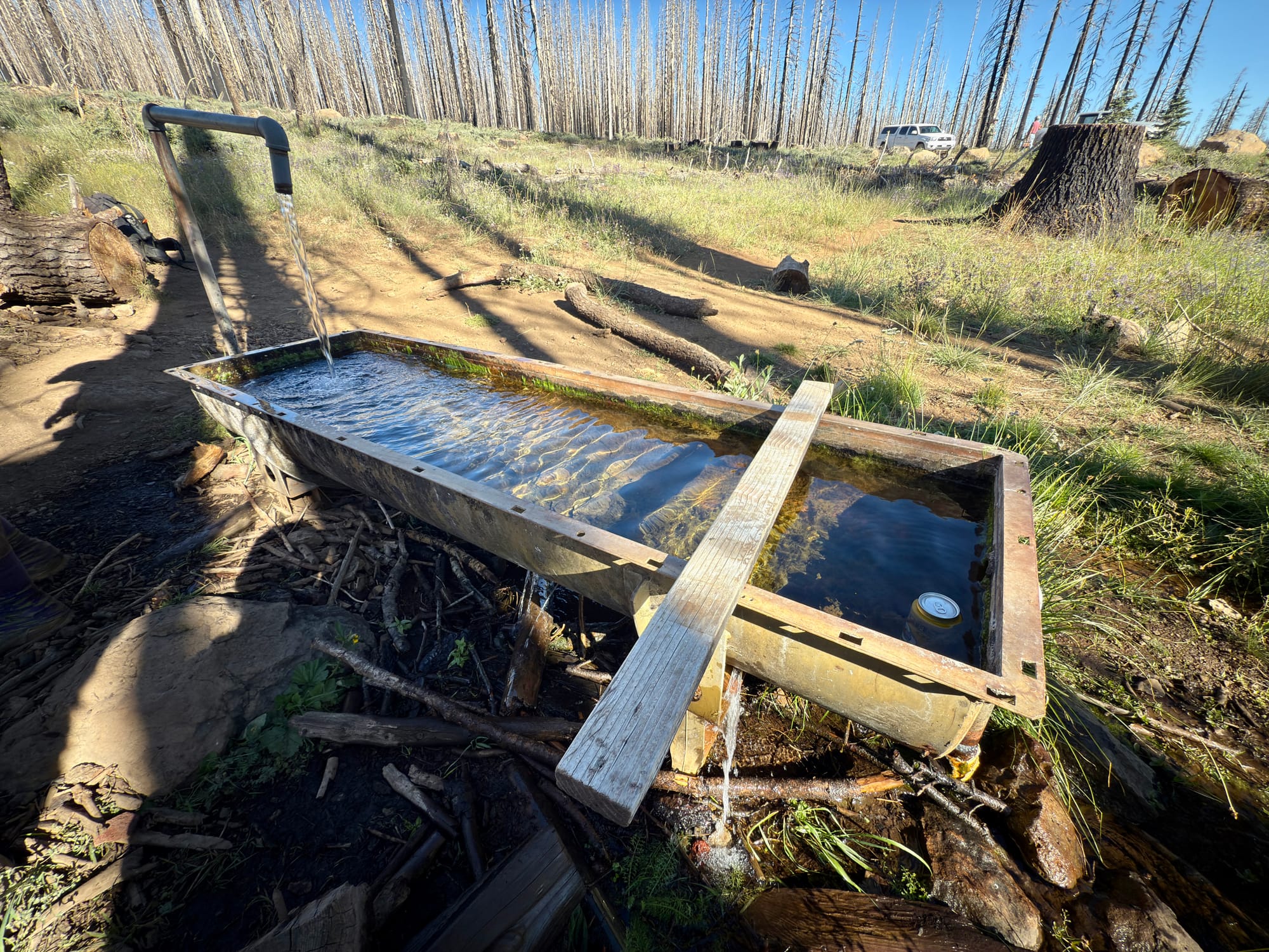 I carried a 24oz Pacifico to celebrate crossing the halfway mark on this stretch a few miles ahead, but seized the opportunity to chill it in the Cold Spring tub and crushed it after a ridiculously long hot rough day climbing through a burn zone.