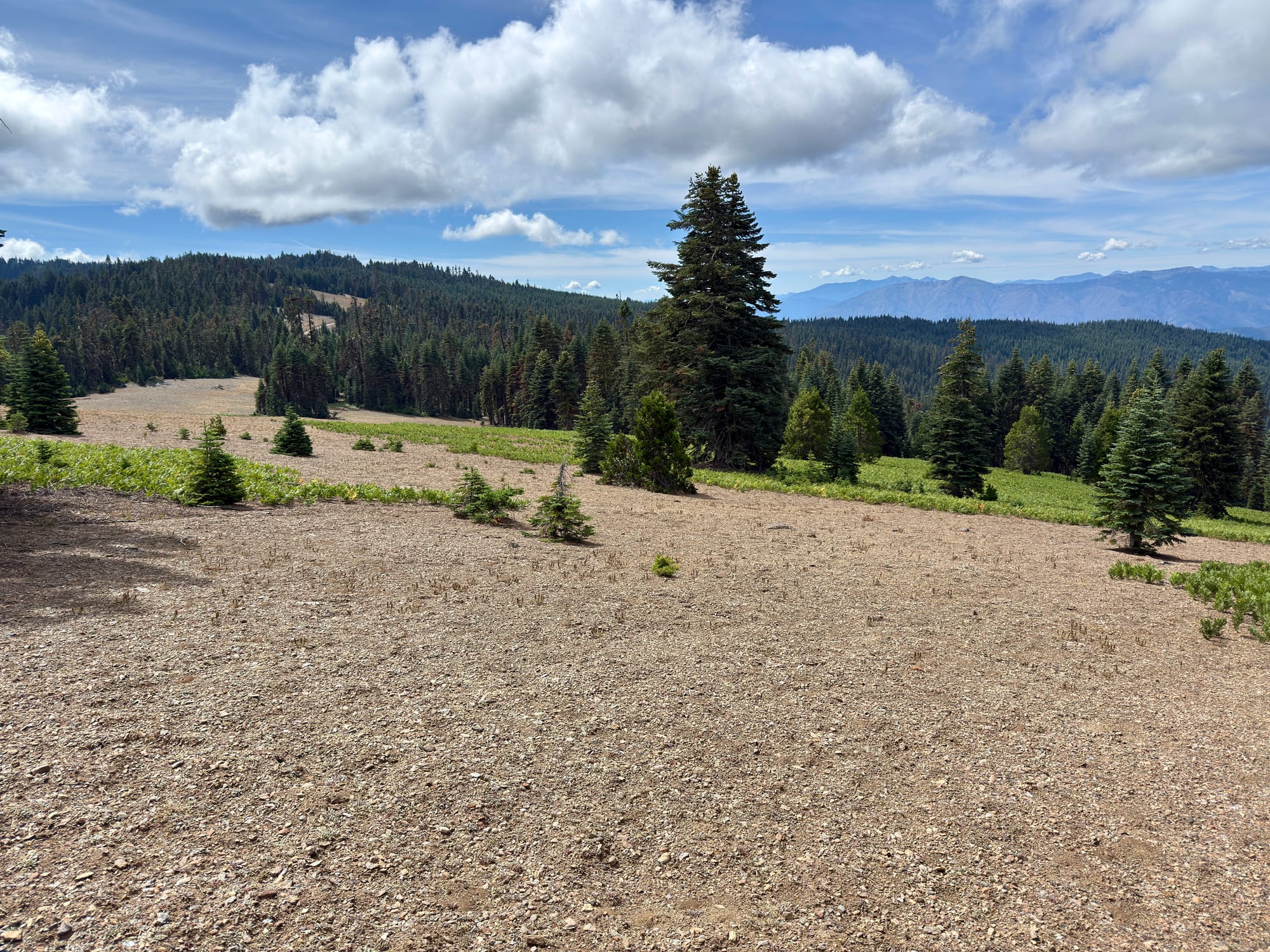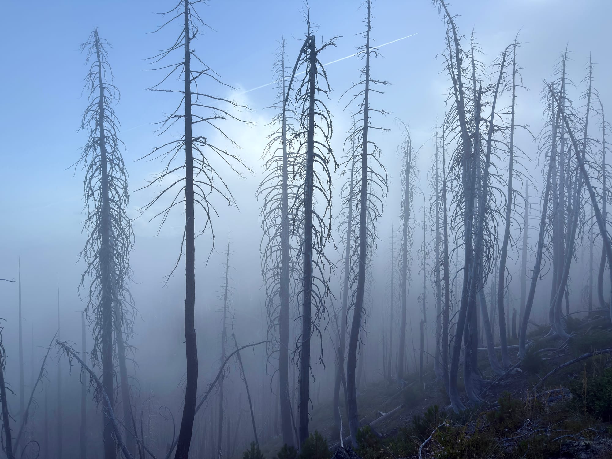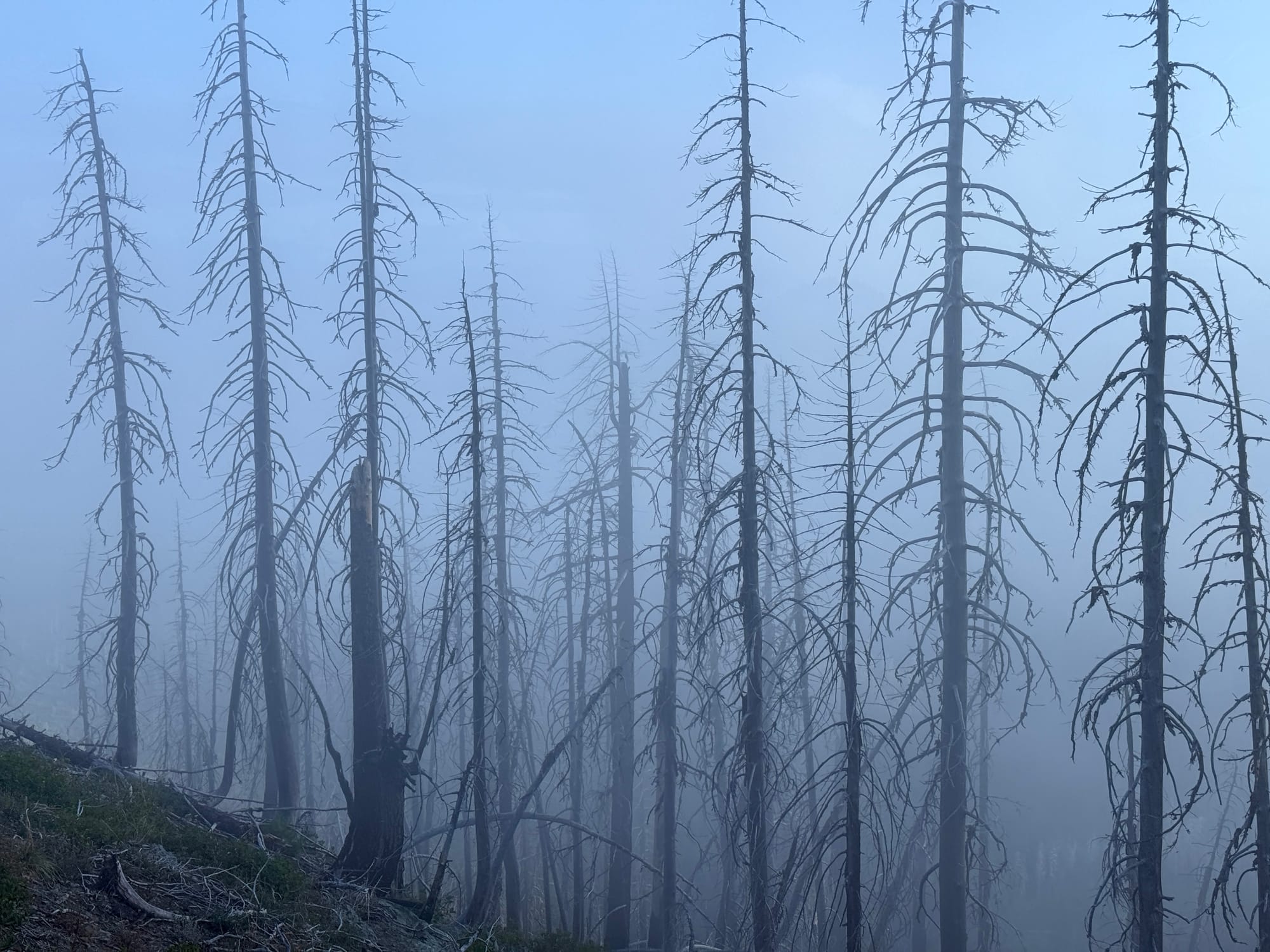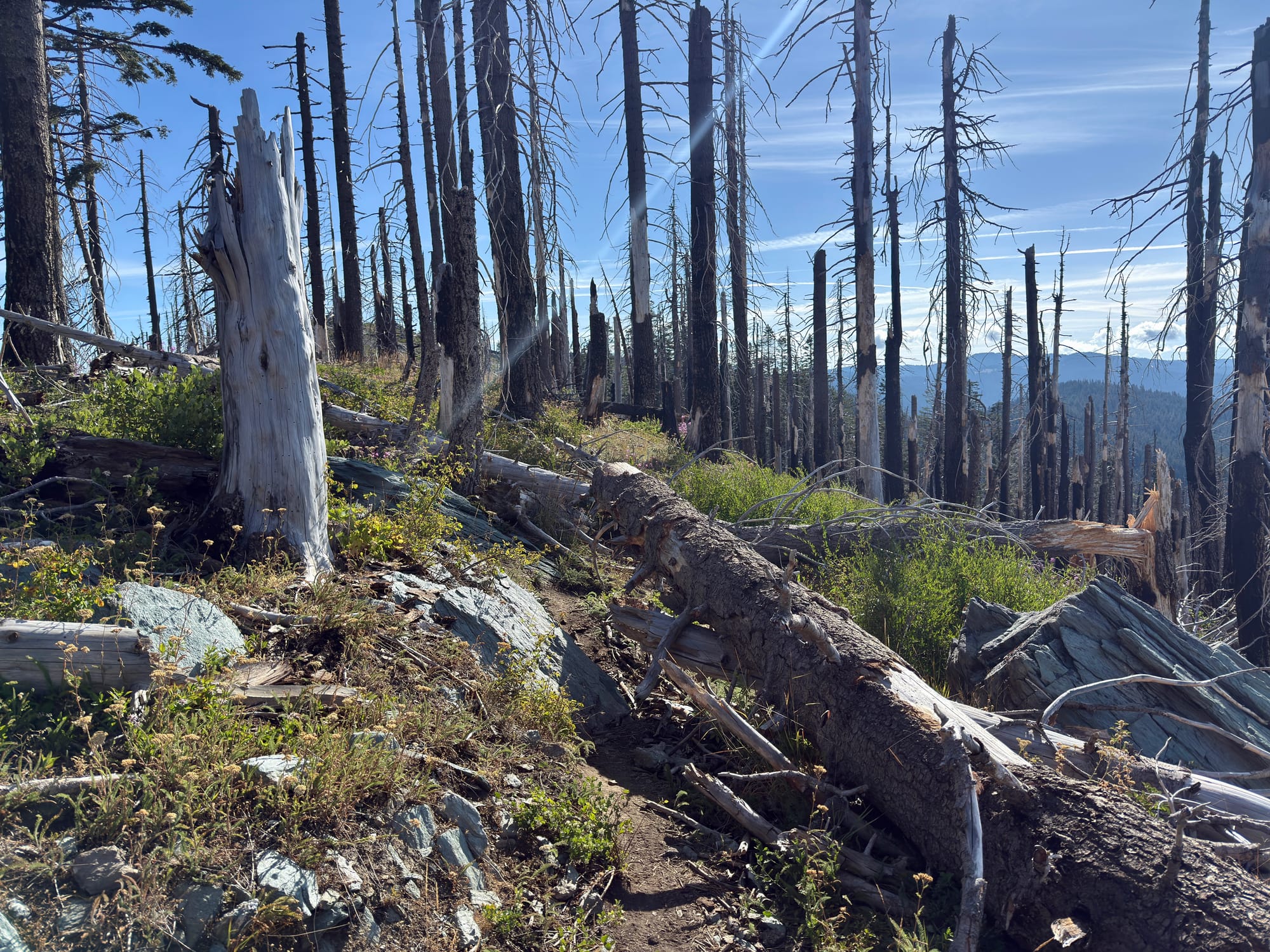 After #blowdowntown (written on a PCT placard) We eventually found live forest and clear trail.