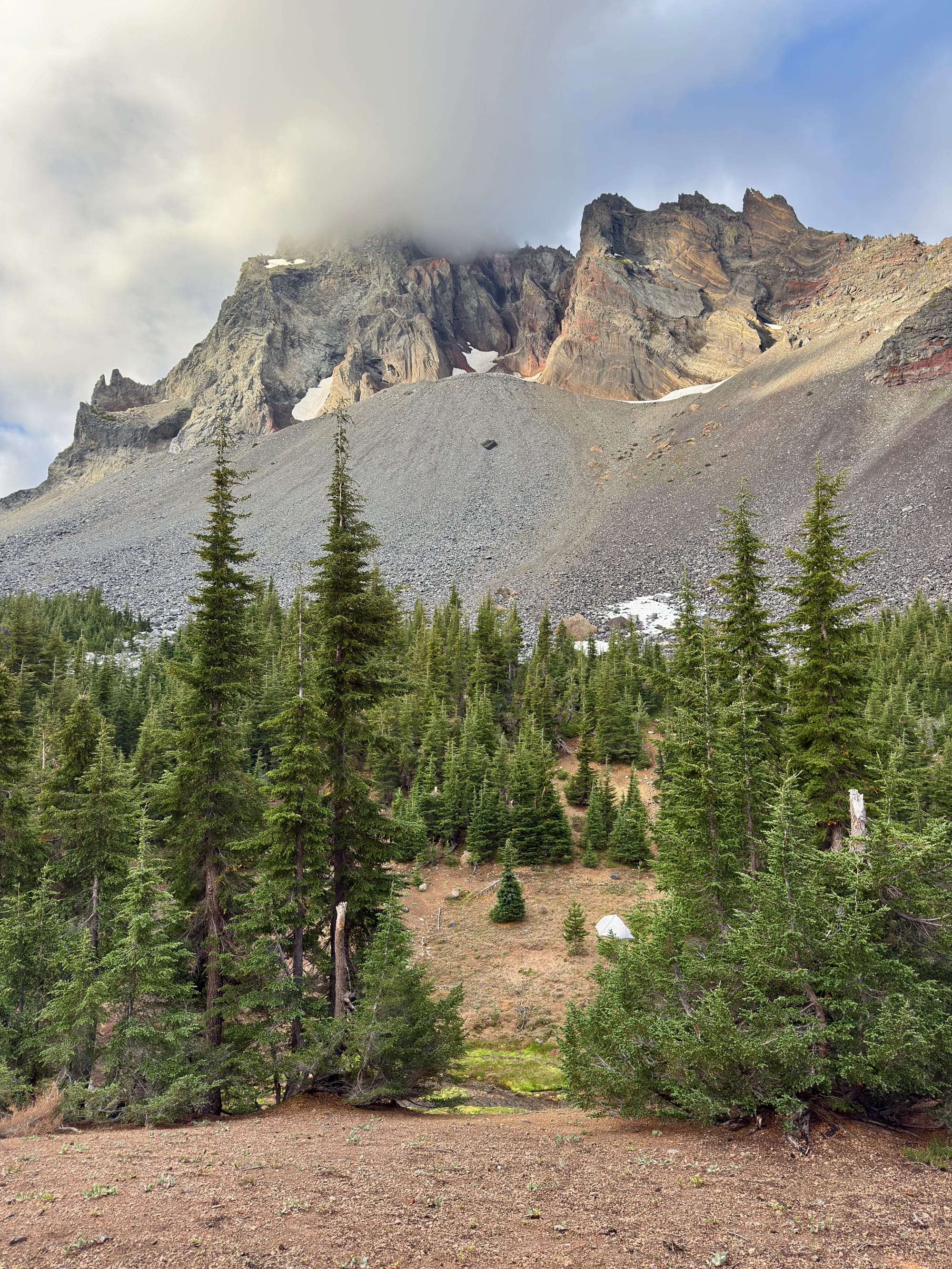We climbed up to a beautiful view of Cowhorn Mountain with a cloud sweeping across at last light and camped hoping we’d wake up dry against all odds.