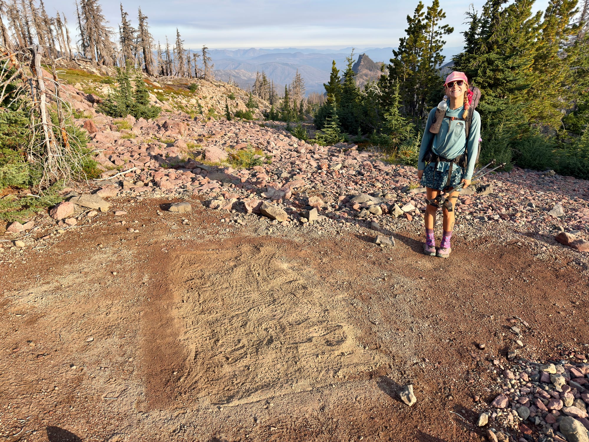 Kristin posing next to our not level tent site in a sea of volcanic rock. We attempted to level it a bit but wound up underestimating the size of the tent footprint and I wound up sleeping directly on the incline leading down to the flat spot we prepared.