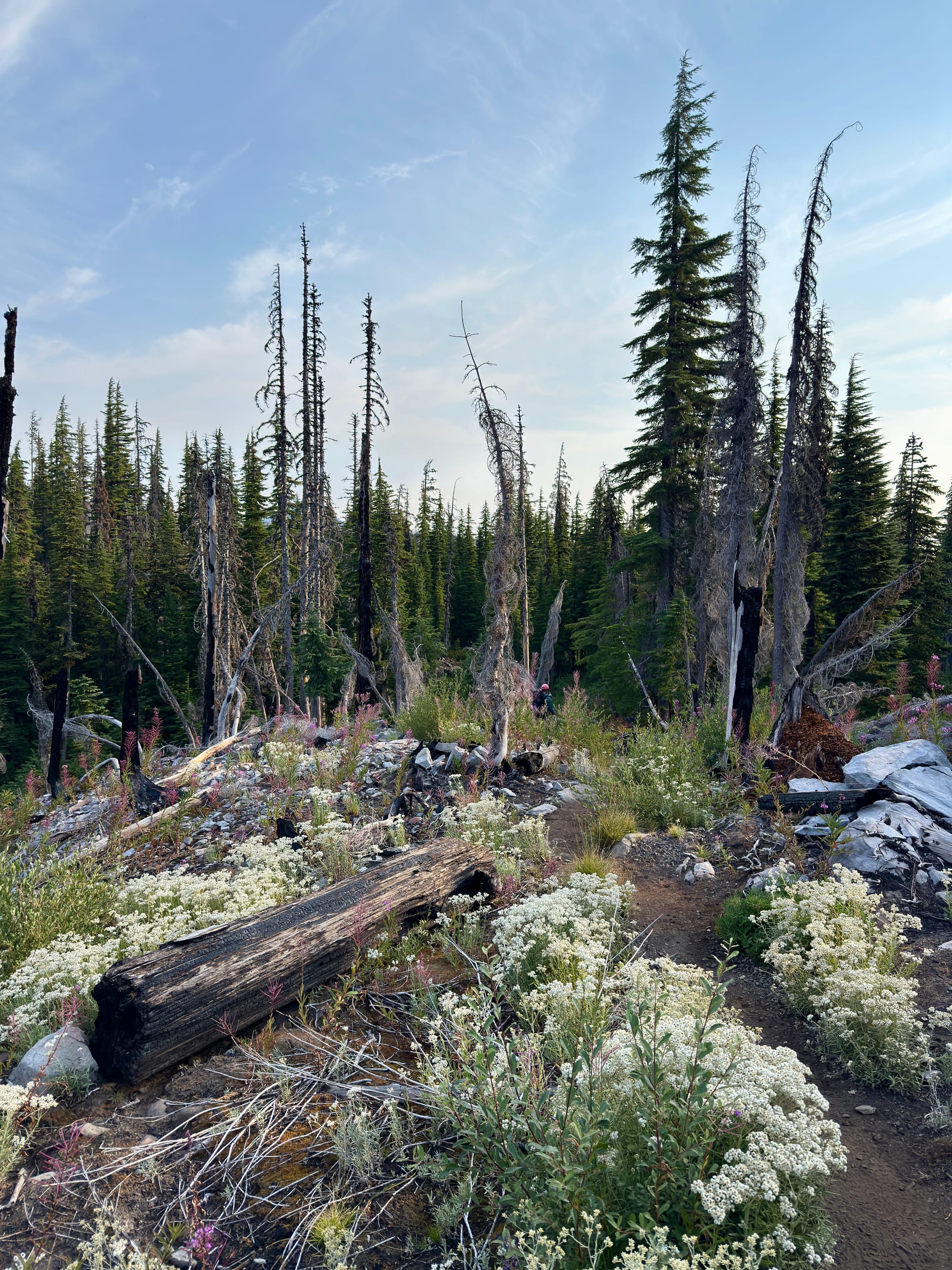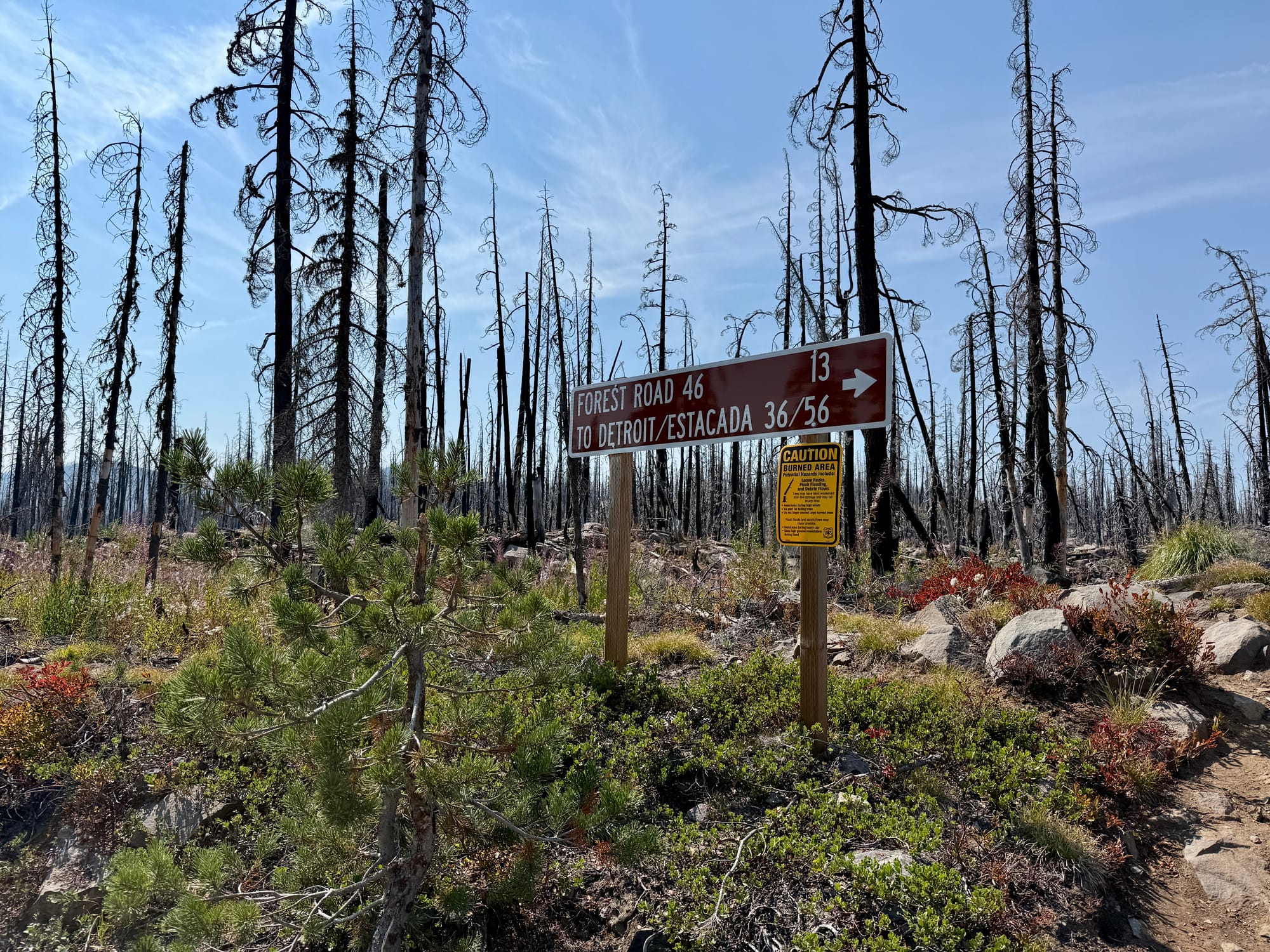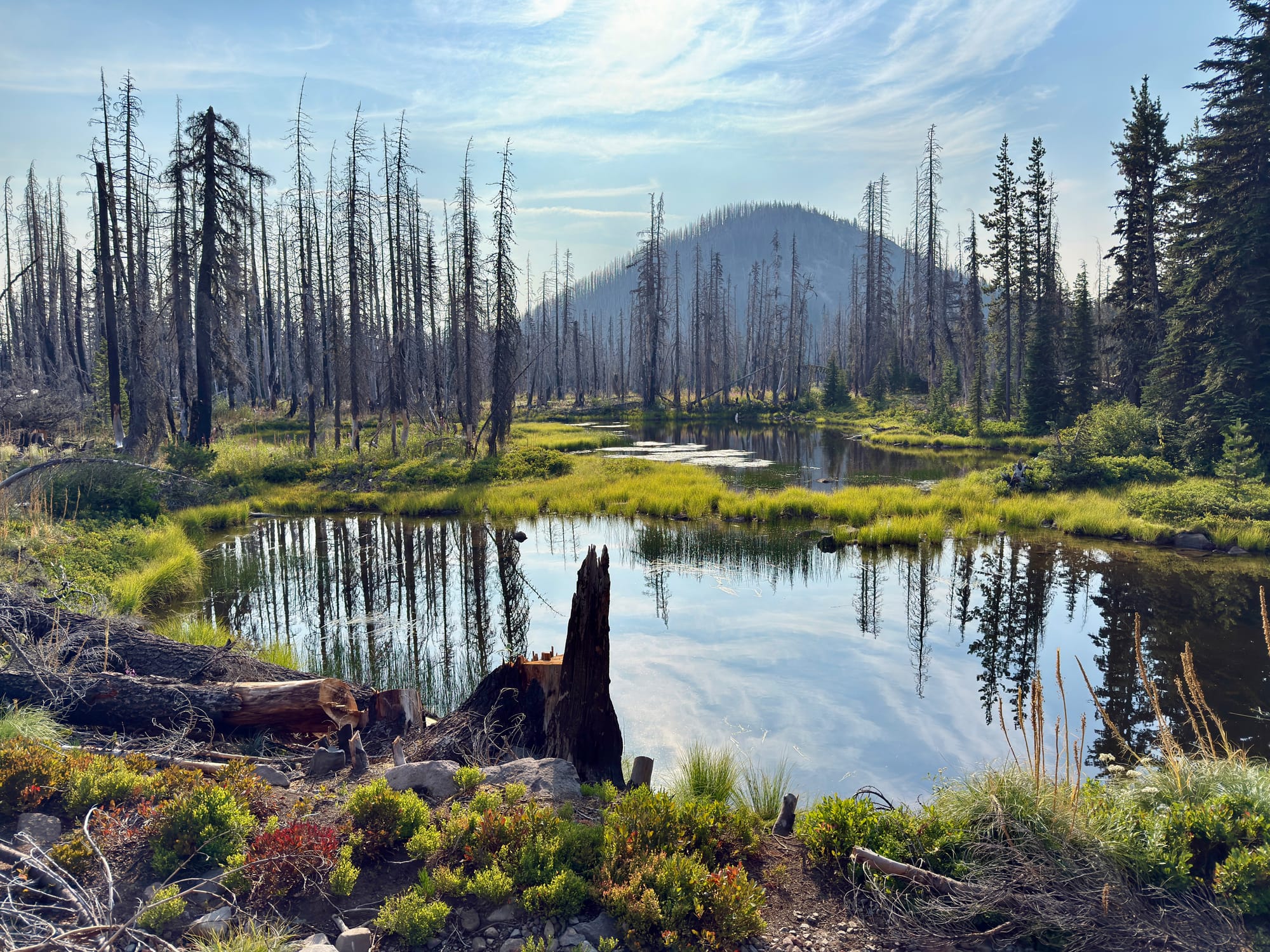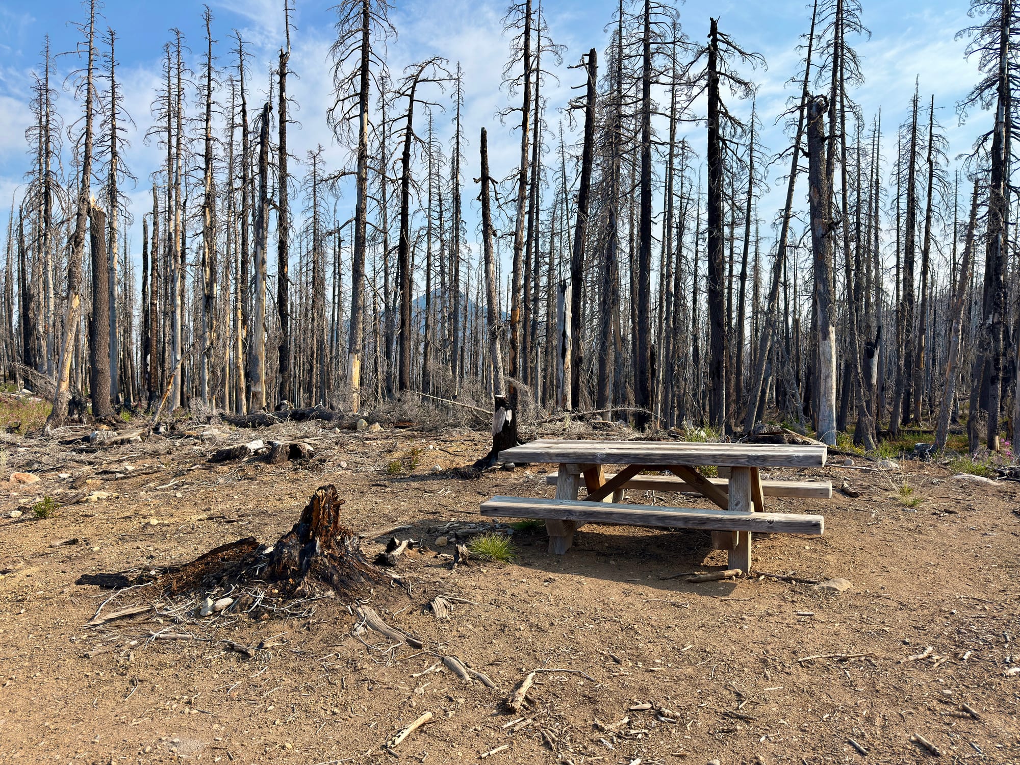 The Olallie Lake area was scorched by the Lionshead fire in 2020. We sort of knew what to expect after chatting with an older gentleman taking a rest on a log on the side of the trail a few dozen miles back. I asked him about his Olallie Lake baseball cap and he almost immediately teared up reminiscing about the wildfire damage wrought on his favorite place that he had visited every summer since childhood.