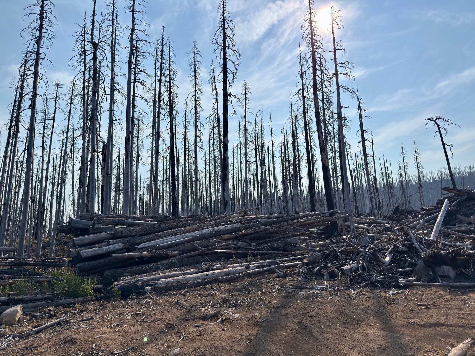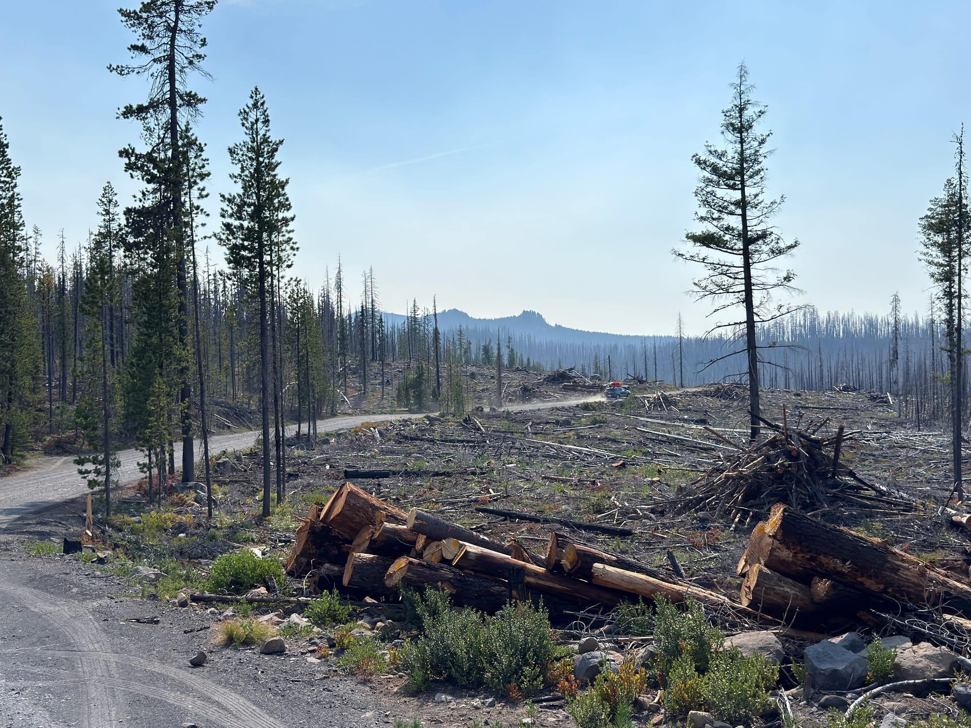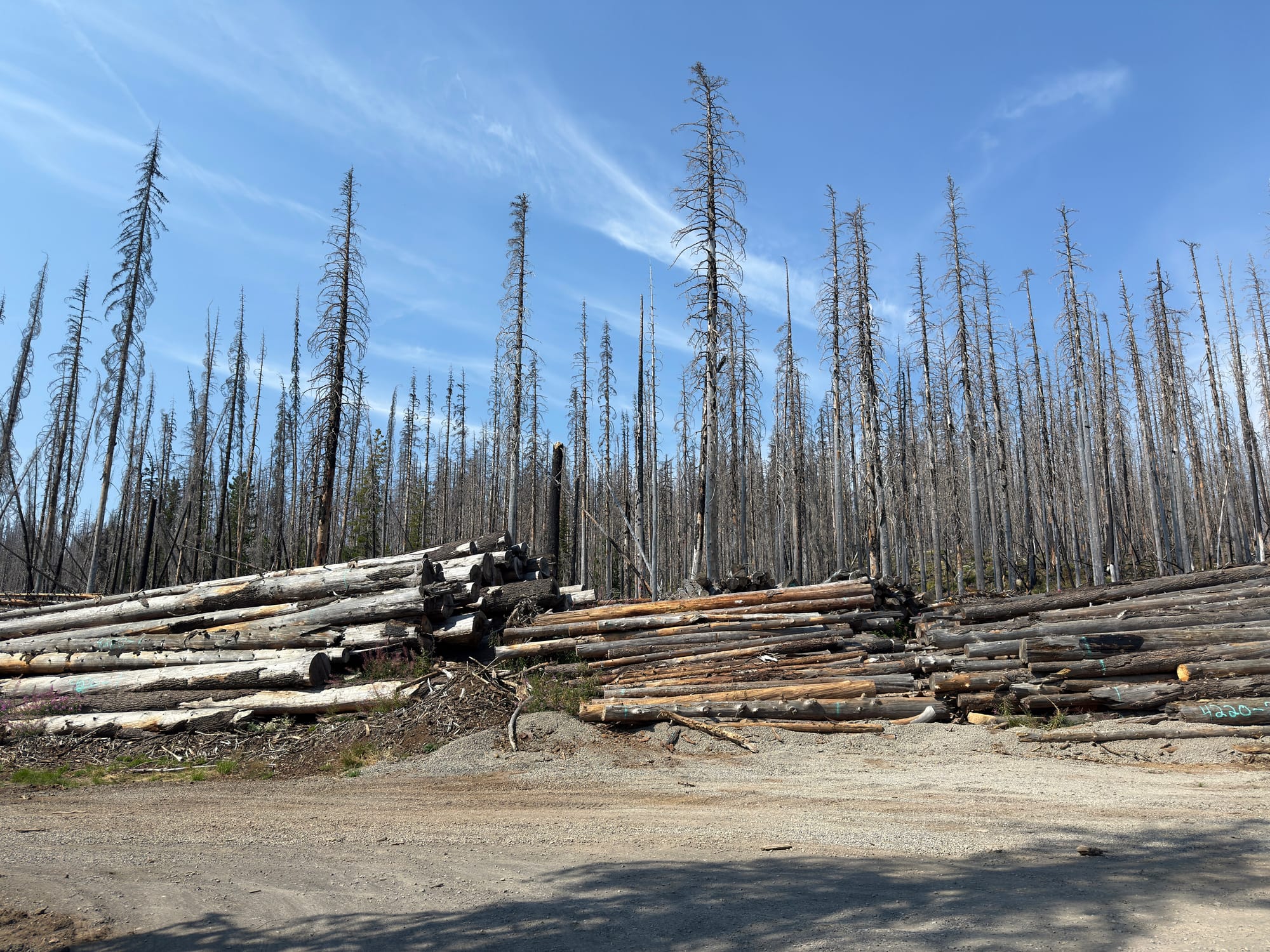 We talked to a two-person crew of people clearing and salvaging lumber from burned trees near the road. They mentioned that they rarely get contracts for preventative thinning of forests, and instead get called for labor intensive and time sensitive post-fire cleanup.