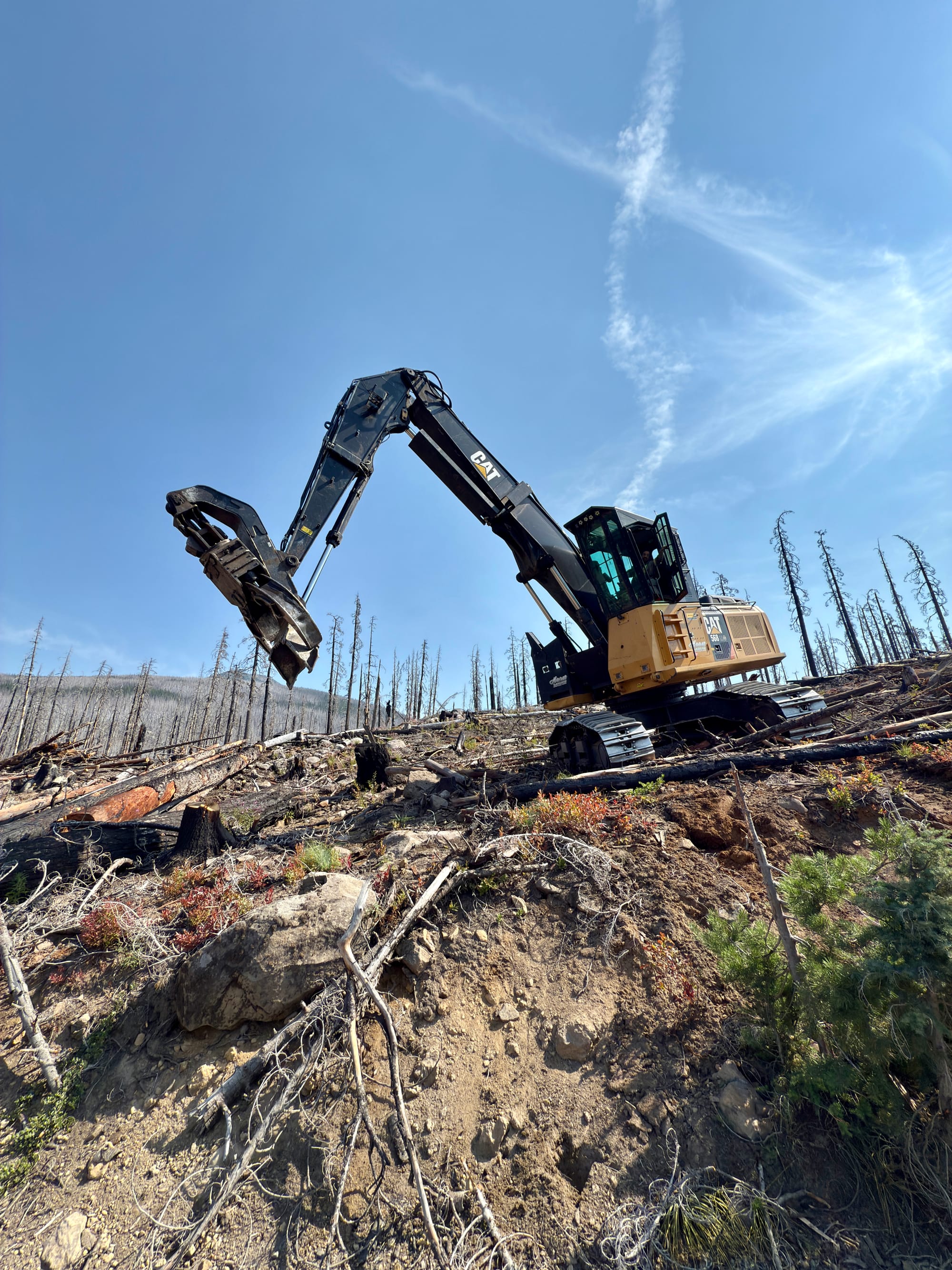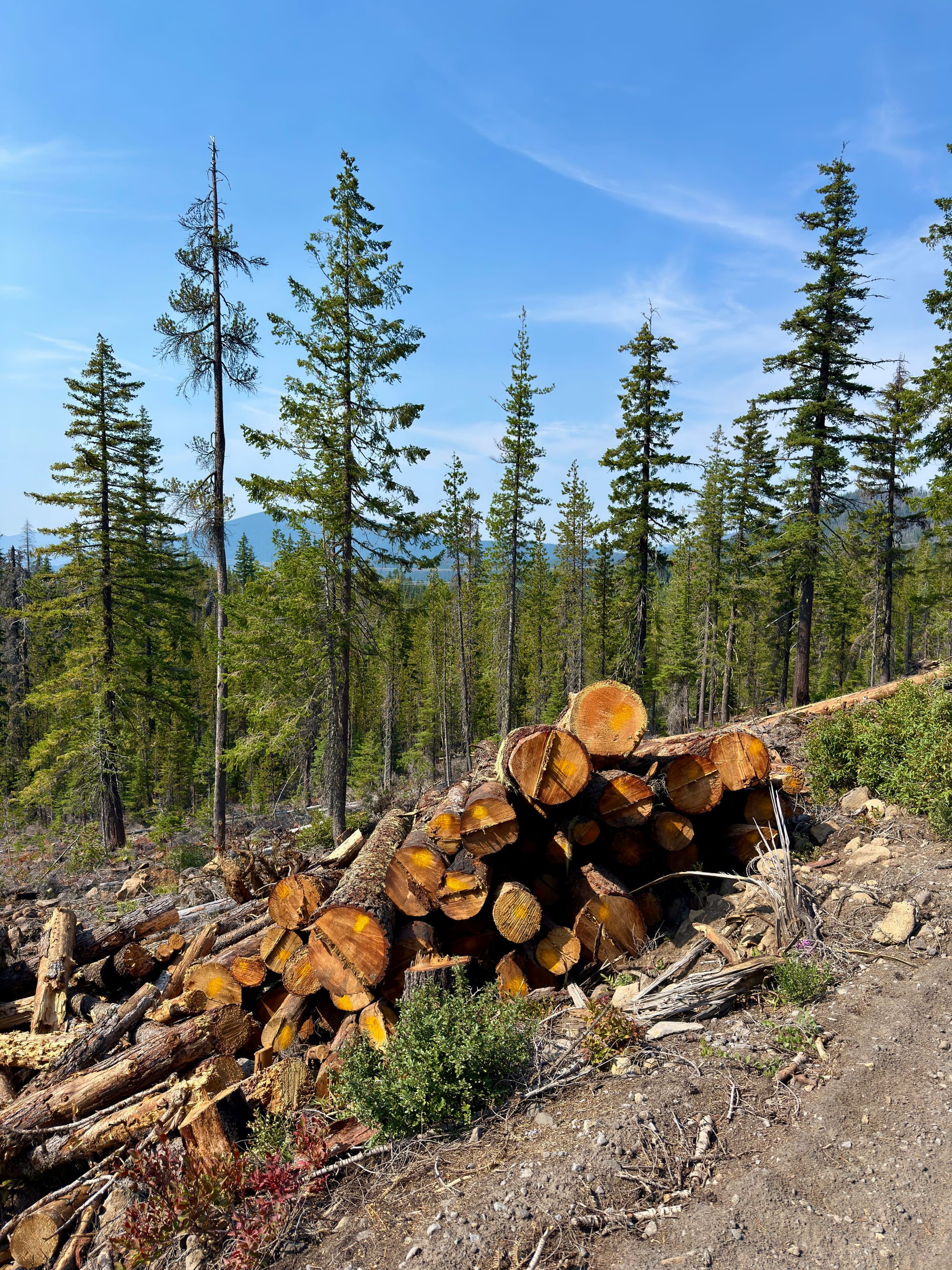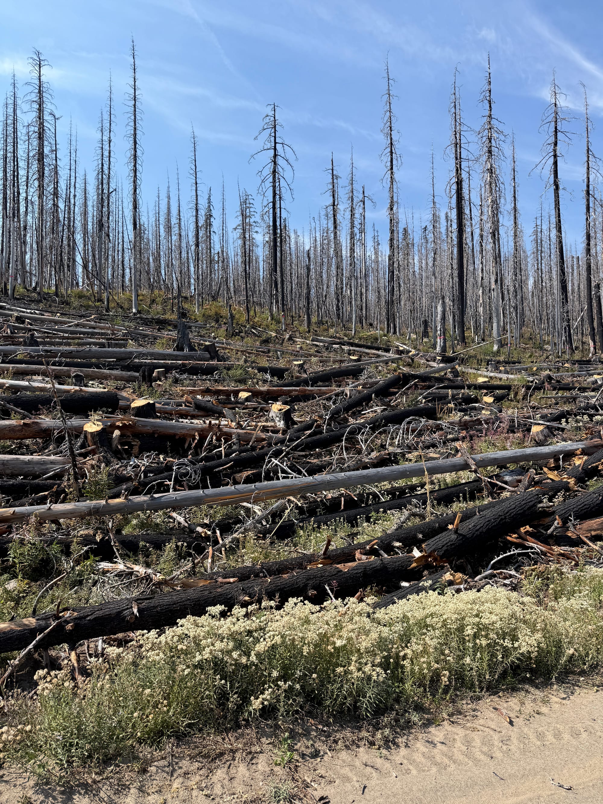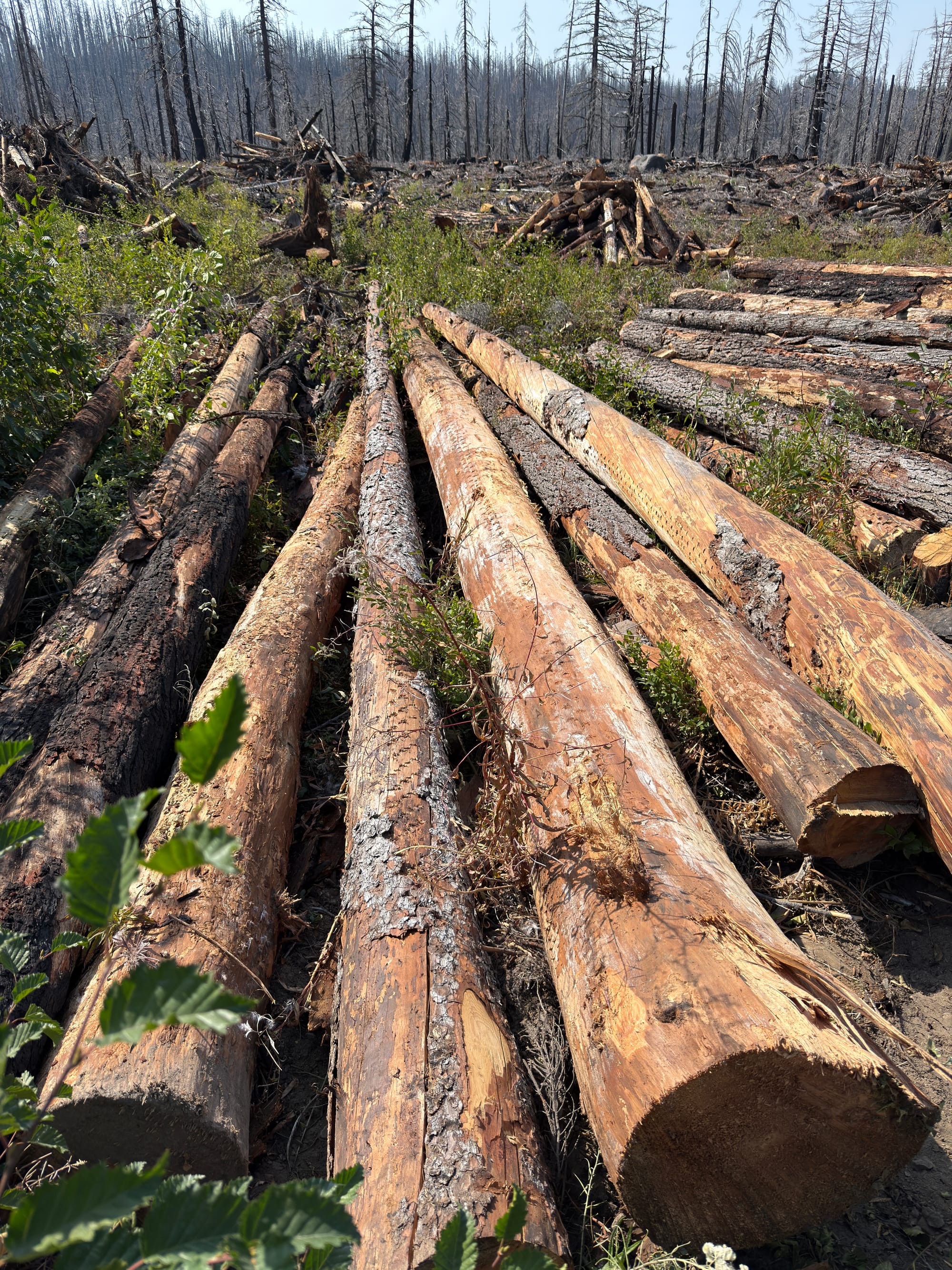 We talked to a two-person crew of people clearing and salvaging lumber from burned trees near the road. They mentioned that they rarely get contracts for preventative thinning of forests, and instead get called for labor intensive and time sensitive post-fire cleanup.