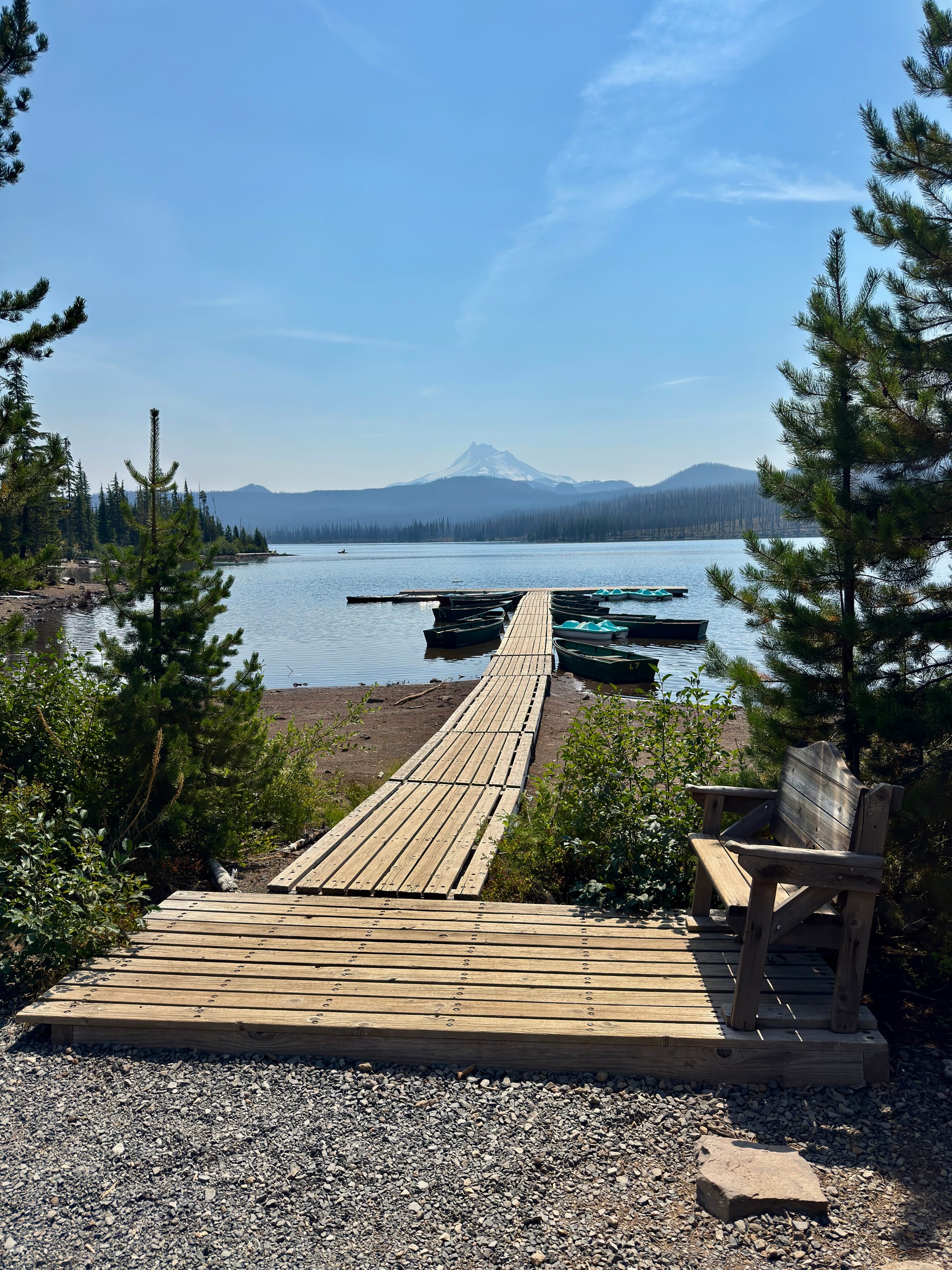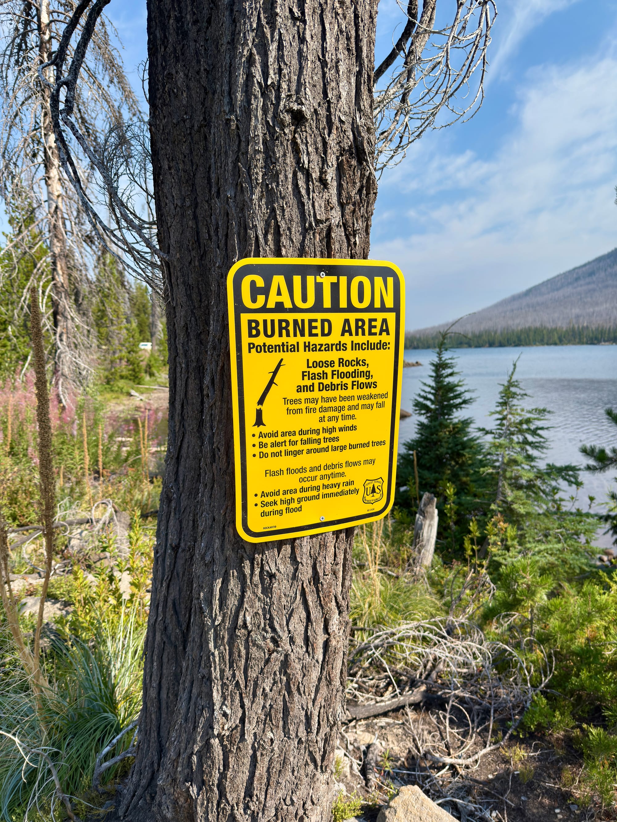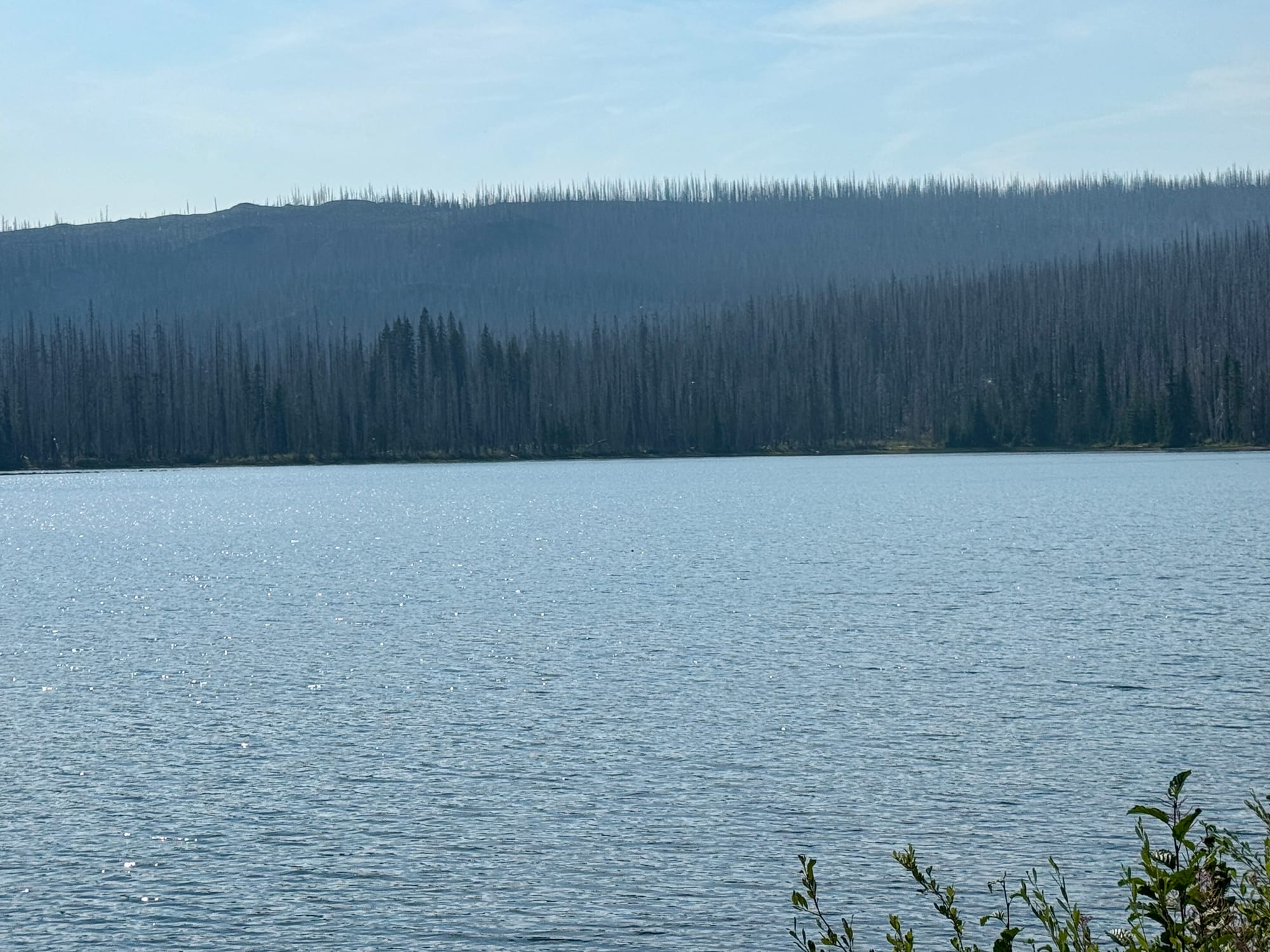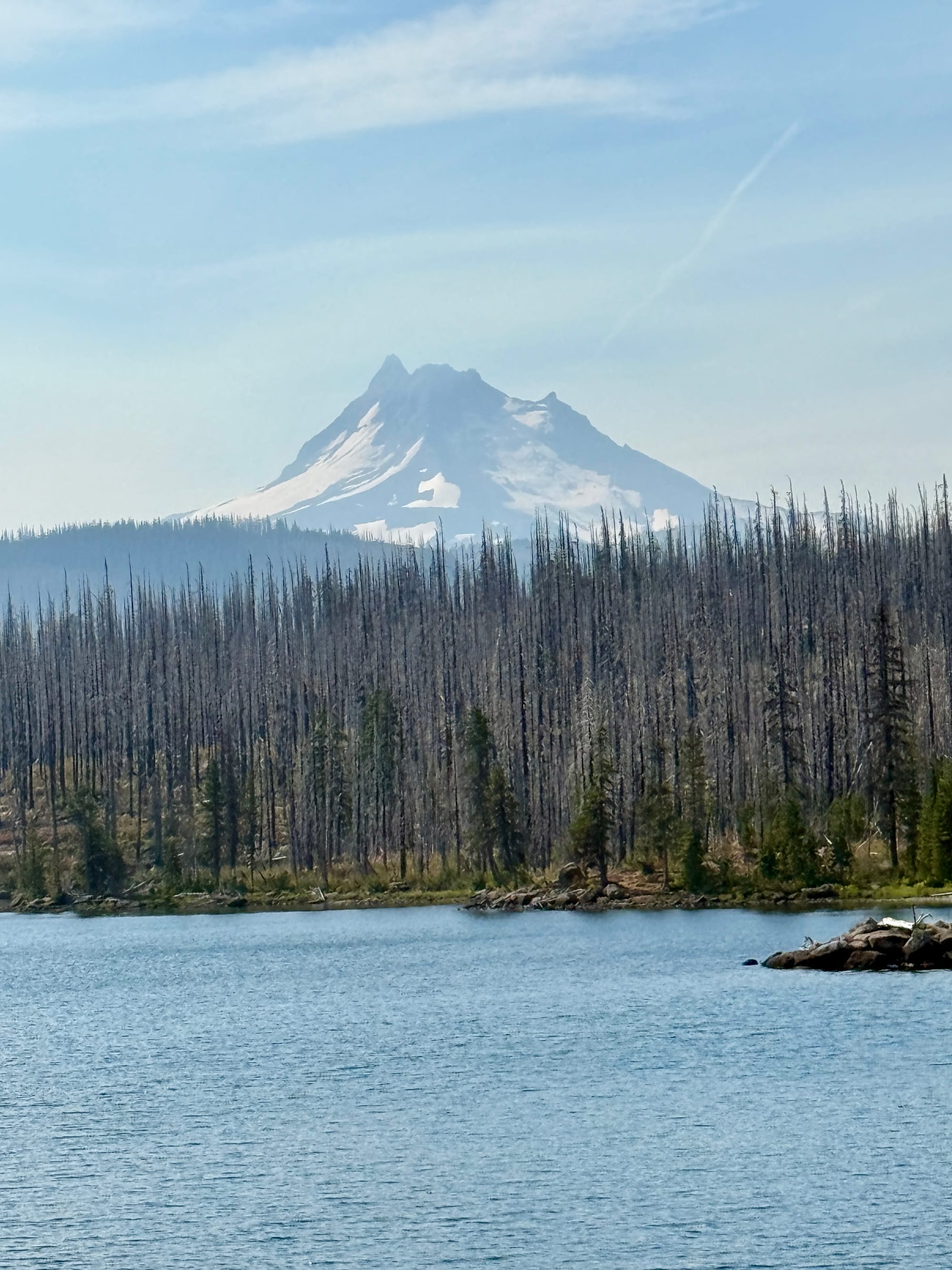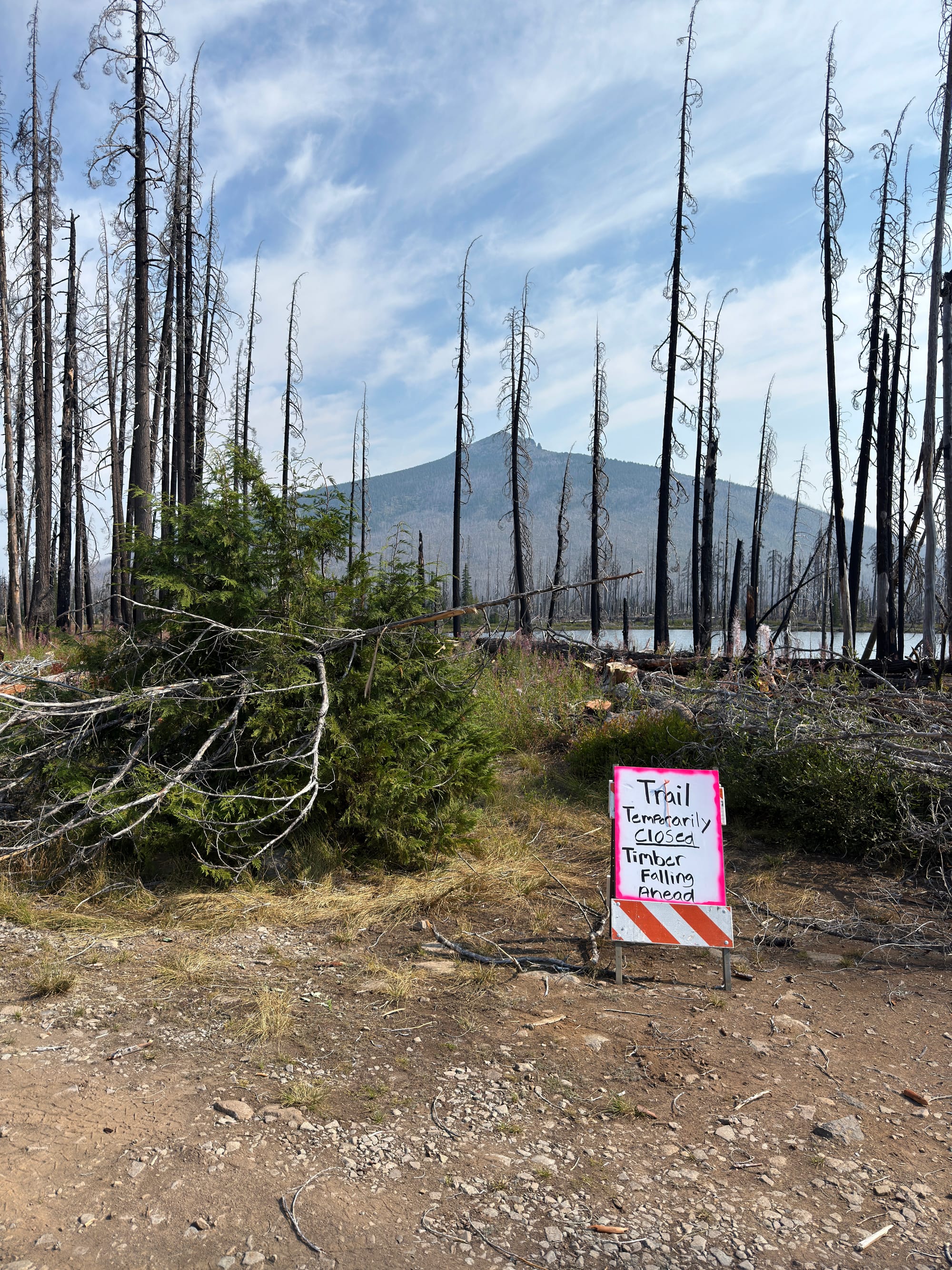A small crew was out felling burned trees from the waterfront road and trail surrounding Olallie Lake. They stopped their chainsaws as we walked through. A tree felled immediately after we were clear made the loudest thump I’ve ever heard. Thwack!