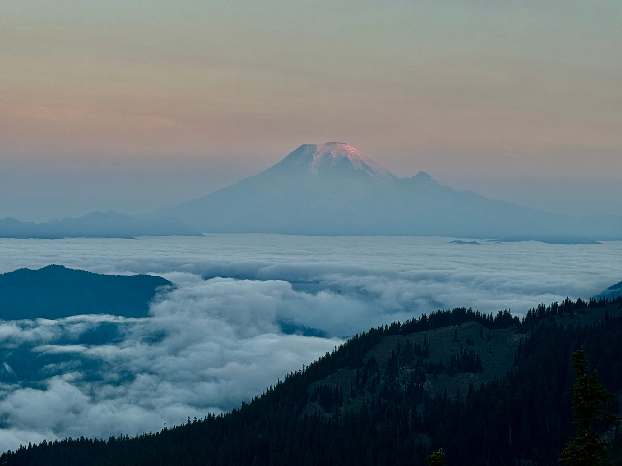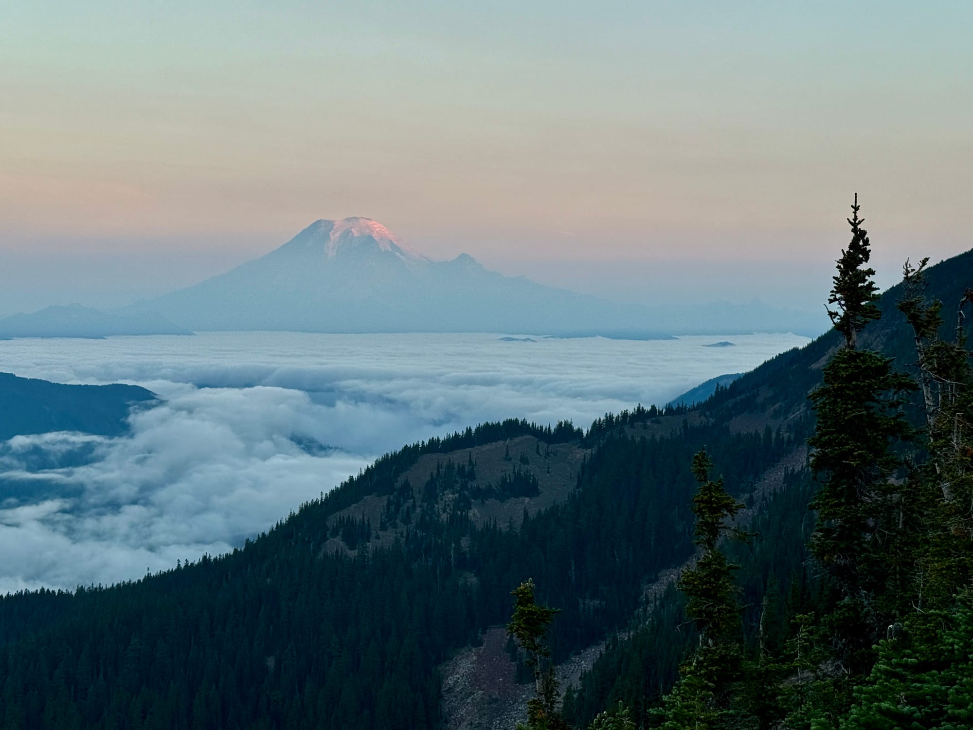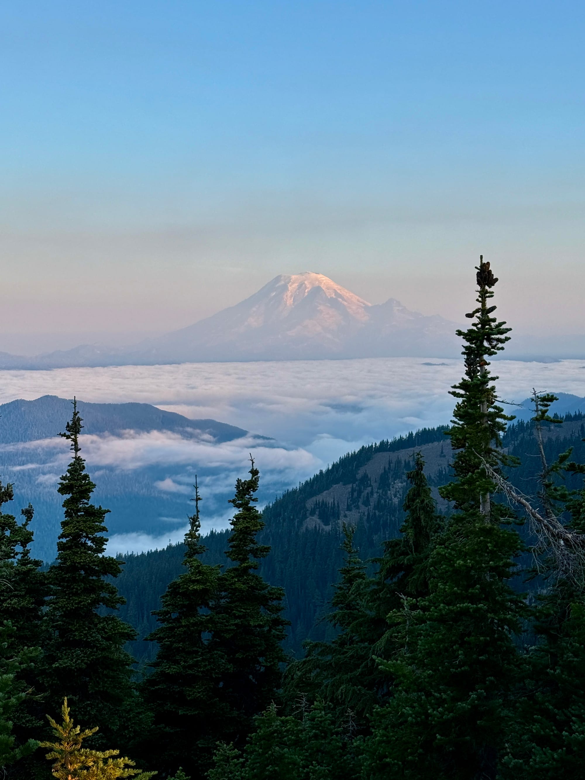 Our gamble on the weather and views clearing up in the morning paid off. Mount Rainier in soft morning light in the distance and Shoe Lake (which we couldn’t see while setting up in a cloud) below.