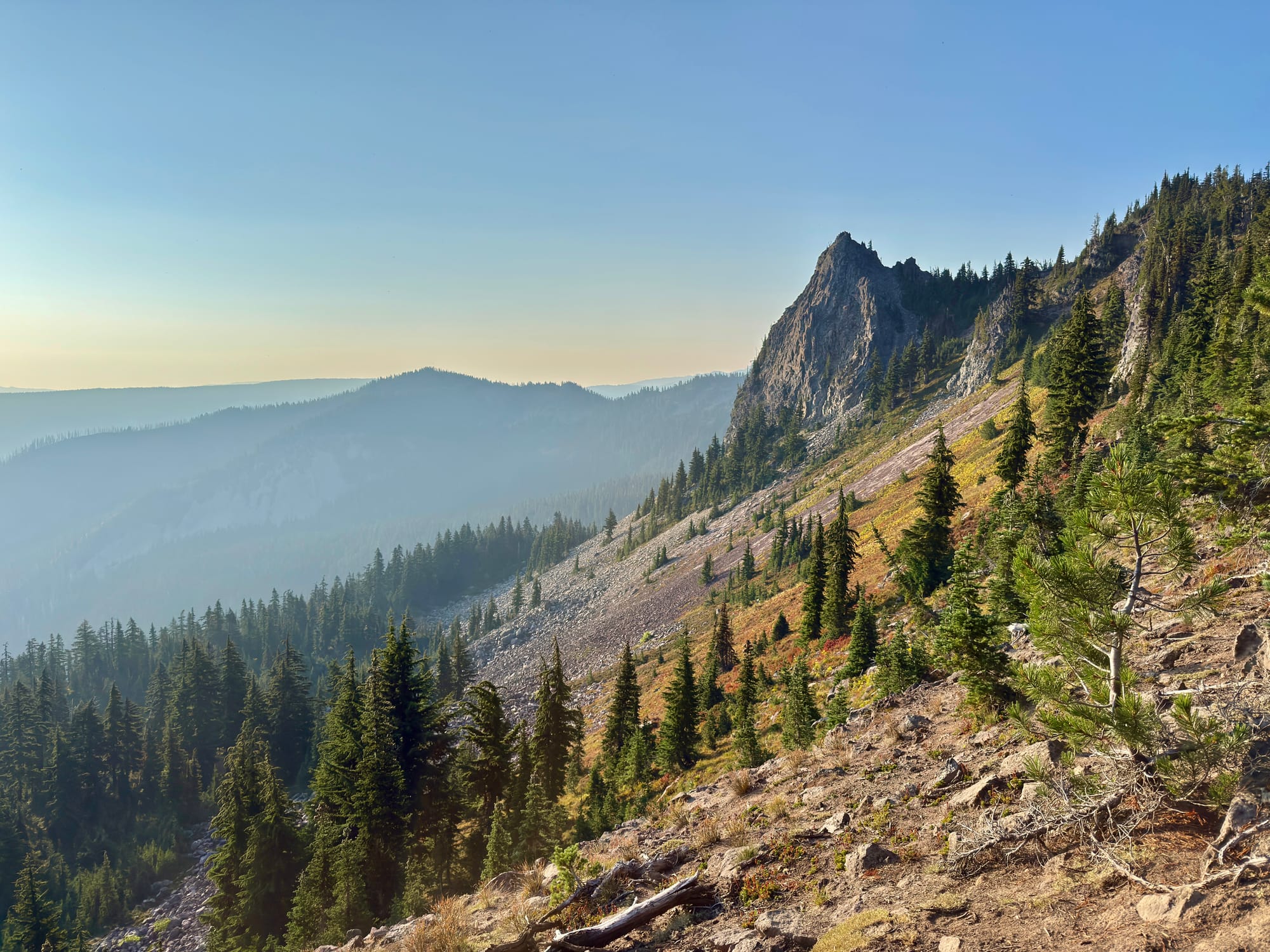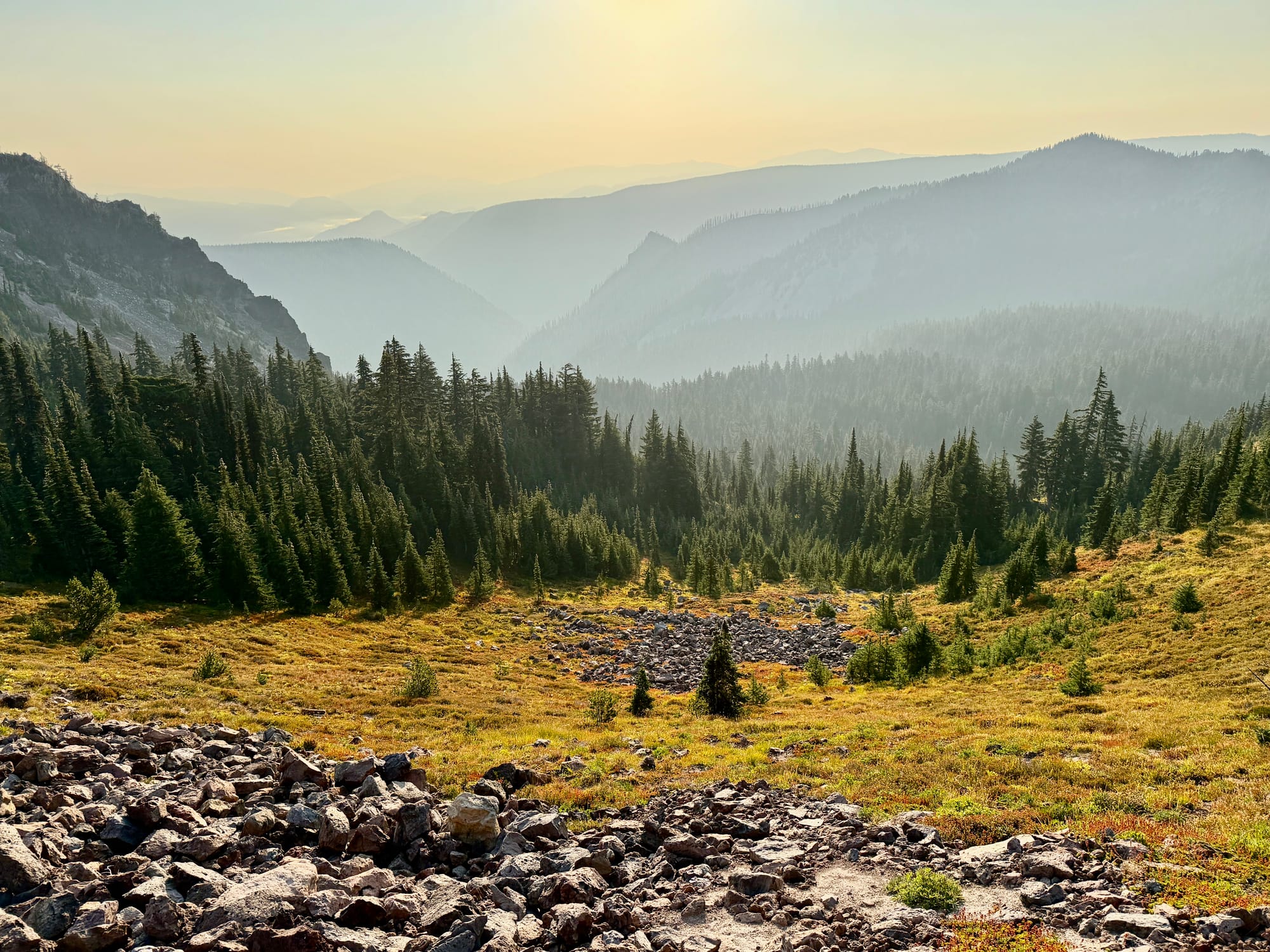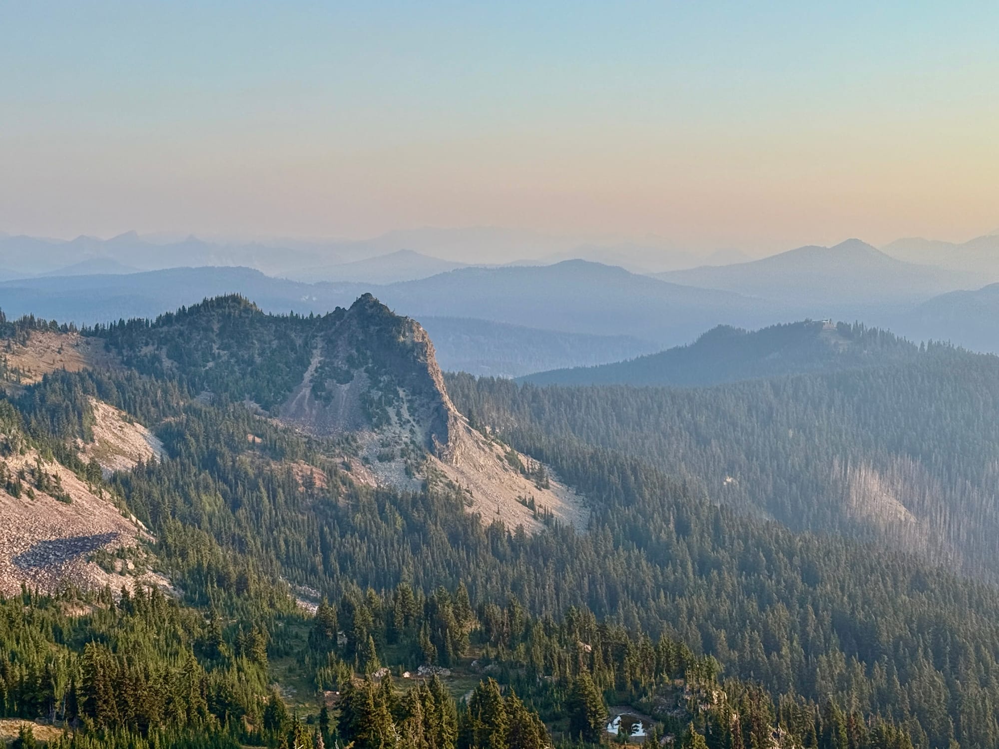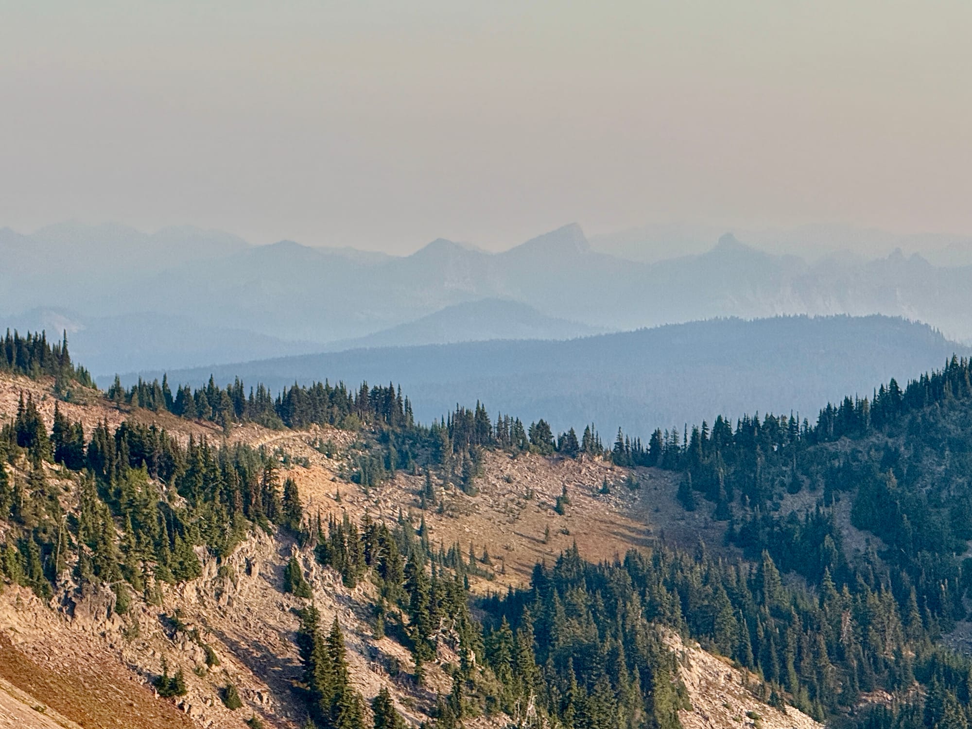 Haze from the remote Wildcat fire to the northwest. We have a business decision to make a White Pass - hike or drive around a Forest Service issued fire closure that closes off 10 miles of the PCT west of the Wildcat Fire.