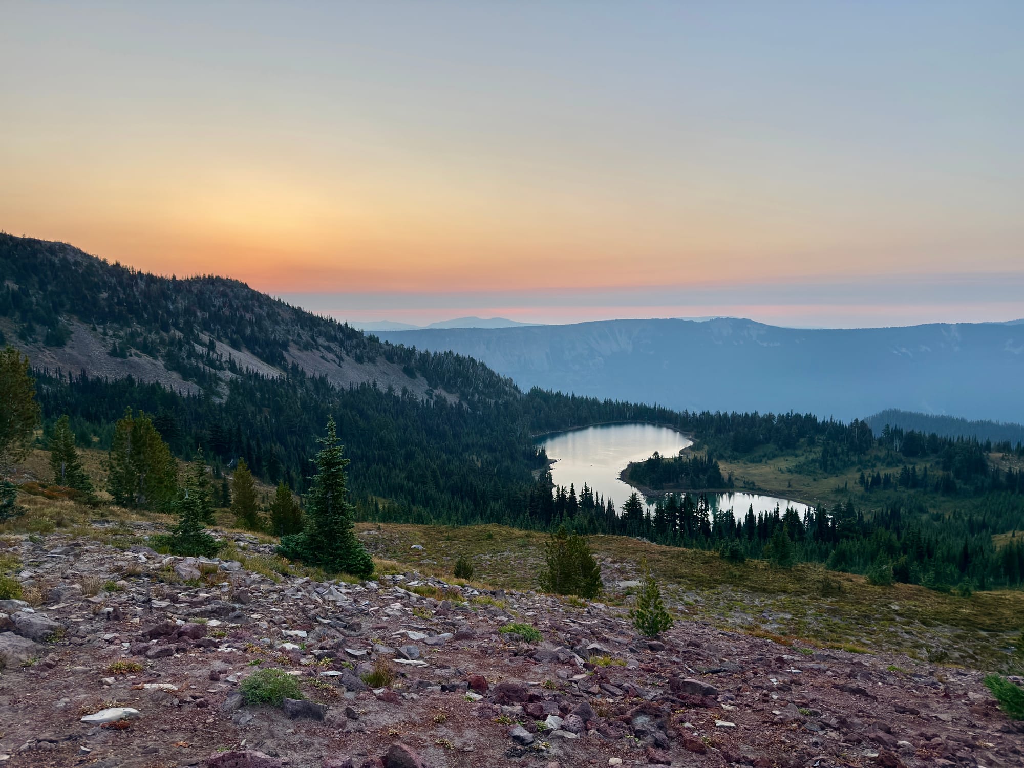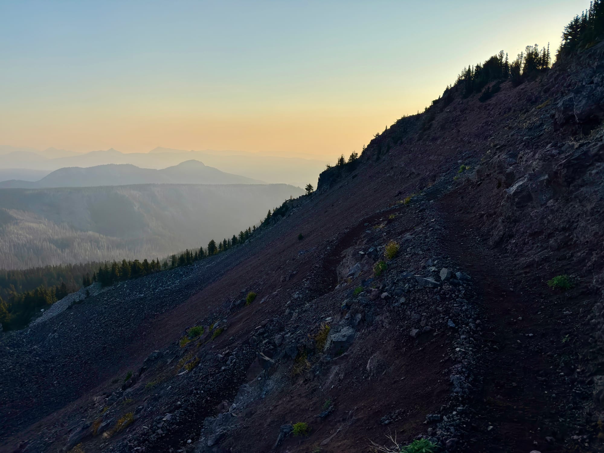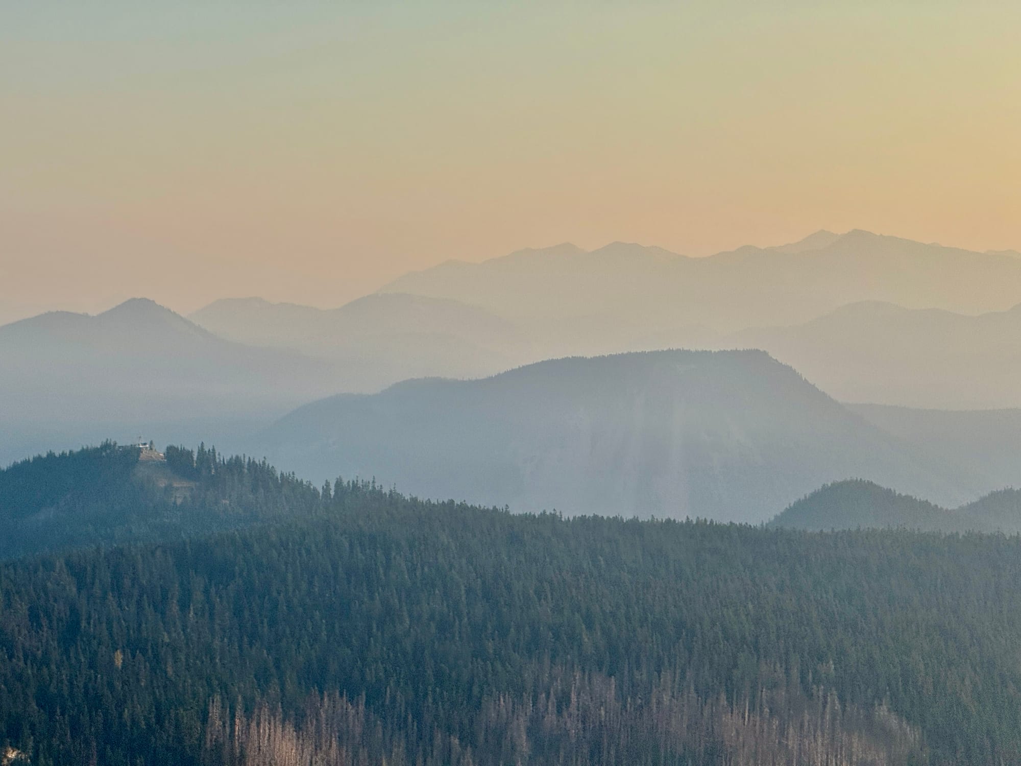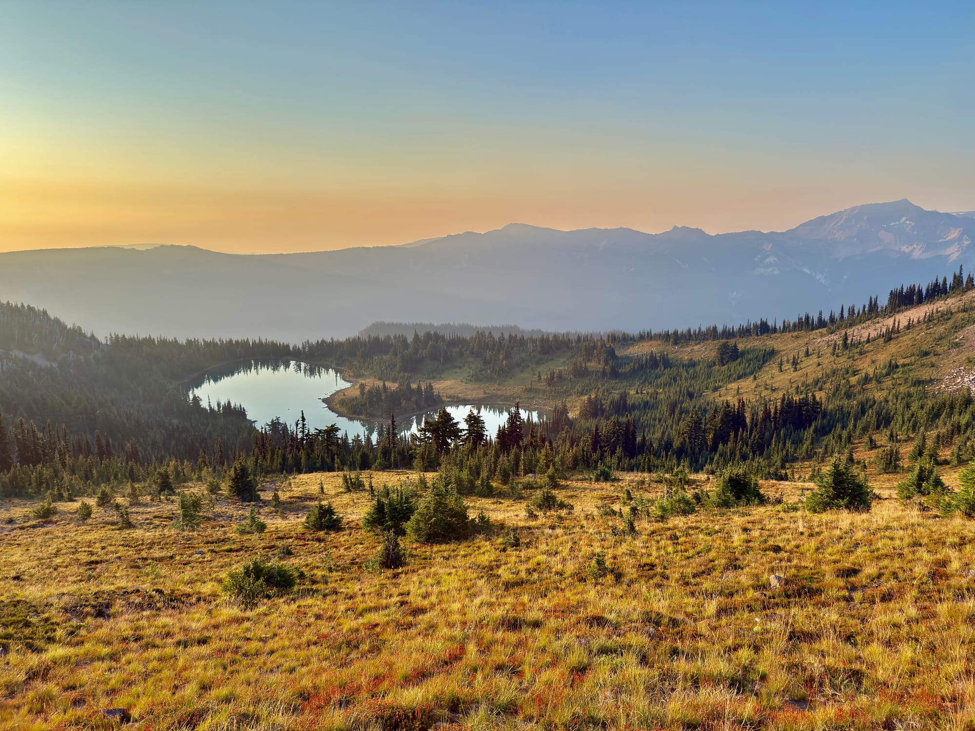 Haze from the remote Wildcat fire to the northwest. We have a business decision to make a White Pass - hike or drive around a Forest Service issued fire closure that closes off 10 miles of the PCT west of the Wildcat Fire.