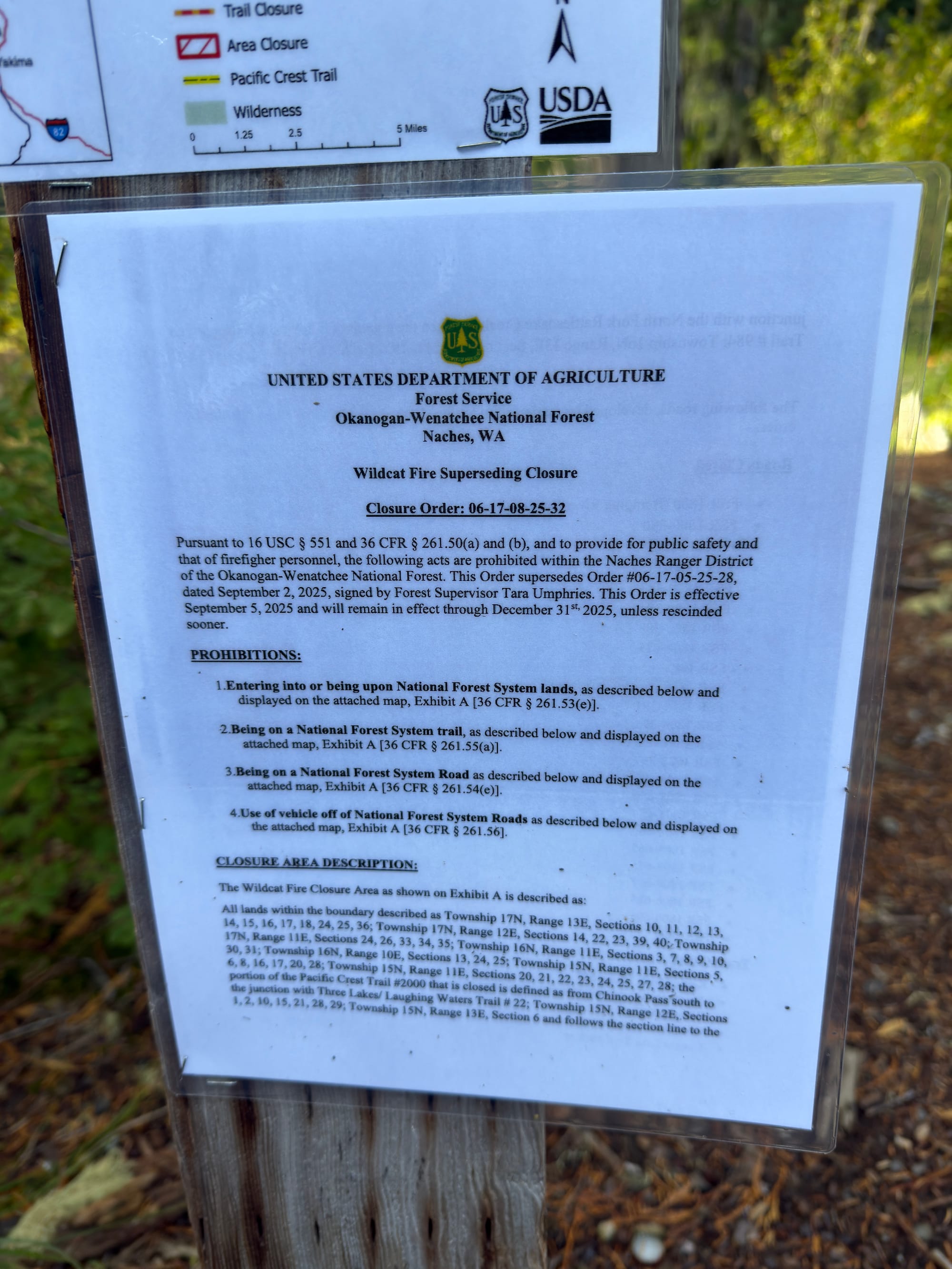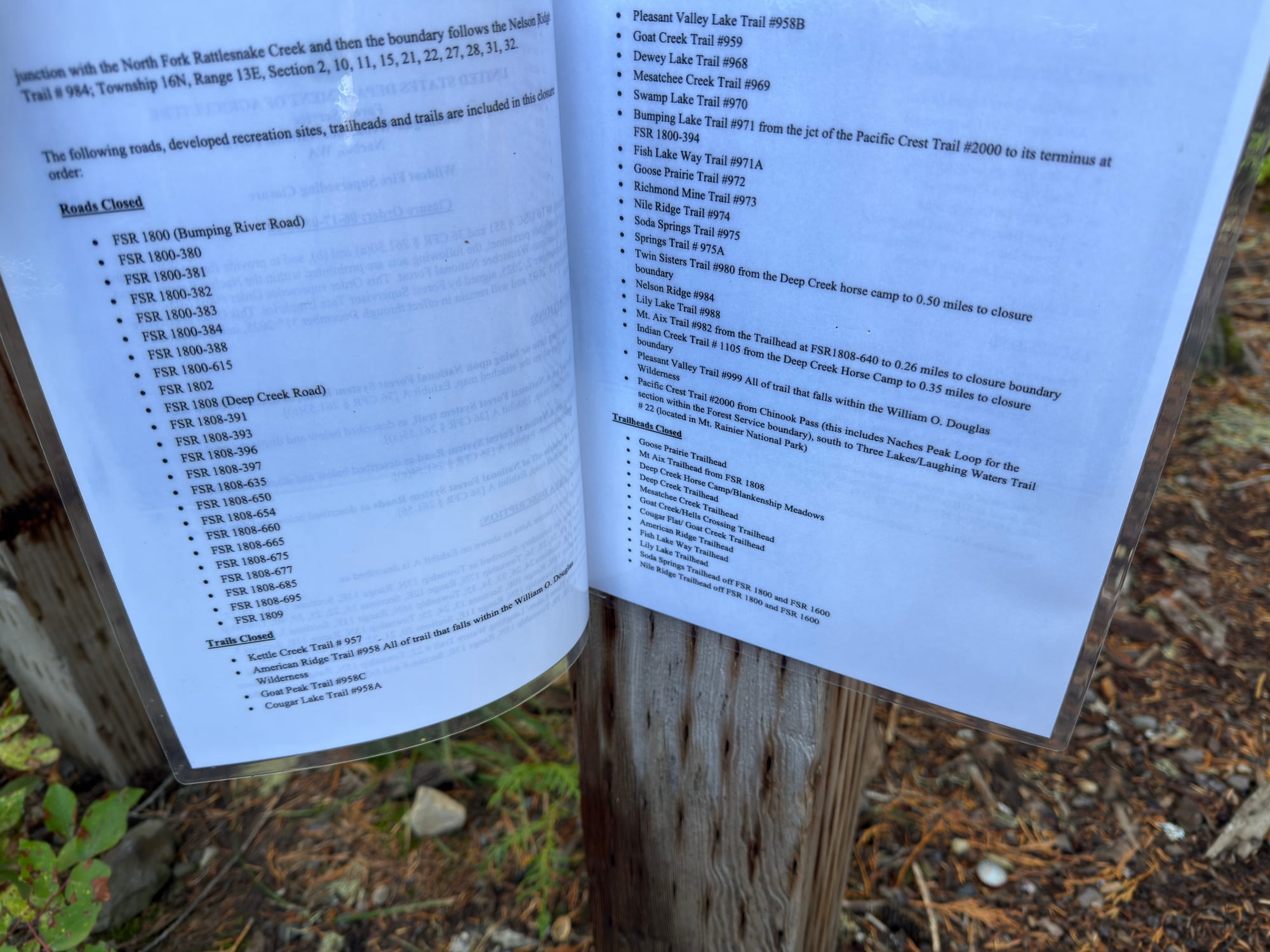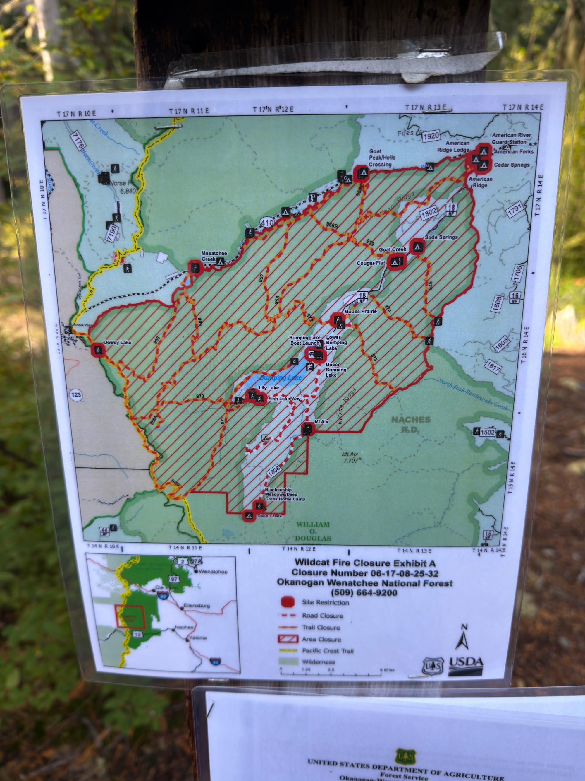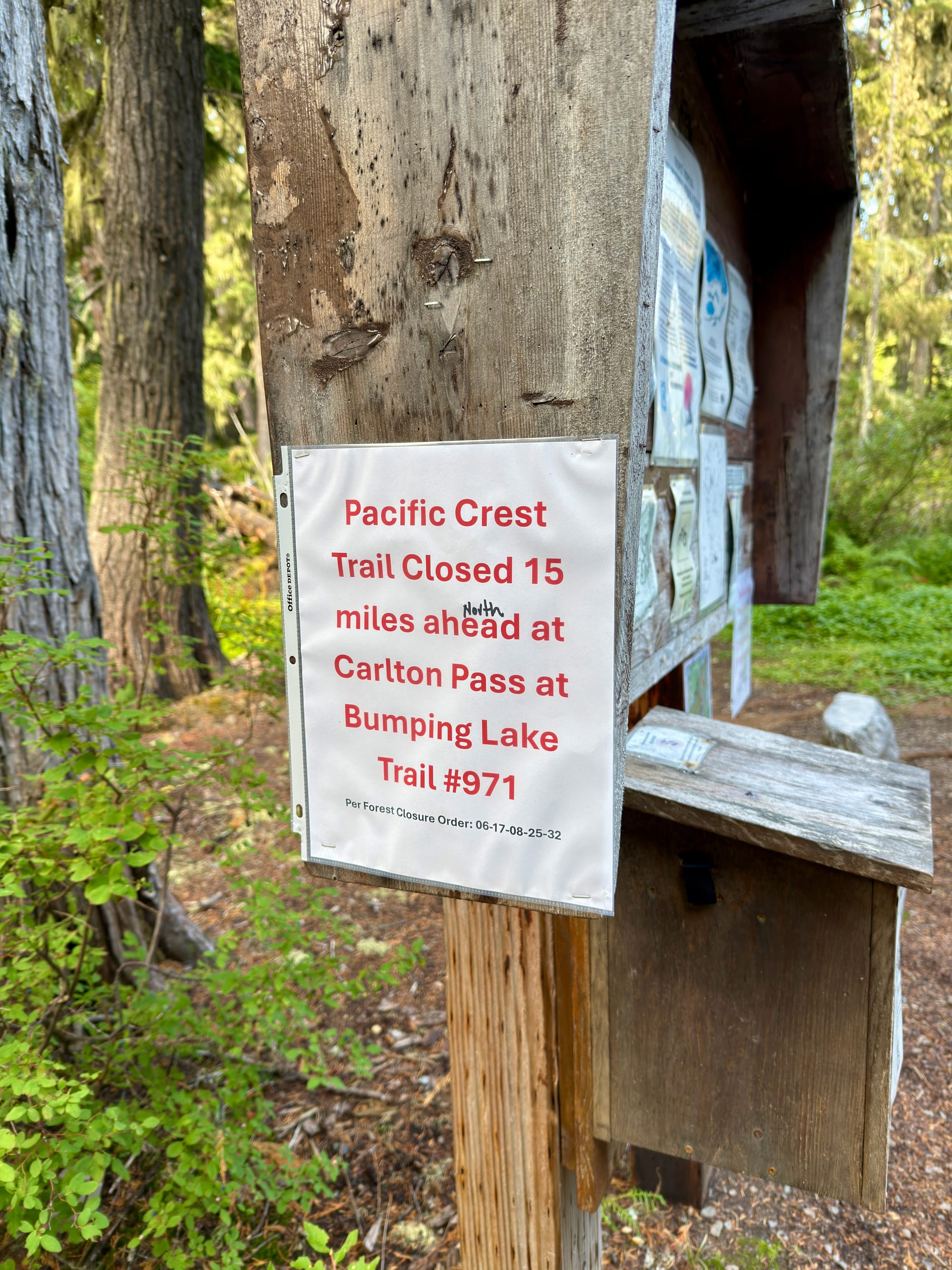 The messaging regarding exactly where the trail was closed was a disaster with conflicting messaging from the PCTA, trailhead signage, and the US Forest Service. The red “Pacific Crest Trail Closed at Bumping Lake“ document above directly conflicted with the published US Forest Service trail closure document and had zero official letterhead or signed authority. We had zero qualms about ignoring it.