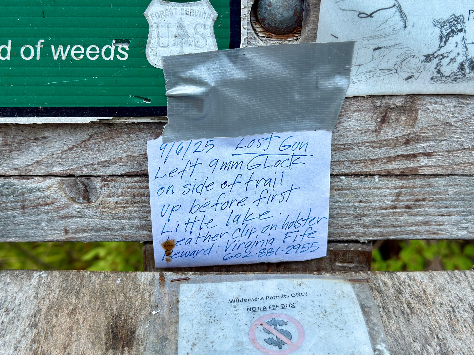 In other fun posts on the White Pass trailhead bulletin board, Virginia Fife lost her Glock handgun at a lake a few miles in.