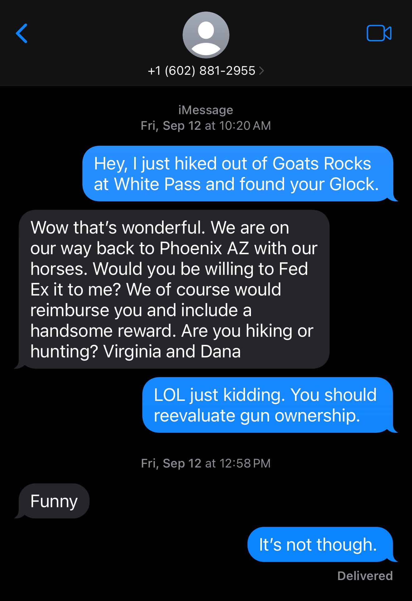 I took the opportunity to text her, and she suggested I casually commit a Federal crime for money to return her casually misplaced handgun.