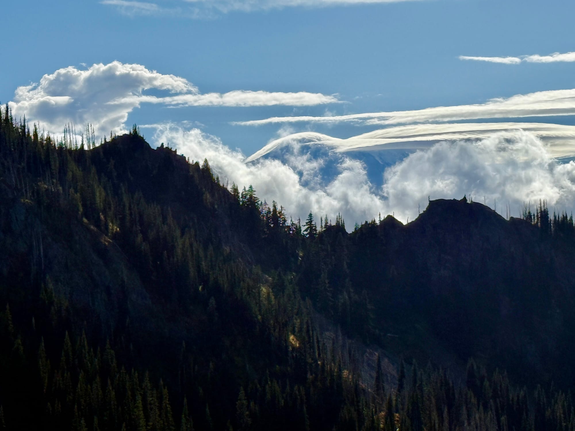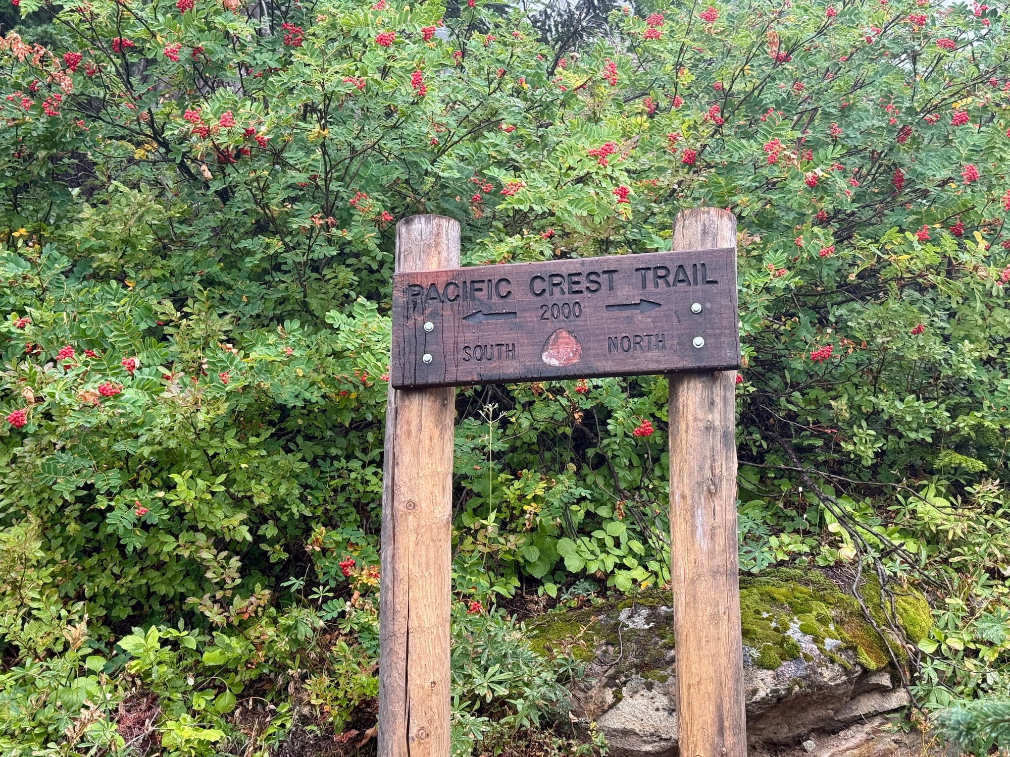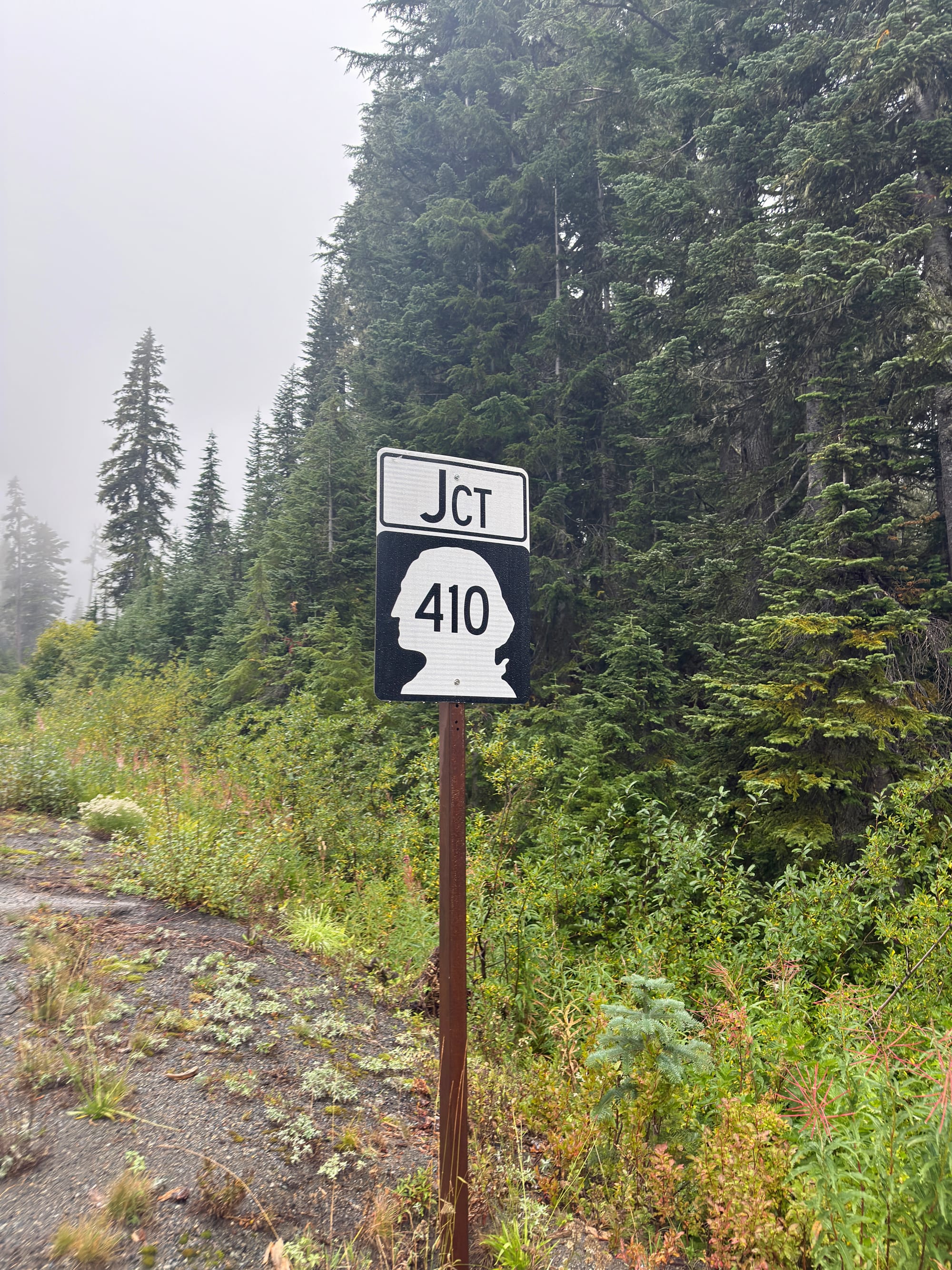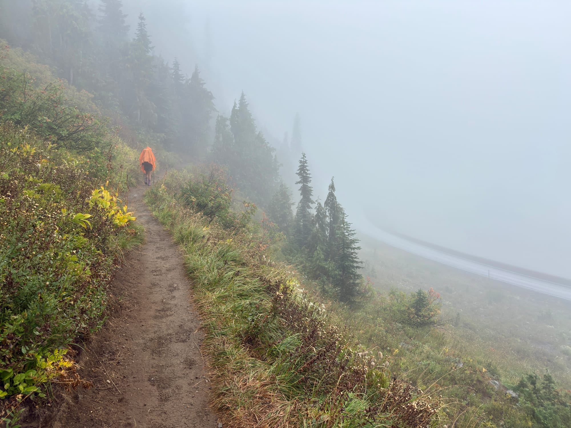 An amazing woman from Yakima swooped us up and took us a couple miles to Chinook Pass where we regrouped, had a snack, and set off into a cloudy trail.
