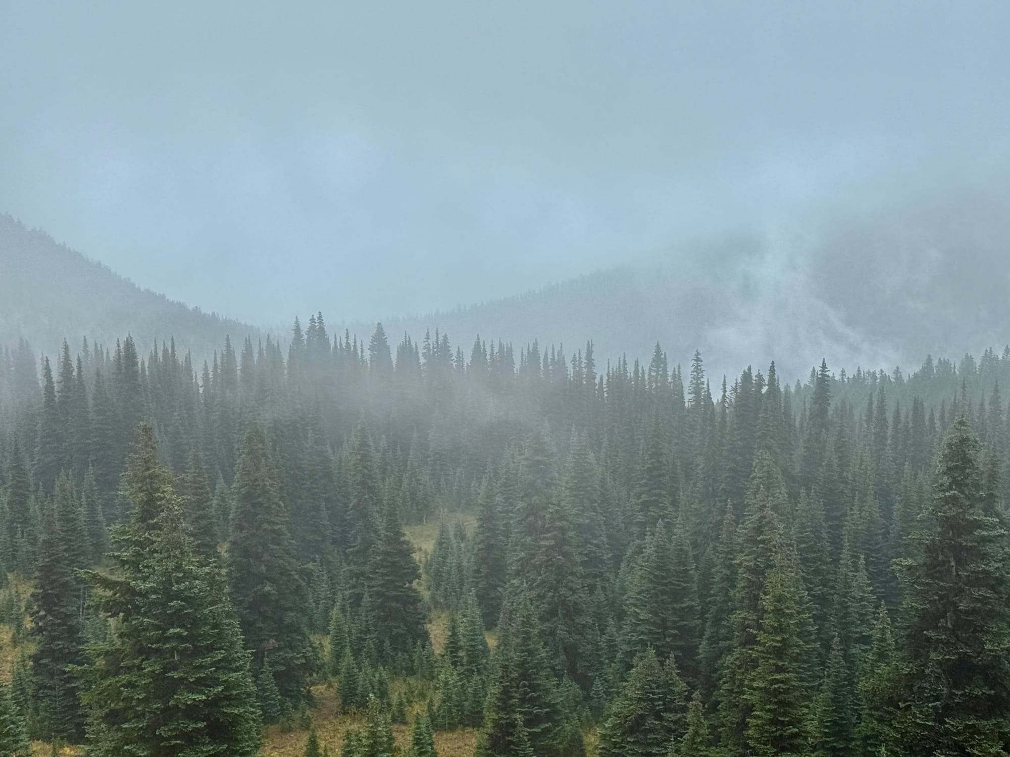 Highway 410 was a long meandering switchbacking road. We didn’t make it up very far along a cloud shrouded, shoulder-less two lane road before deciding to catch a hitch.