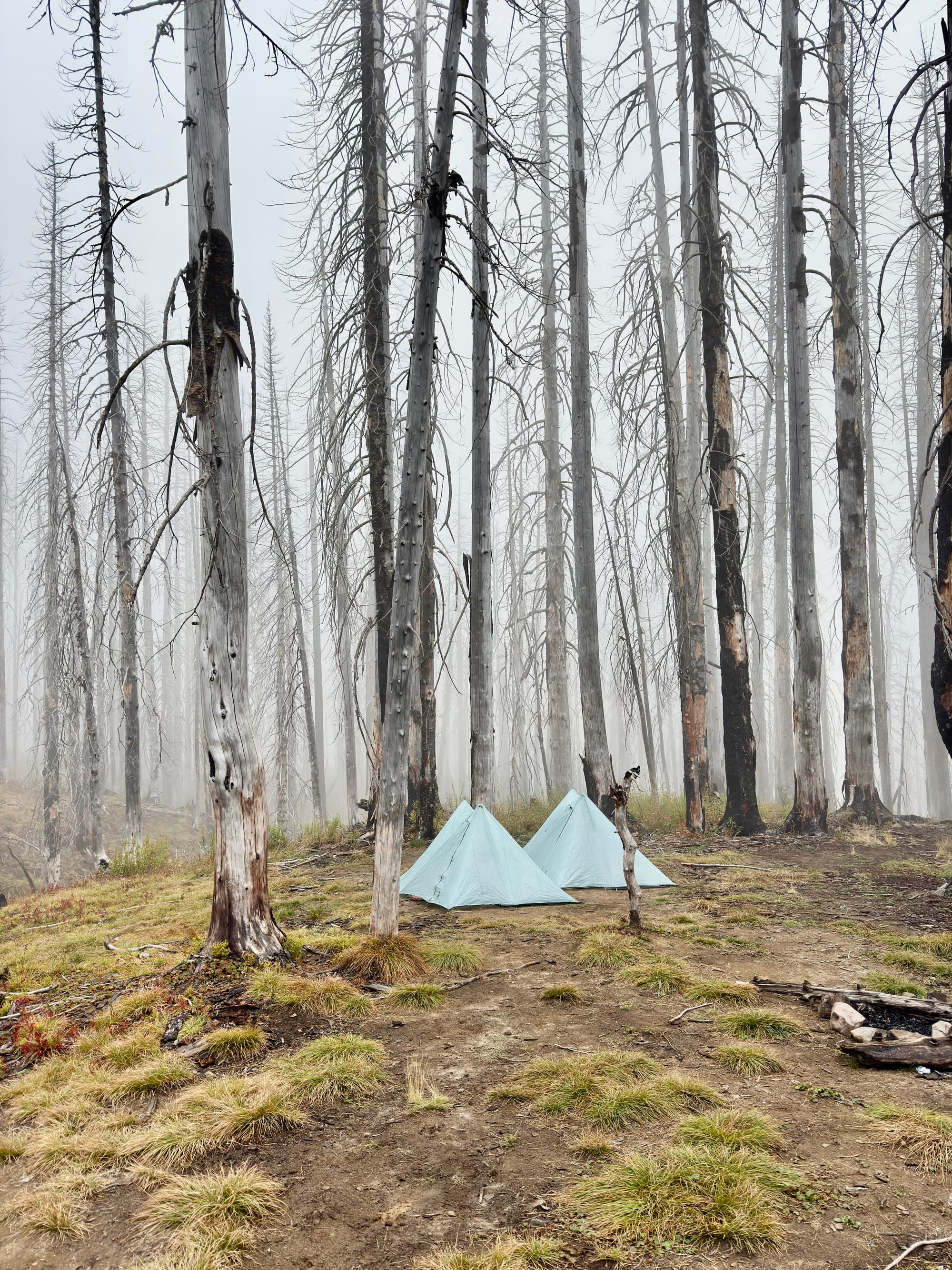 These paragons of brilliance pitched their tents in a burned forest in a windstorm.