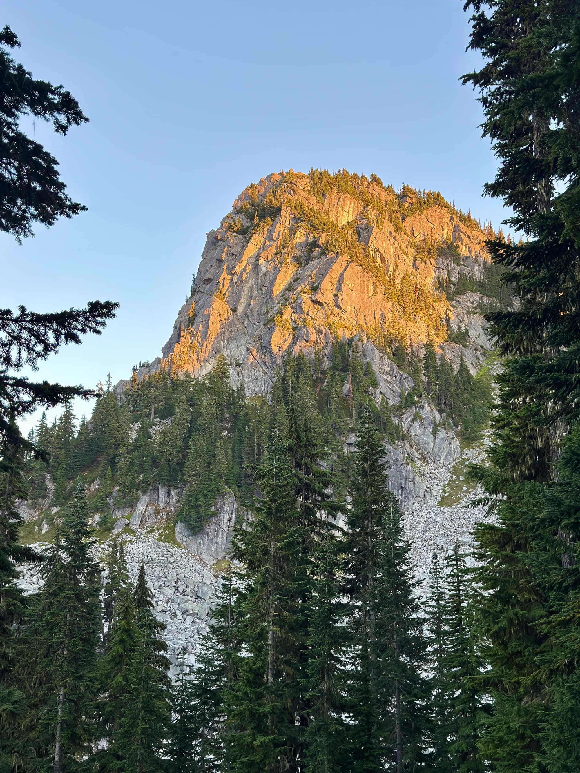 Wanting to avoid waking up to a wet condensation soaked tent (we’re learning!) we opted to avoid some waterfront sites and set up for the night in a spot a few hundred feet above the lake. We found a wooded area with a few sites that proved surprisingly difficult to find a suitable pad to pitch the tent on as the primary spots were well suited for small free-standing tents, but weren’t big or level enough to accommodate a decent pitch with our larger tent with a hexagonal footprint. We eventually figured out a pitch on a decently level root-free spot with light from our headlamps and crashed after a big day spent climbing and pushing towards a day off at Stevens Pass / Leavenworth.