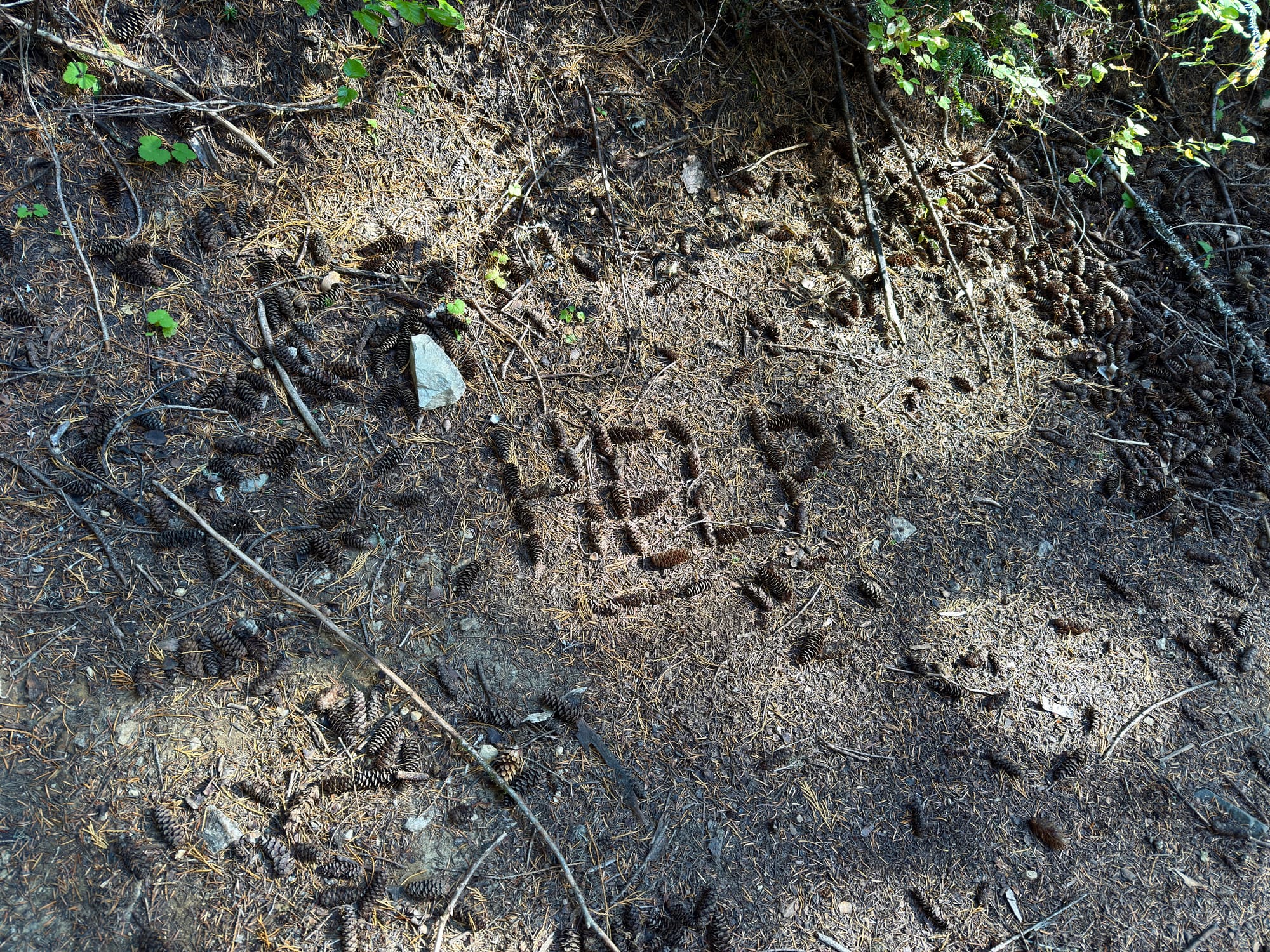 Someone left a message spelled out with pinecones. My thoughts exactly.