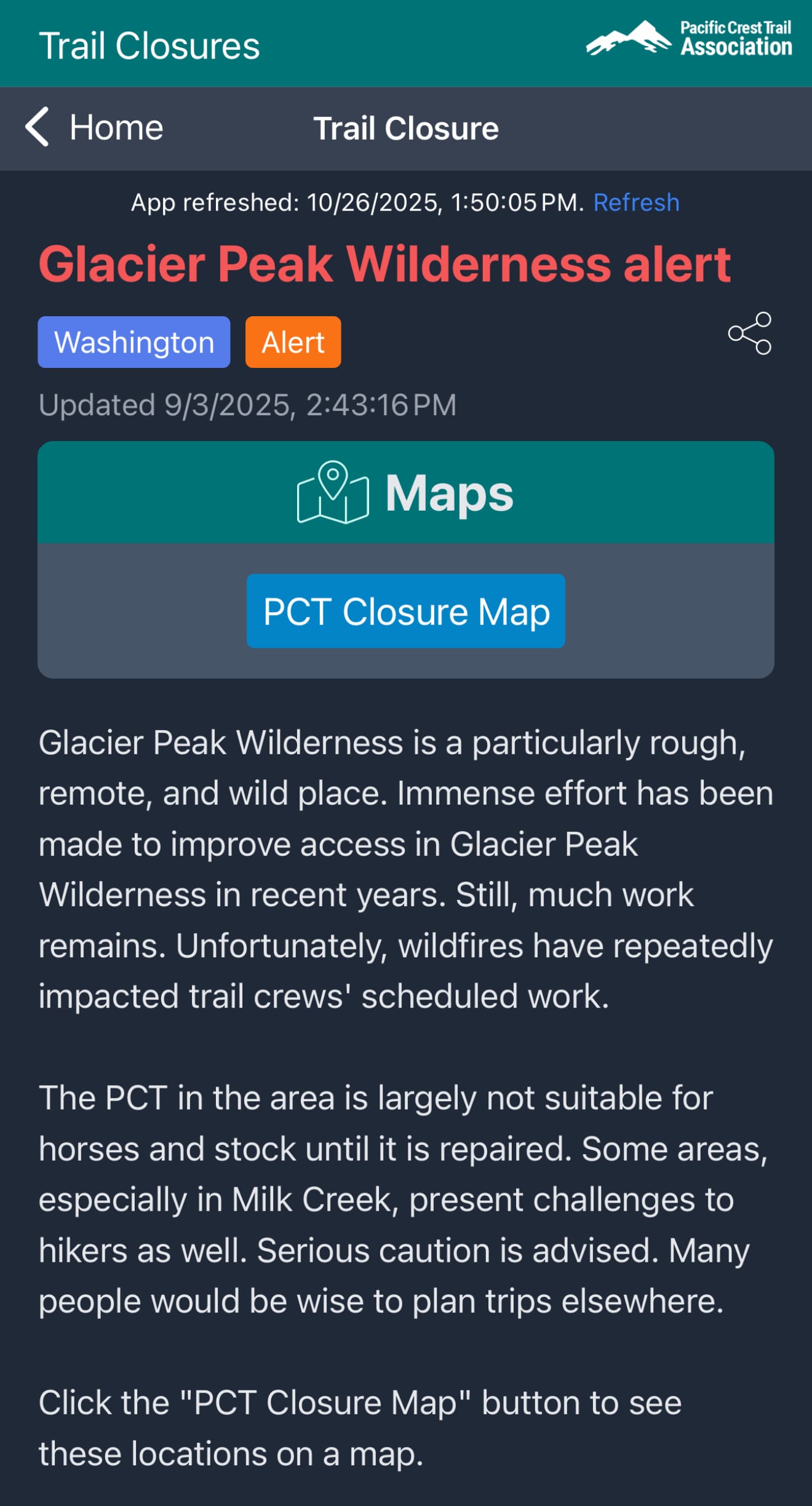 Glacier Peak Wilderness was called out explicitly in the PCTA Closures app with a note that ”serious caution is advised and many people would be wise to plan trips elsewhere“.