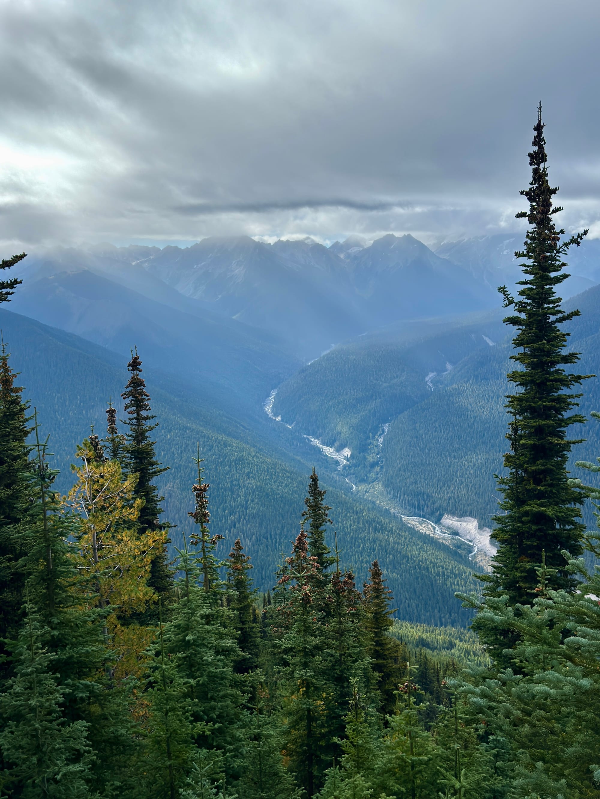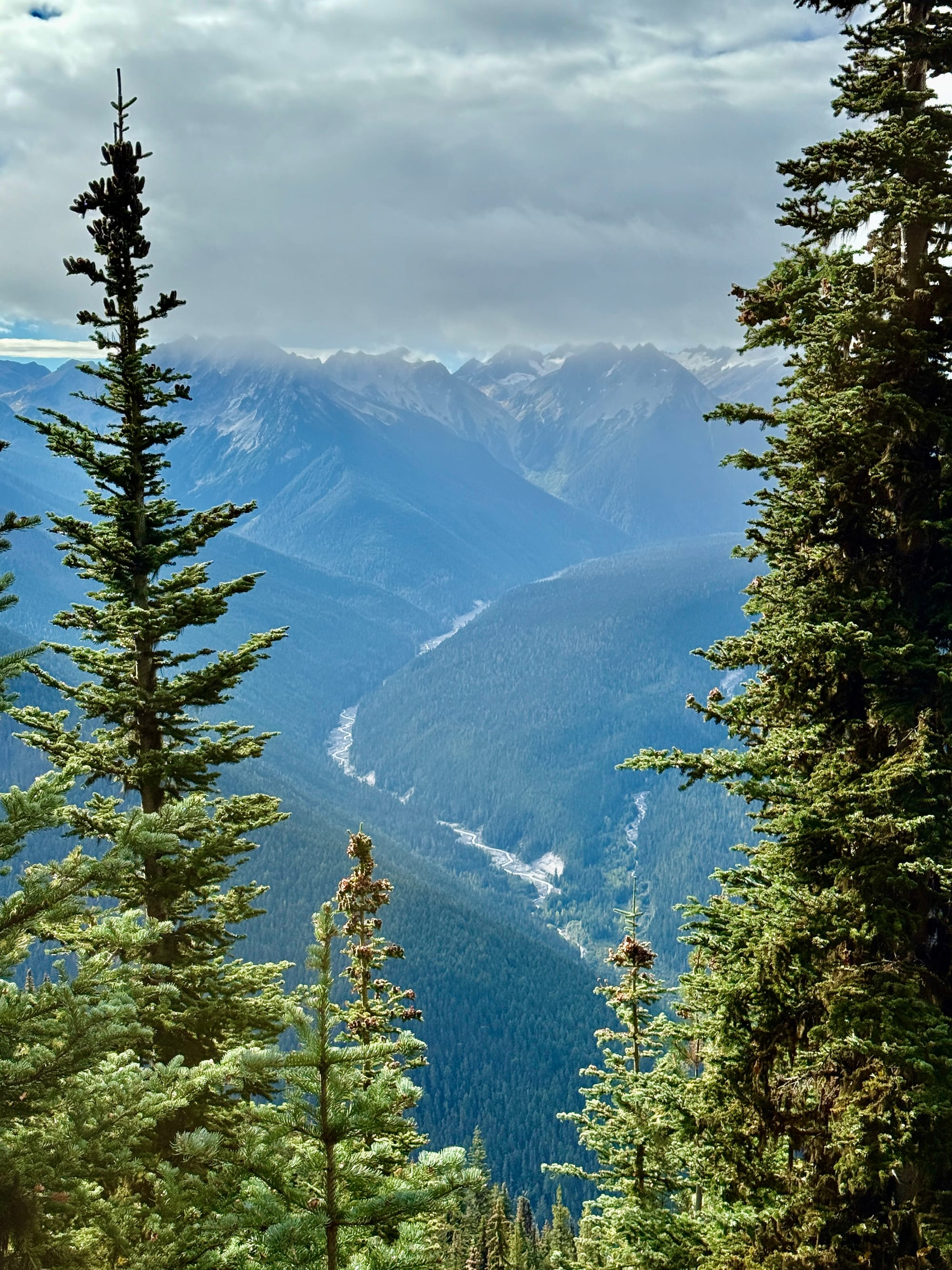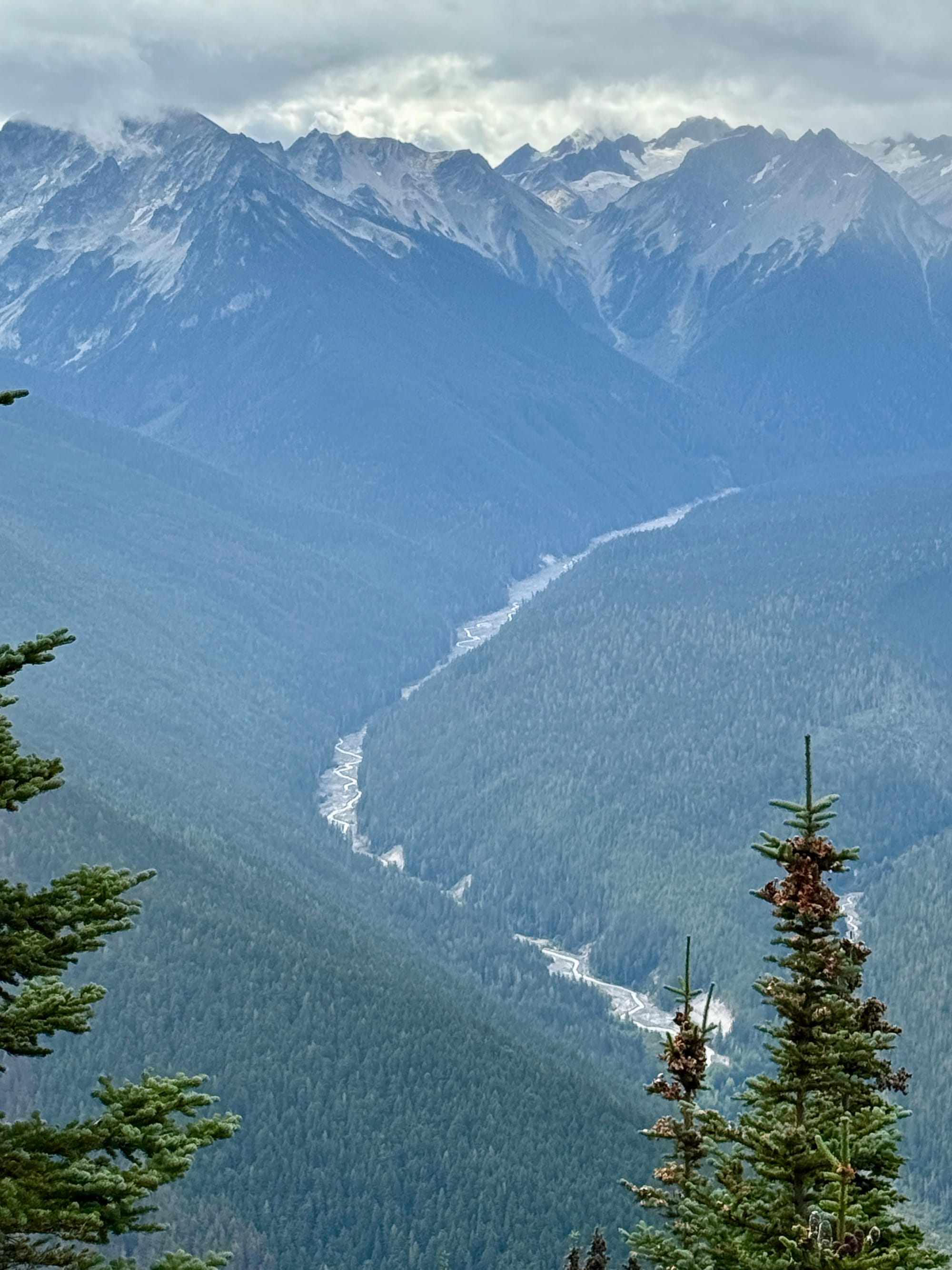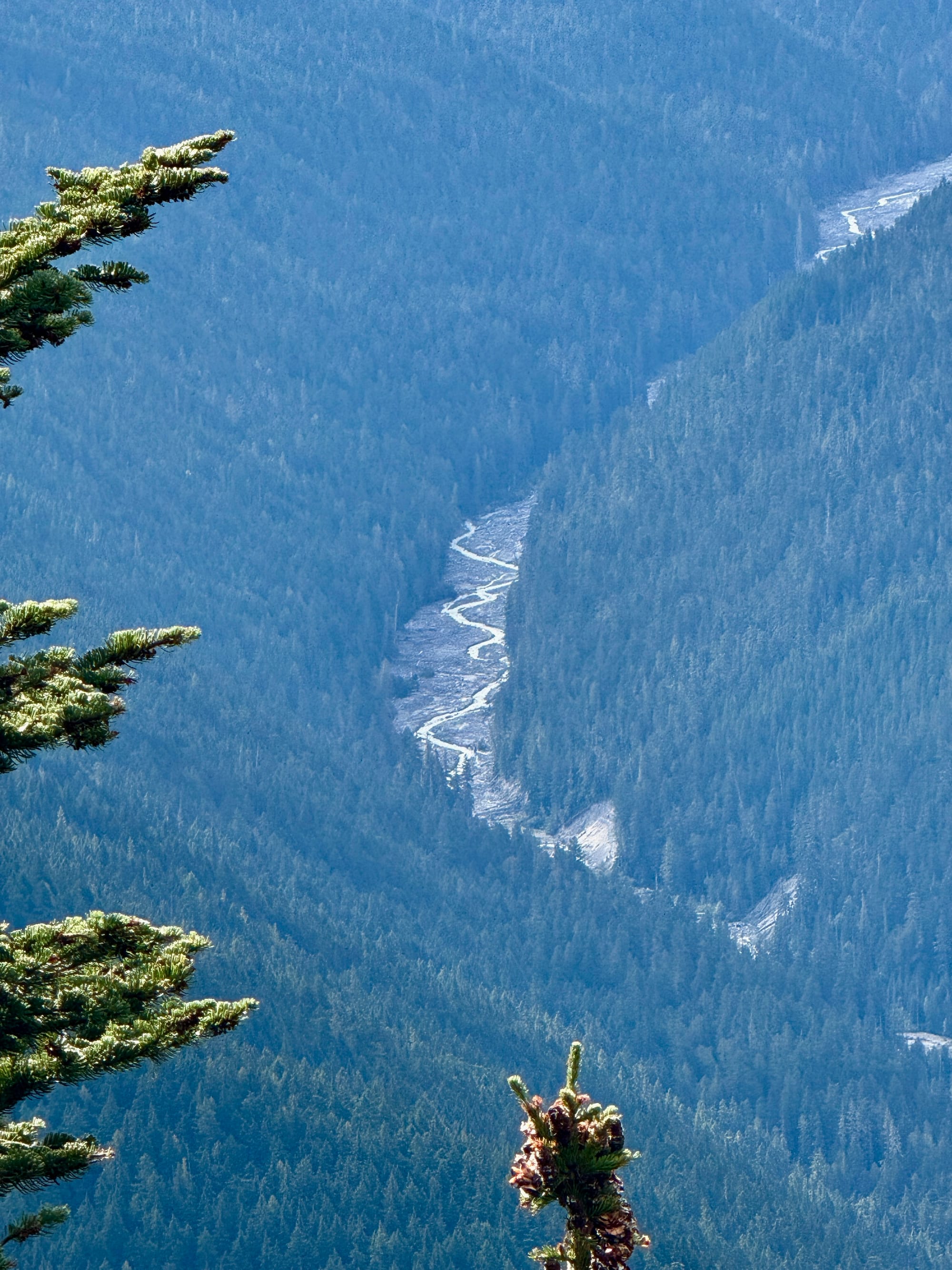 We camped at a junction of a trail that went straight up approximately 4000’ to a fire lookout before traversing a ridge to Suiattle Pass. The PCT gradually proceeded up to Suiattle Pass along the river at the bottom of a tree filled valley. We opted for the ridge.