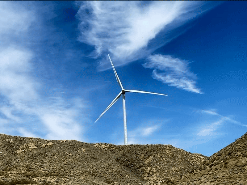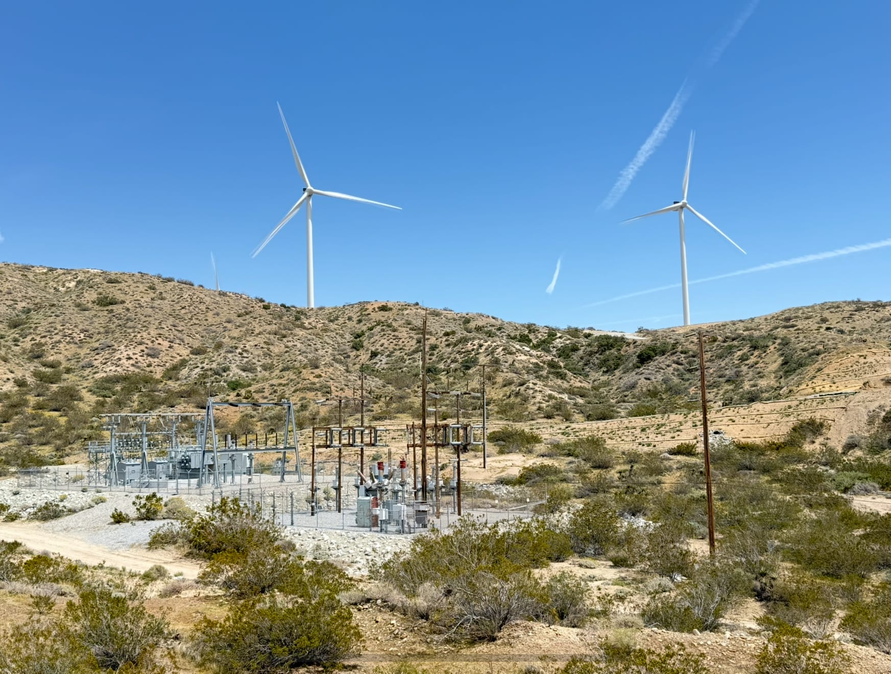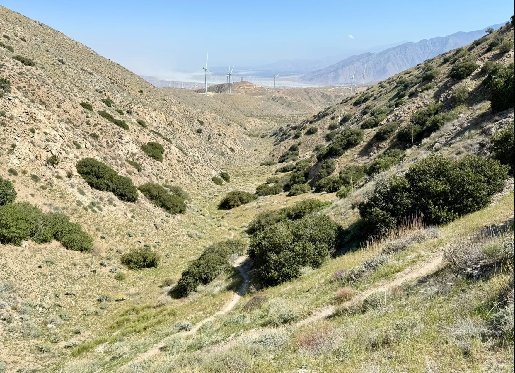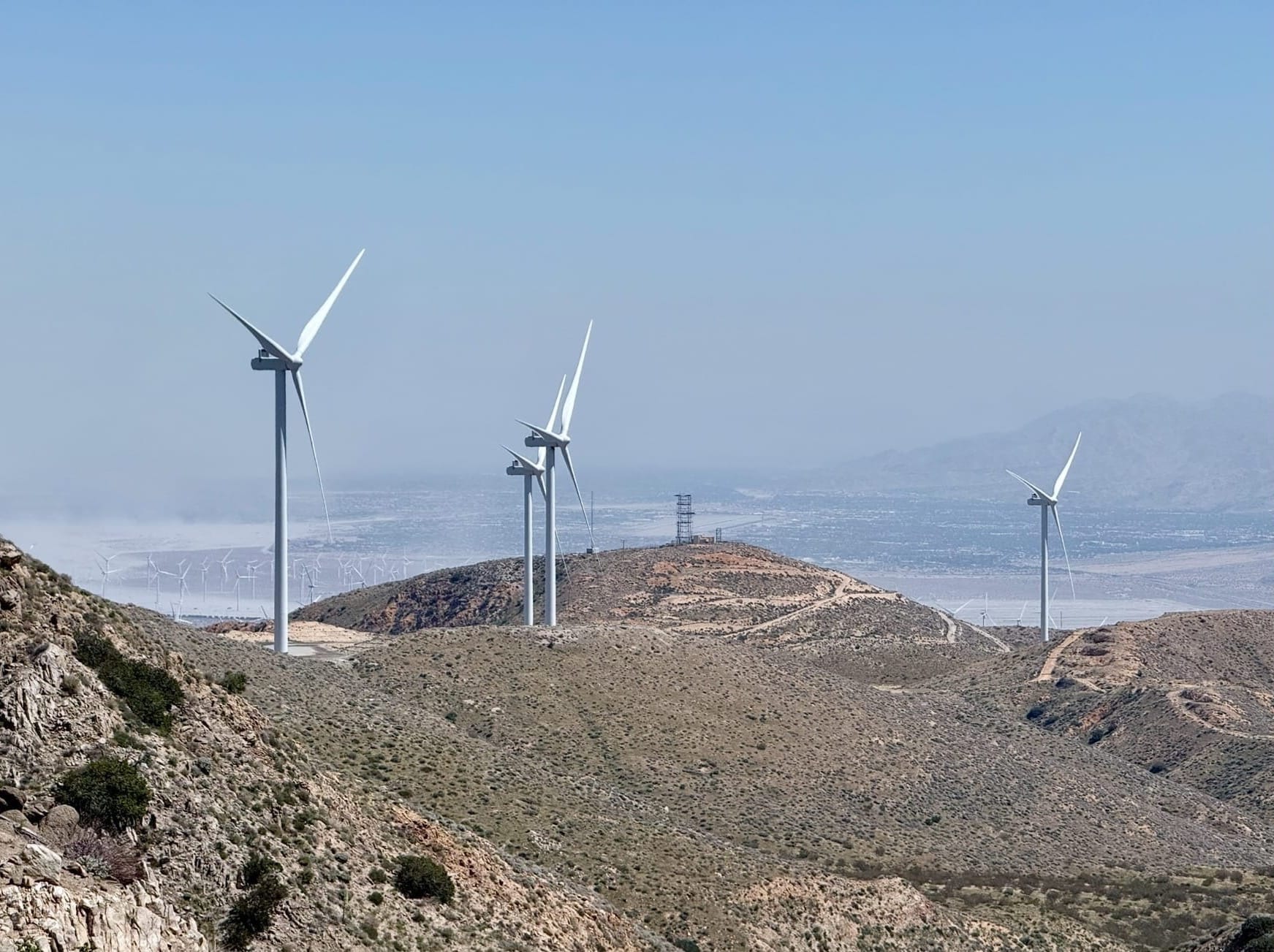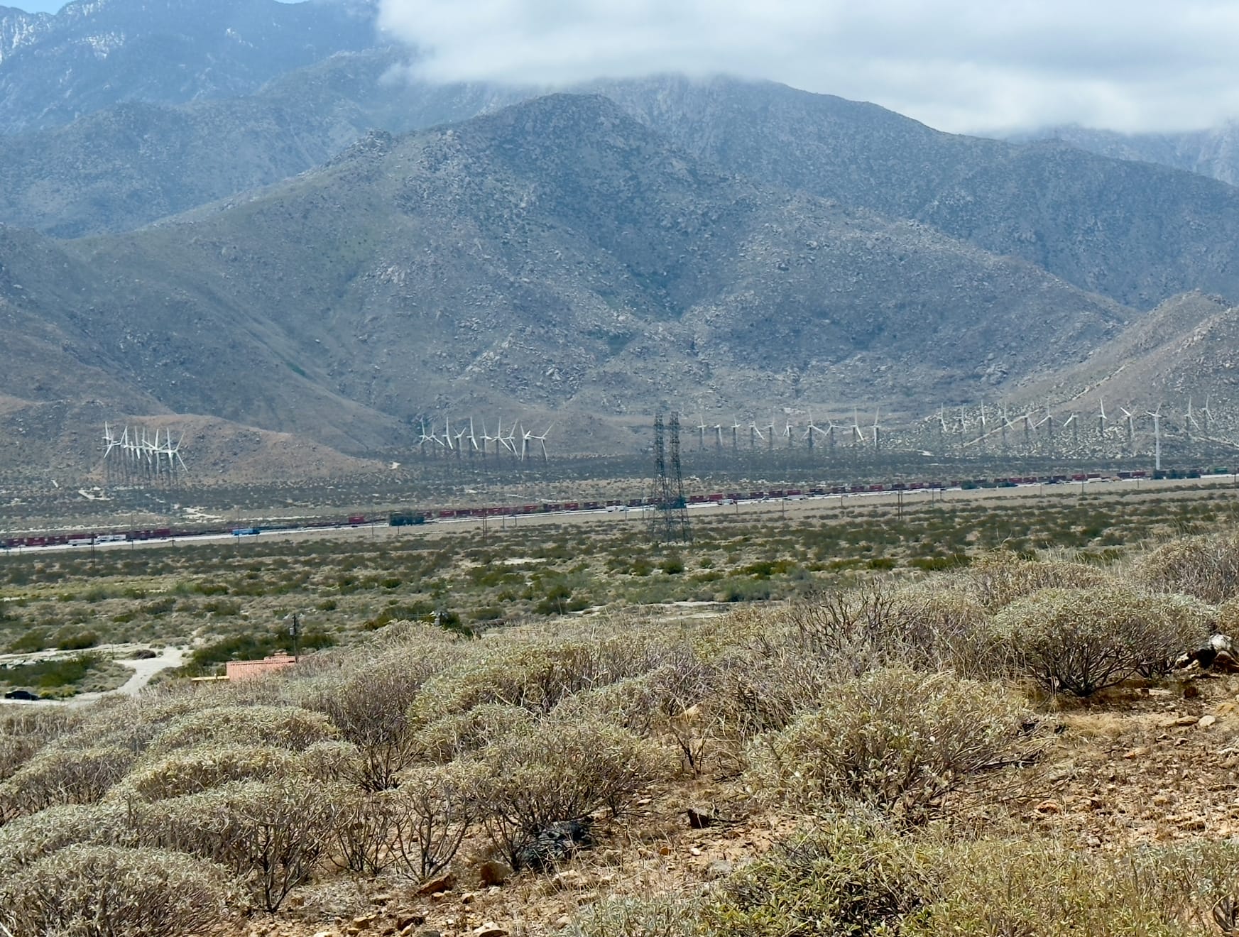Overlooking the Mesa wind farm, Palm Springs, and a dust storm down the Coachella Valley.
