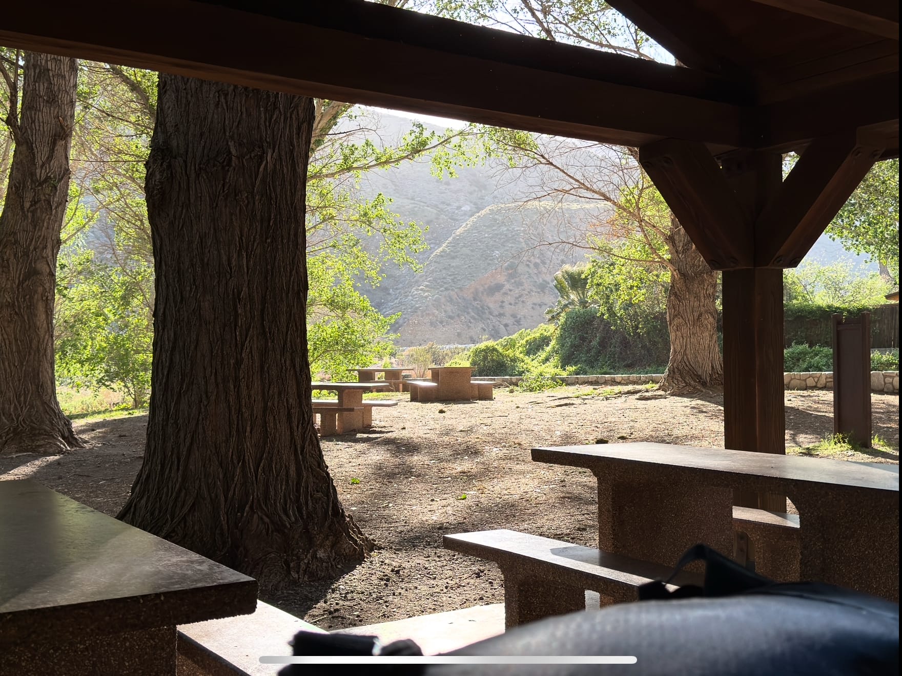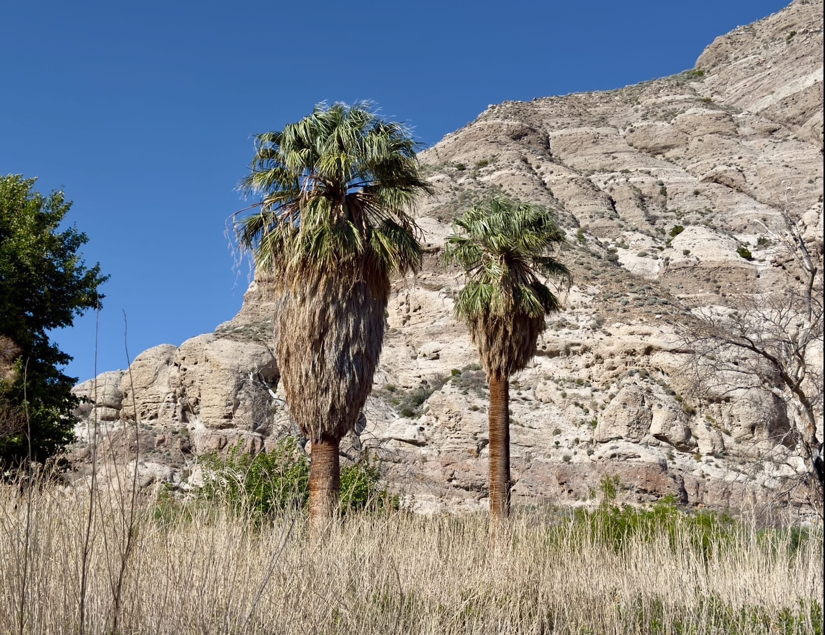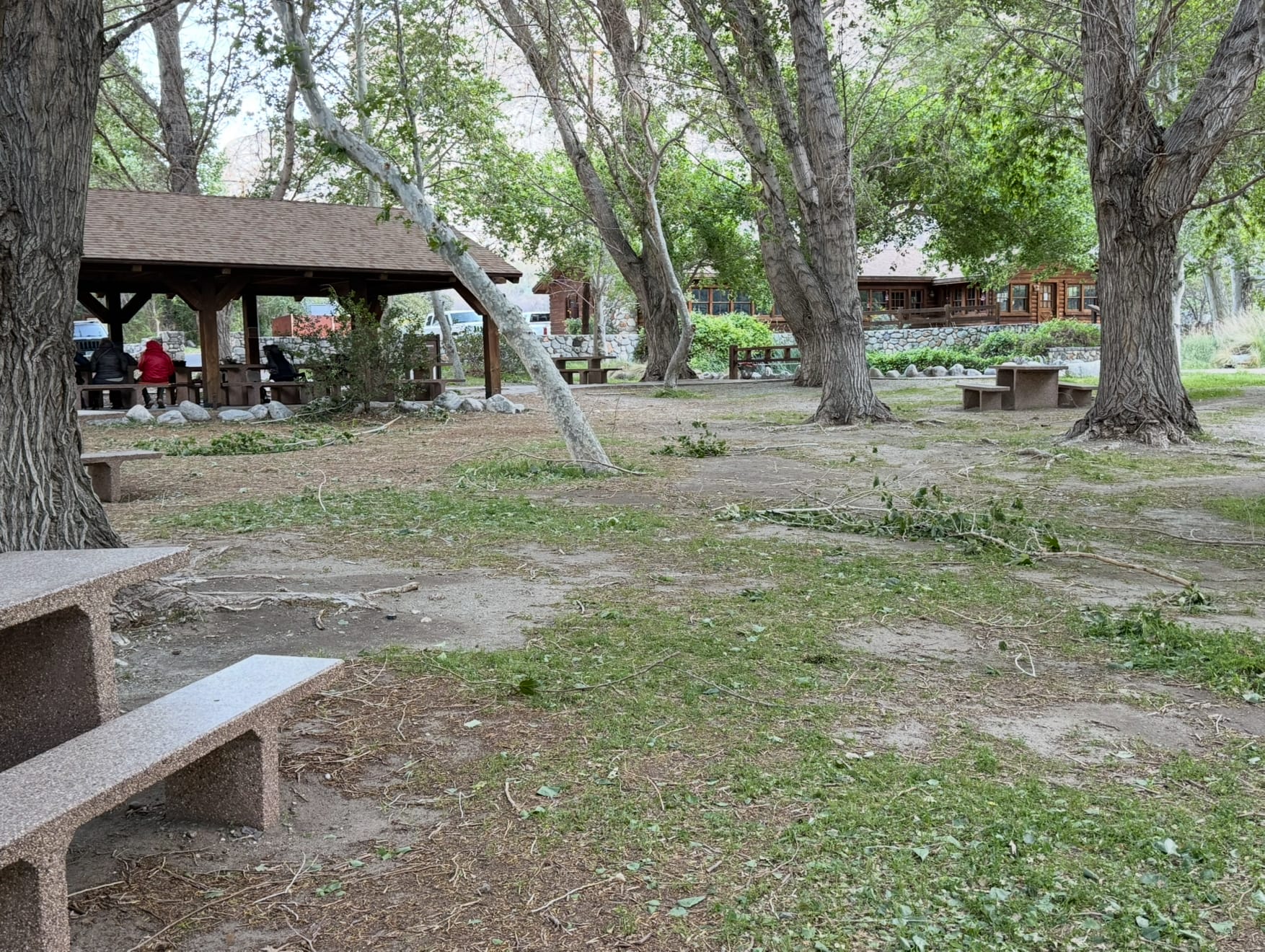 The Ranger at White Water Preserve pointed us to an open field past a wonderful grass area under large cottonwood trees to set up our tent, cautioning us that cottonwood trees drop branches in high winds. This is the debris under the cottonwoods the next morning. The Ranger station and the patio we camped on is in the background.