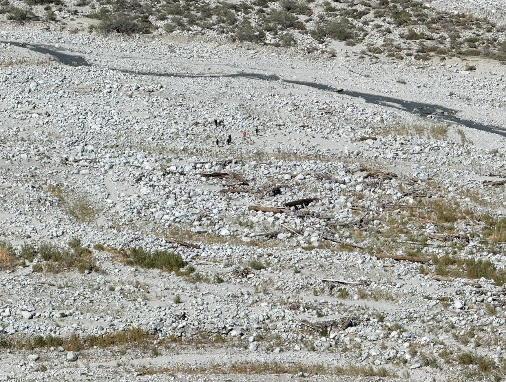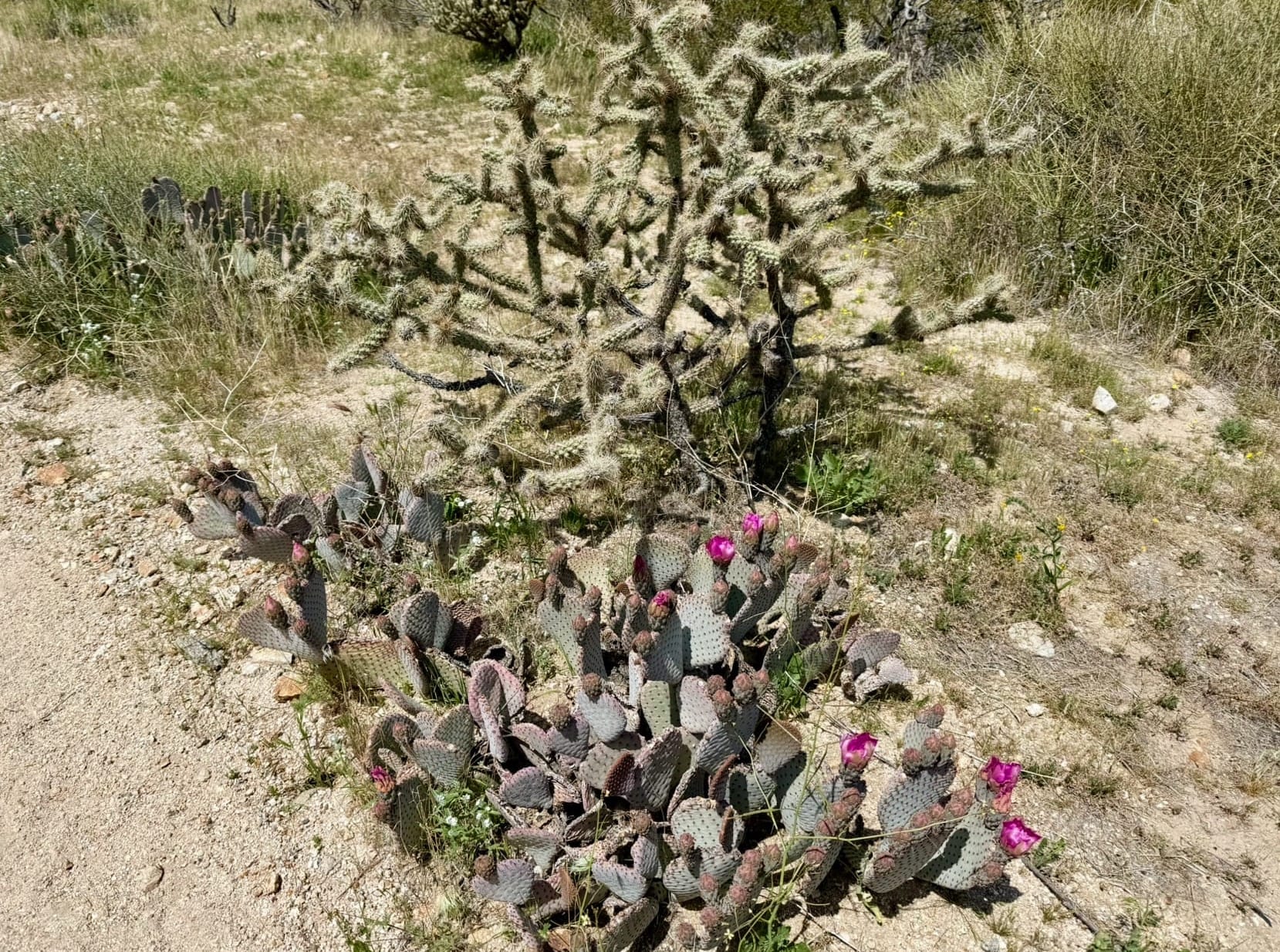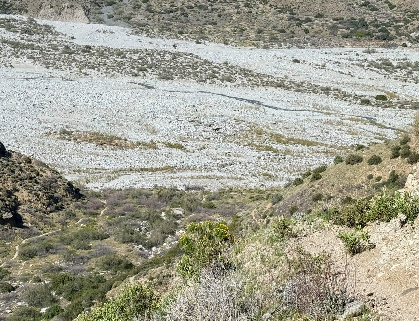The Ranger at White Water Preserve pointed us to an open field past a wonderful grass area under large cottonwood trees to set up our tent, cautioning us that cottonwood trees drop branches in high winds. This is the debris under the cottonwoods the next morning. The Ranger station and the patio we camped on is in the background.