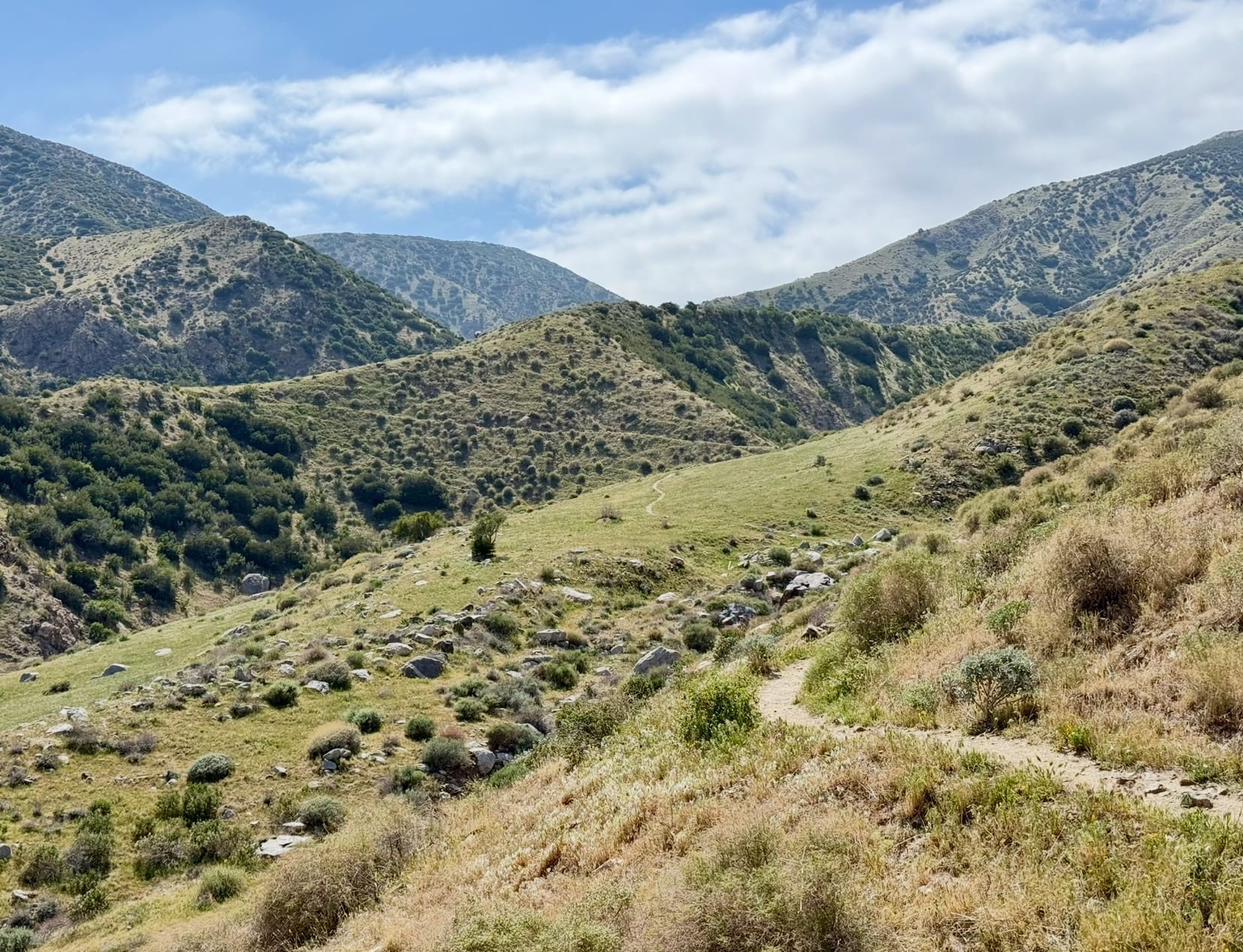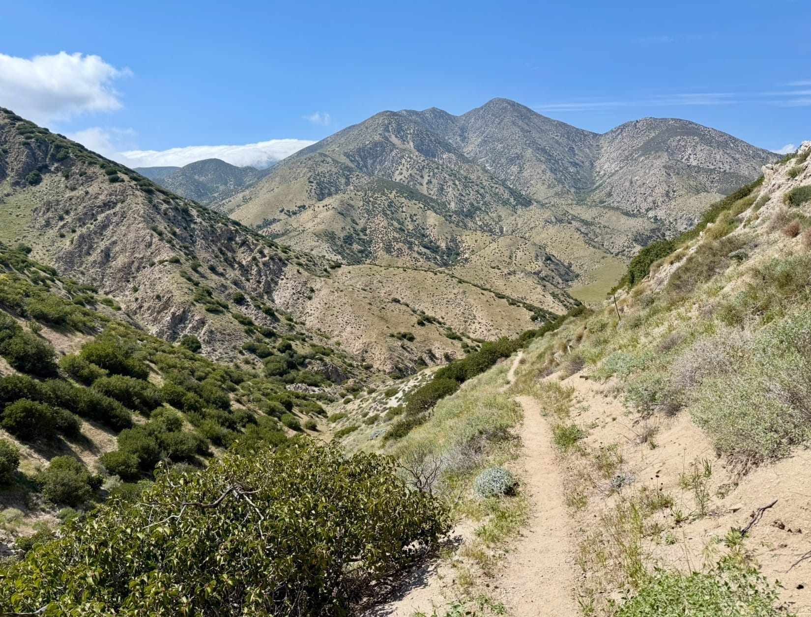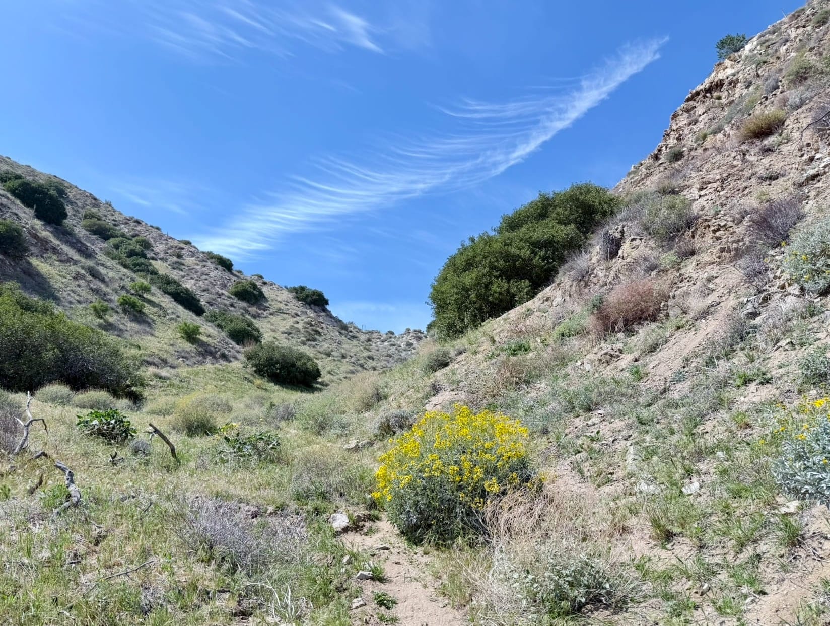 Climbing up a steep canyon to a pass. A contrail became a string of wispy clouds in the wind.