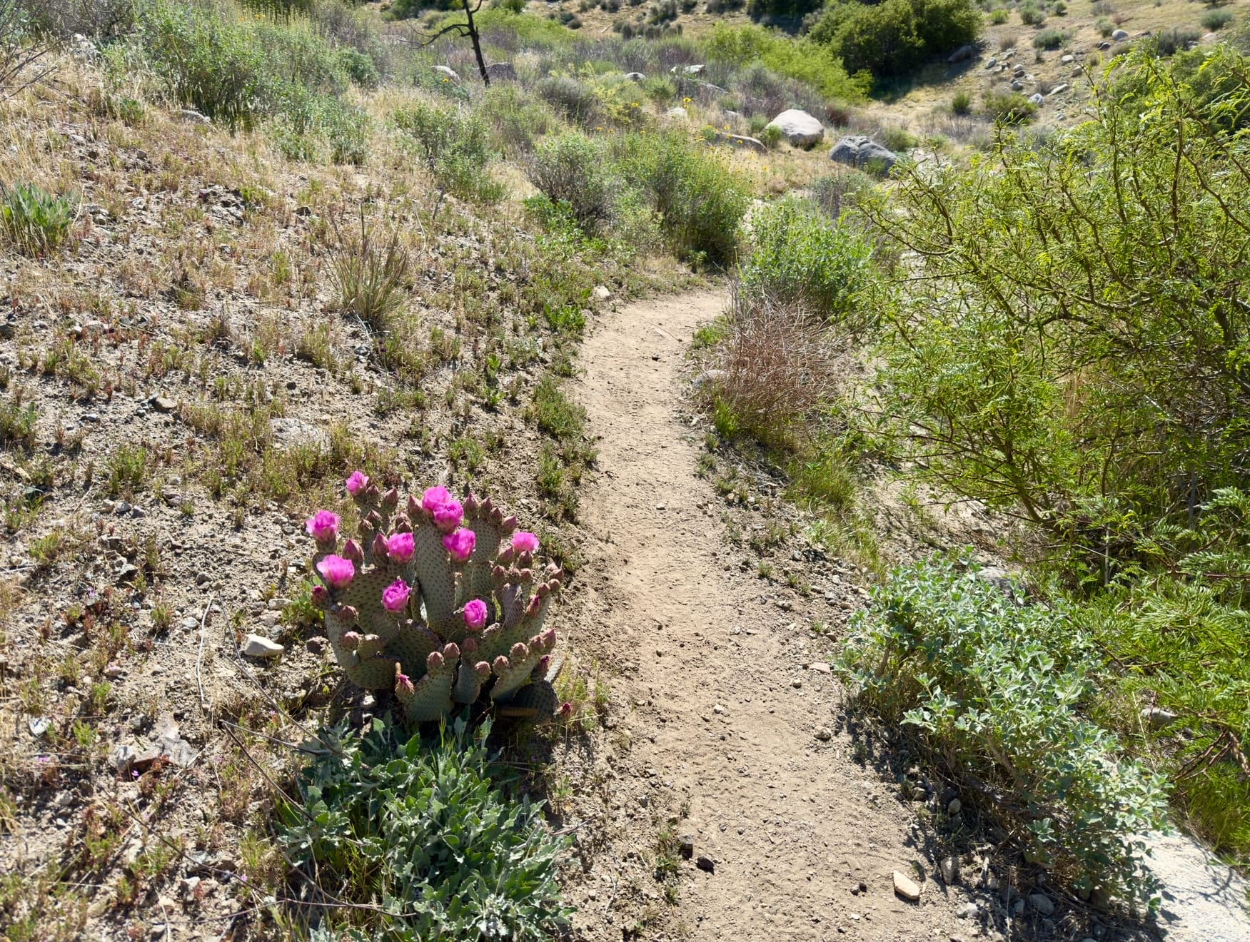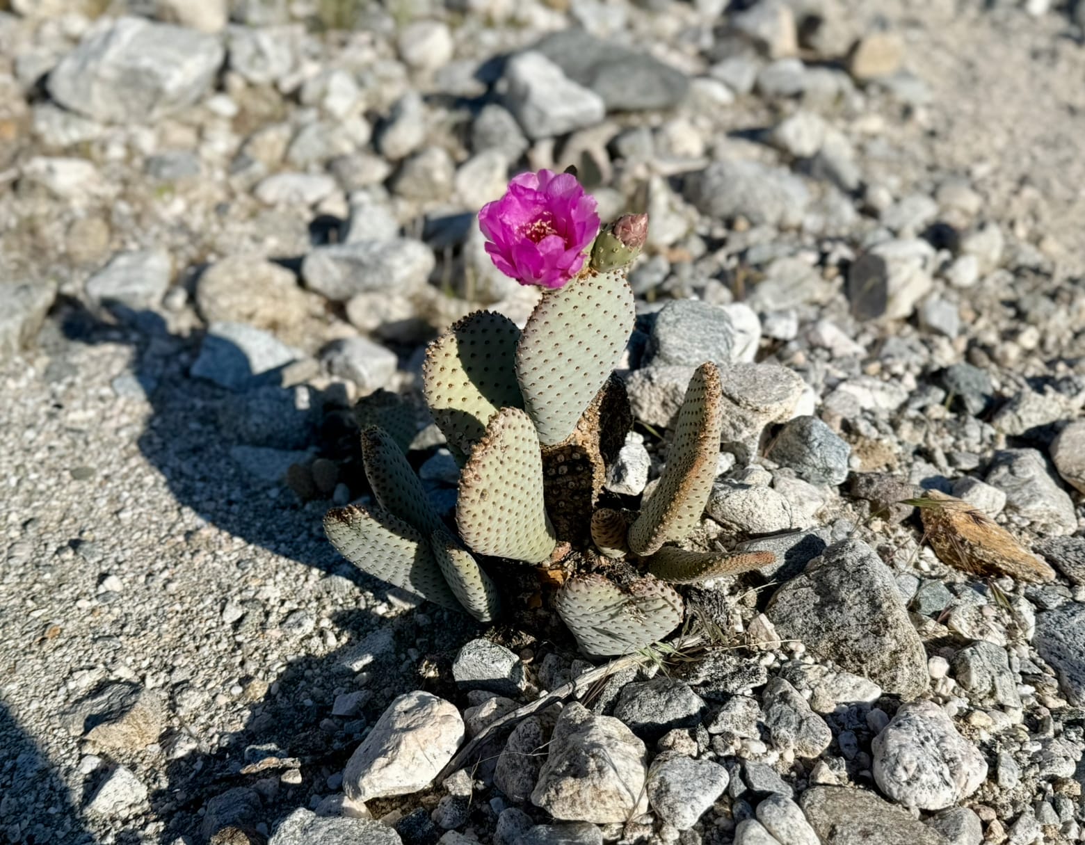 You don’t have to understand color theory to know that the pinkish flowers of a prickly pear catch your attention in a muted green landscape.