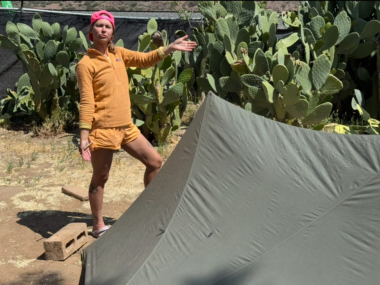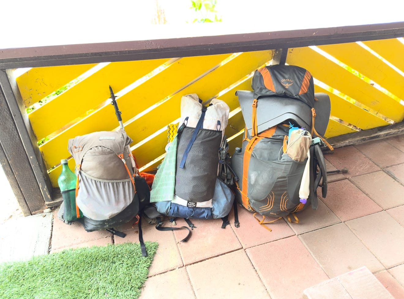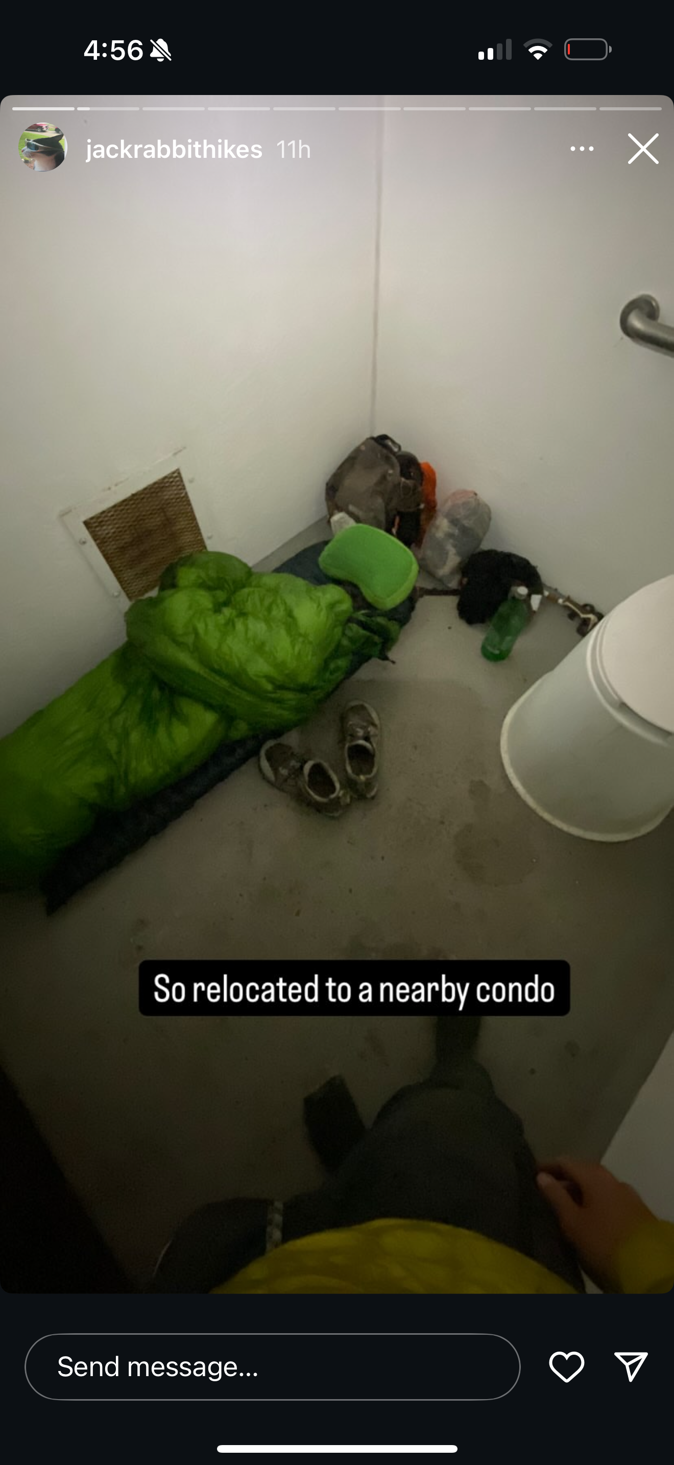 Some people get their base weight (essentially your pack without food and water) down to ~5-6 pounds by foregoing fancy luxuries like a tent and sleeping pad. Here’s Jackrabbit’s setup from the previous night spent in a Forest Service pit toilet dodging weather on the ridge before he came blowing past us the next morning.