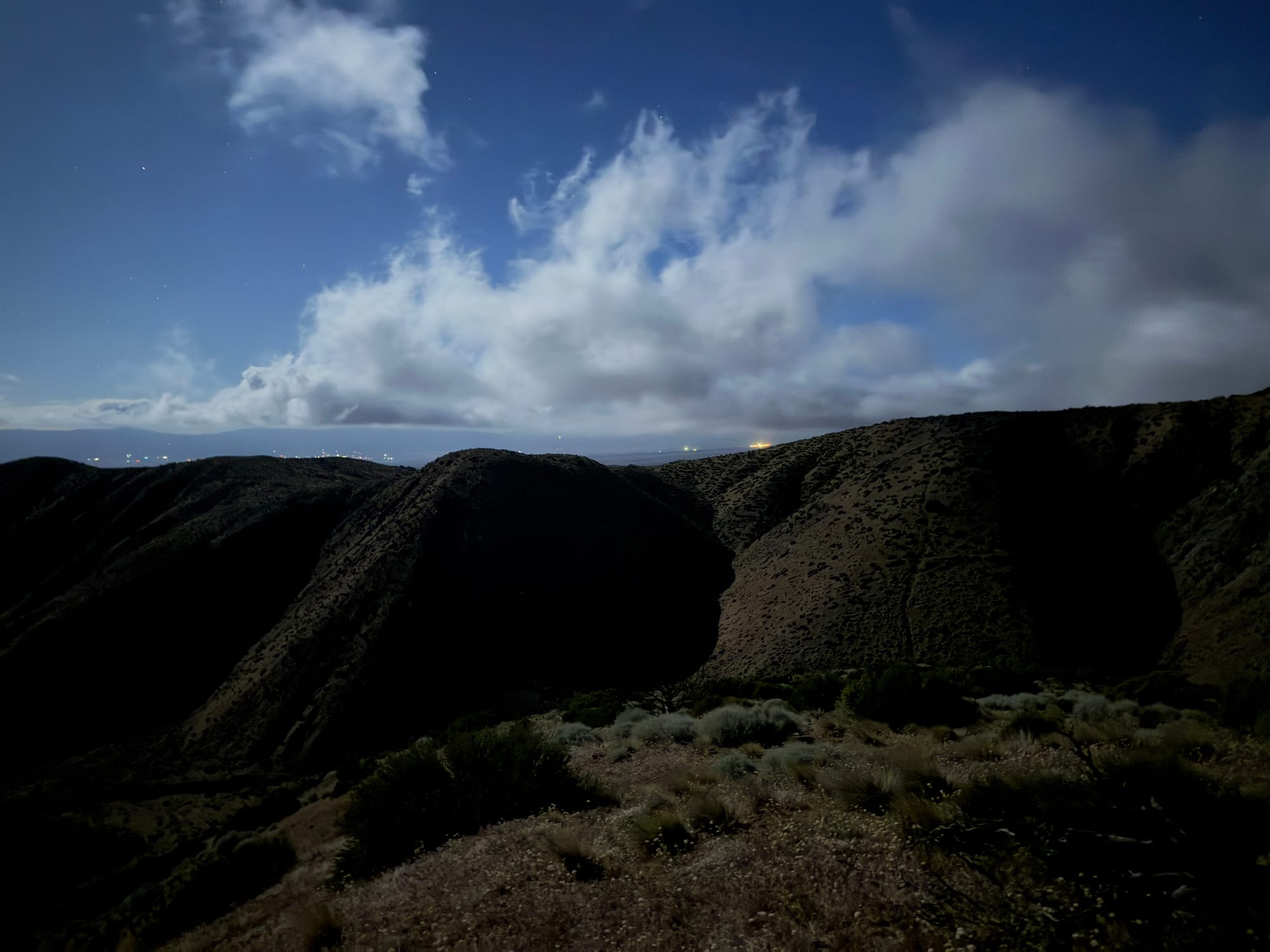 We pushed on, setting up camp for the night before a 1600’ climb up and out of this ravine. The wind picked up through the night, and after 100+ pounds of rock and half-a-dozen attempts at securing an up-wind tent stake couldn’t keep it secured in the ground, we mentally prepared for a long night of hiking before packing up around ~1:00 am and heading up the climb in the dark under a full moon.
