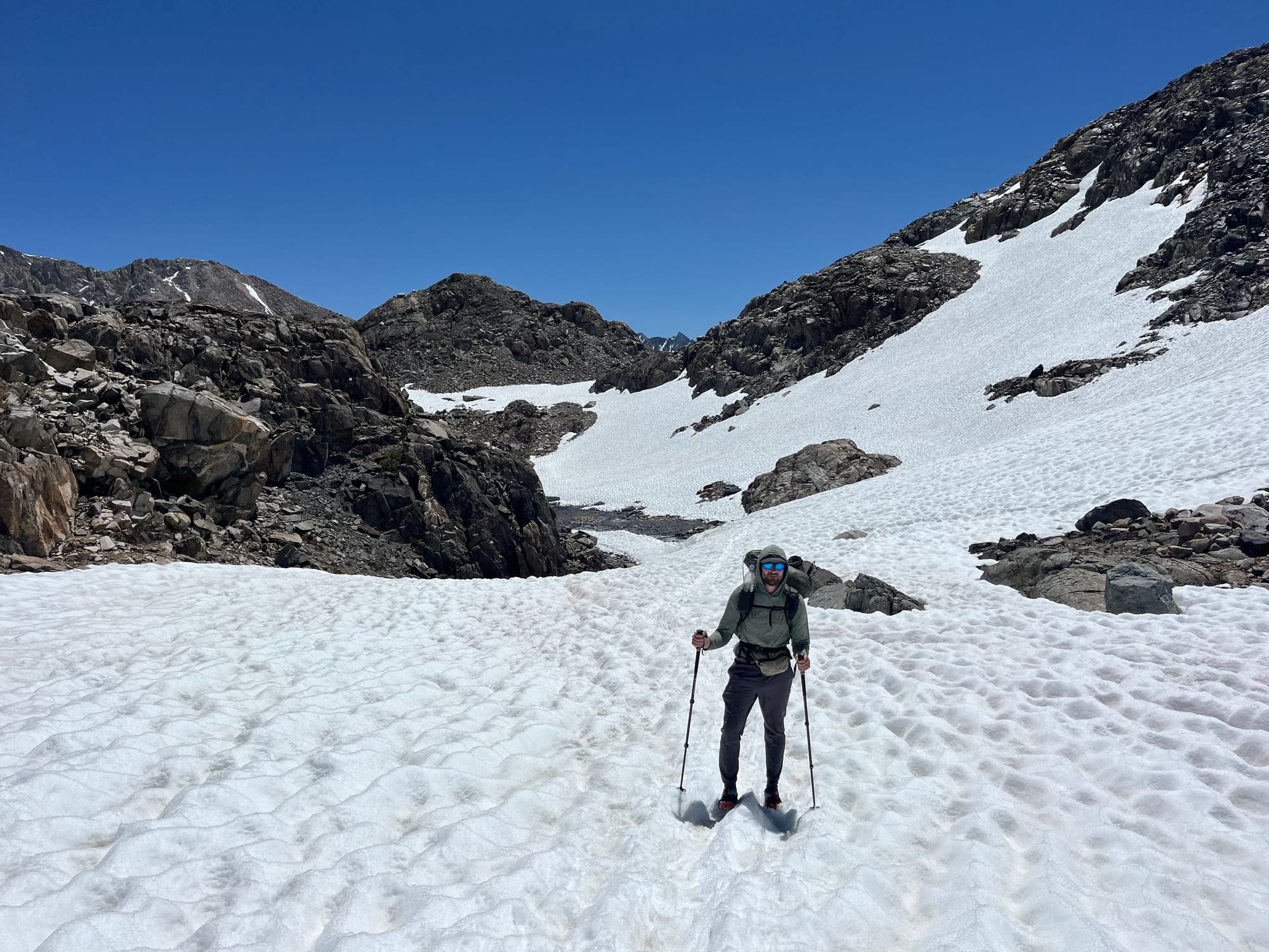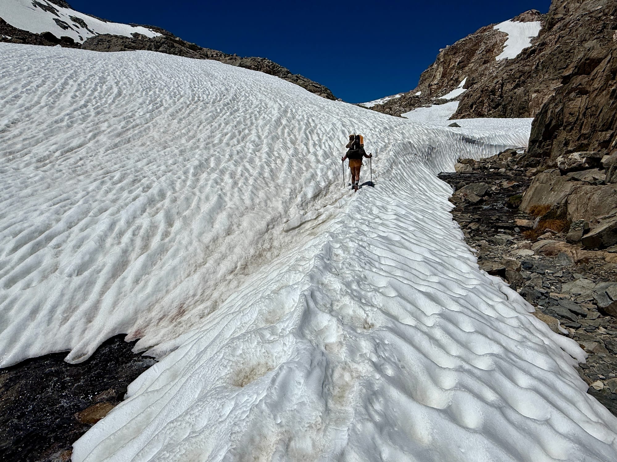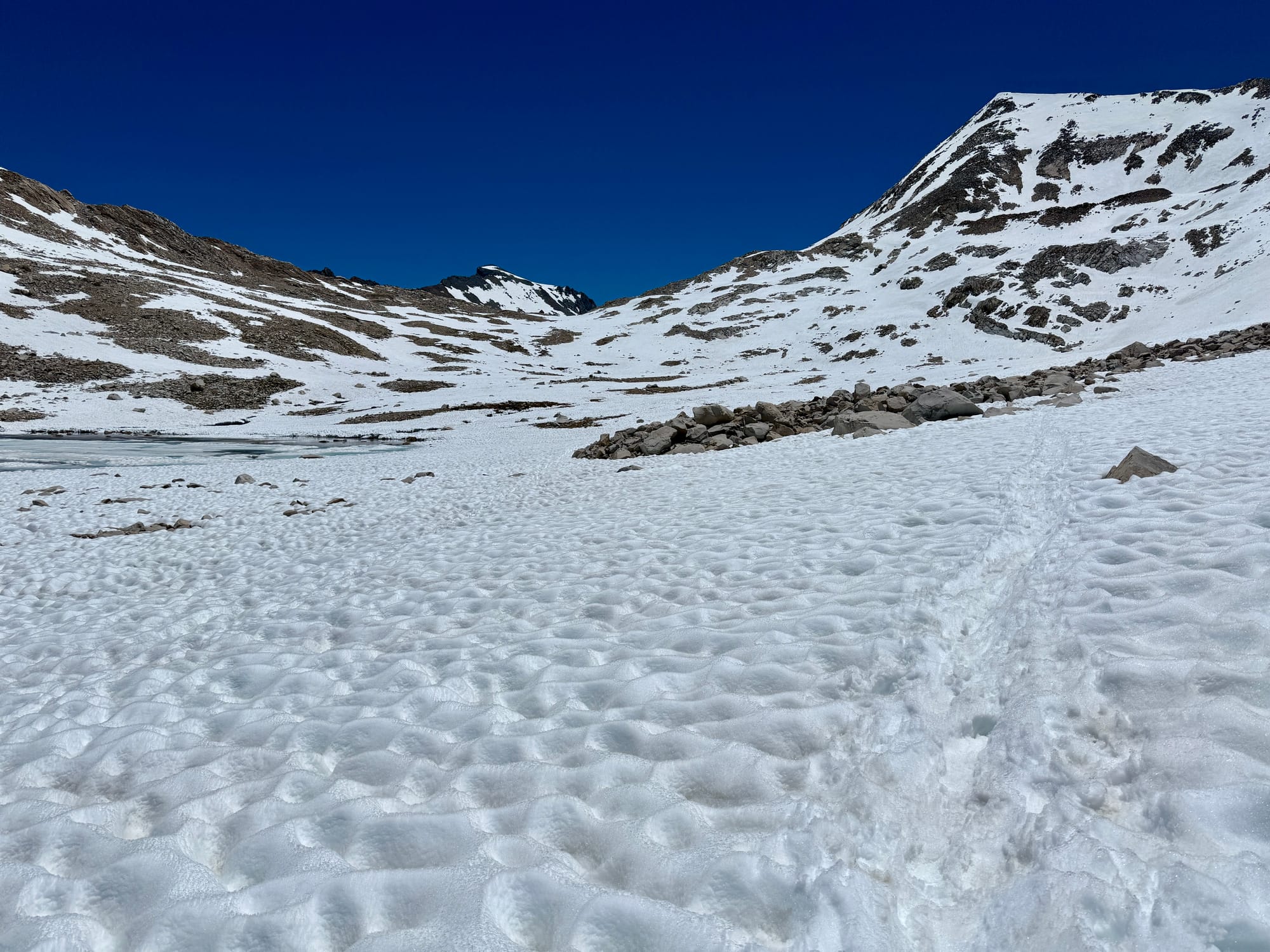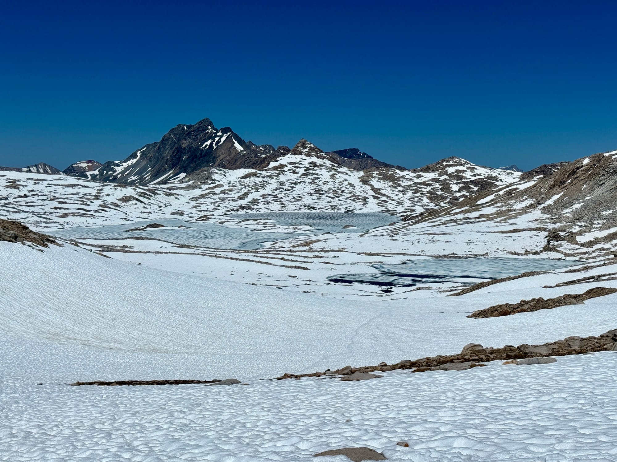 We knew we’d find snow up there, but figured with the rapid snow melt that it would be relatively easy to traverse. We were very wrong as we found ~2.5 miles of snow covering the last miles of the ascent and ~3 miles covering the first miles of the descent. With 8 miles and a pretty late AM start, the boot-packed snow was traversable but soft and a slog to get through.