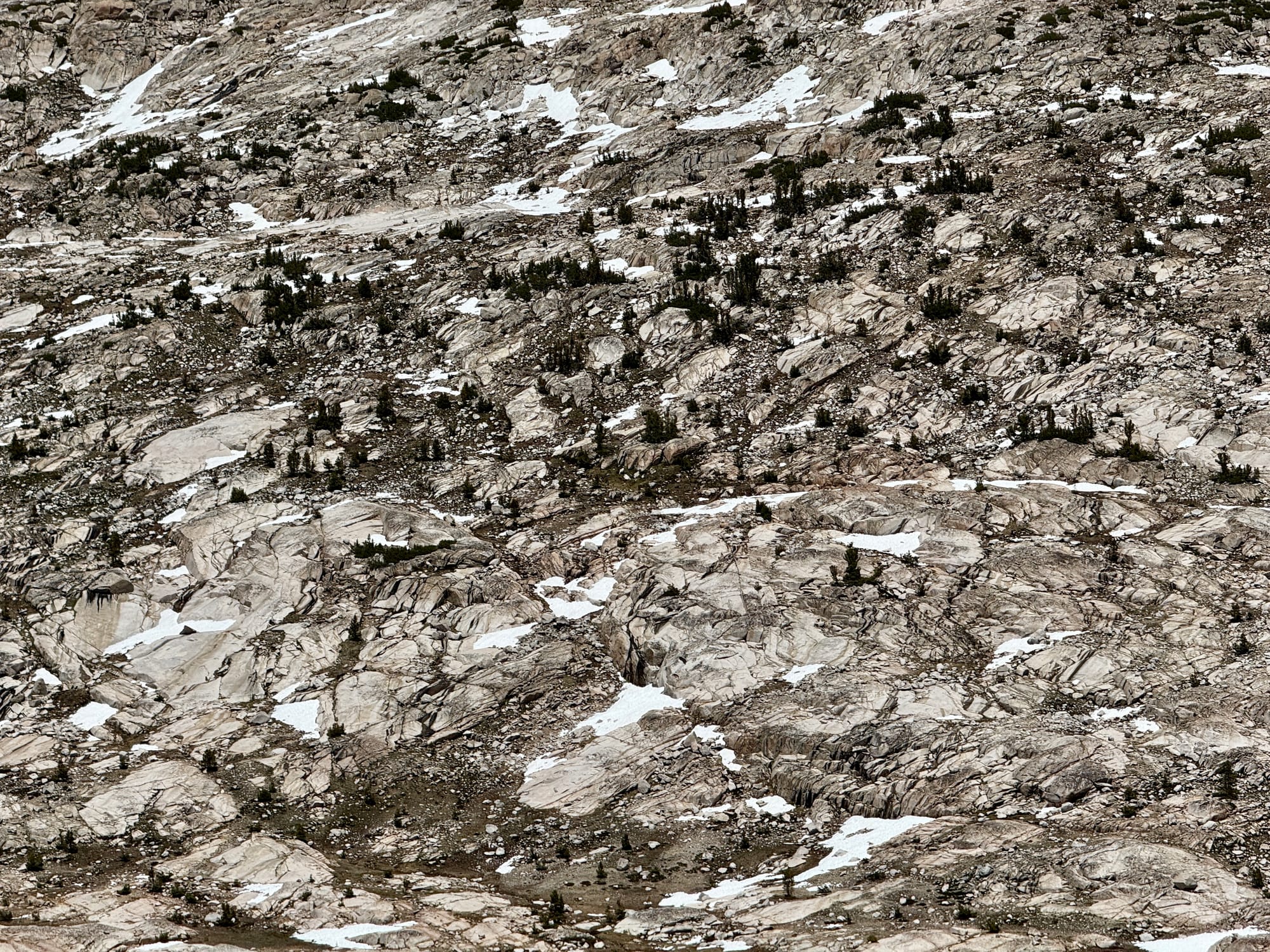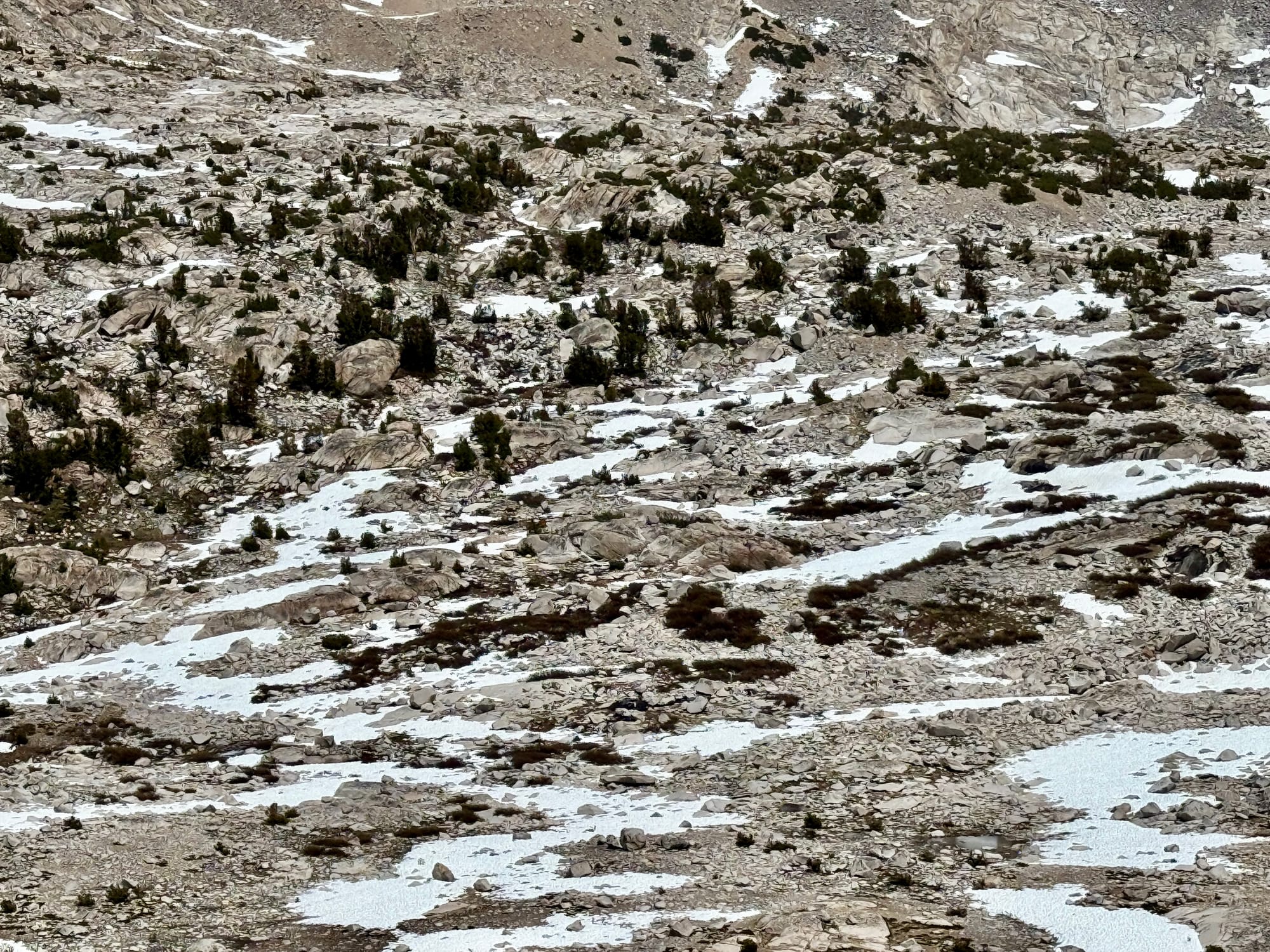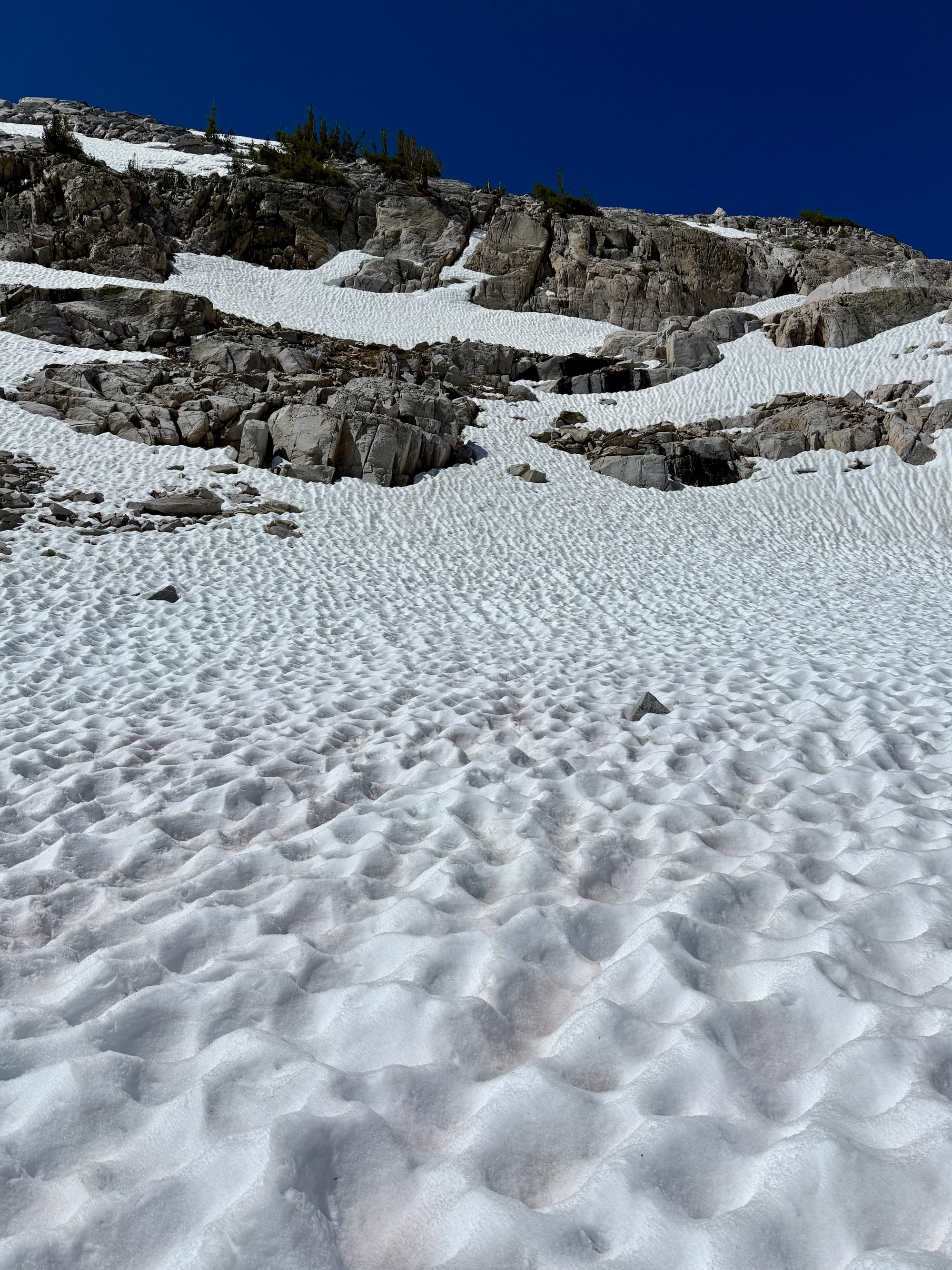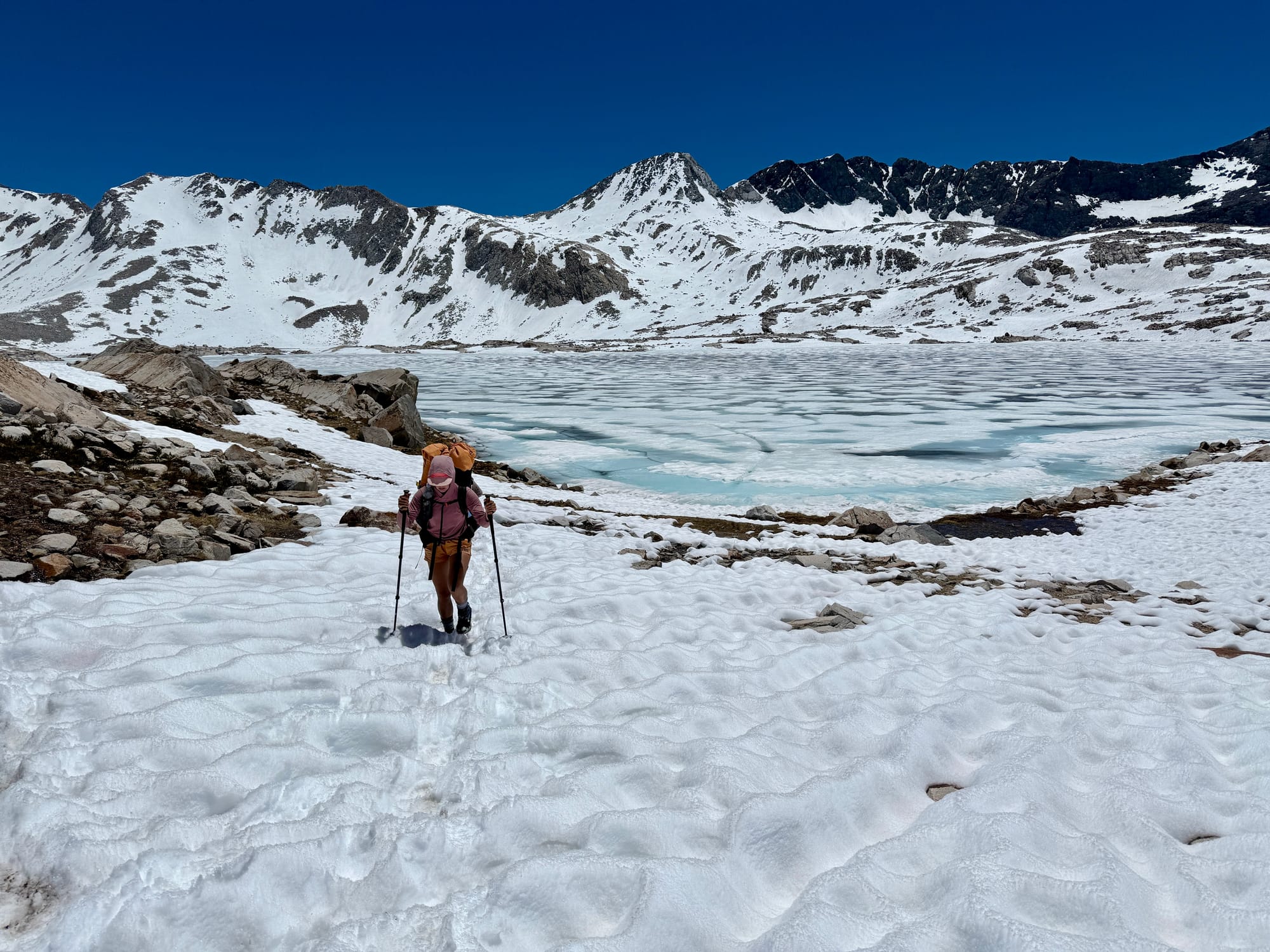 We knew we’d find snow up there, but figured with the rapid snow melt that it would be relatively easy to traverse. We were very wrong as we found ~2.5 miles of snow covering the last miles of the ascent and ~3 miles covering the first miles of the descent. With 8 miles and a pretty late AM start, the boot-packed snow was traversable but soft and a slog to get through.