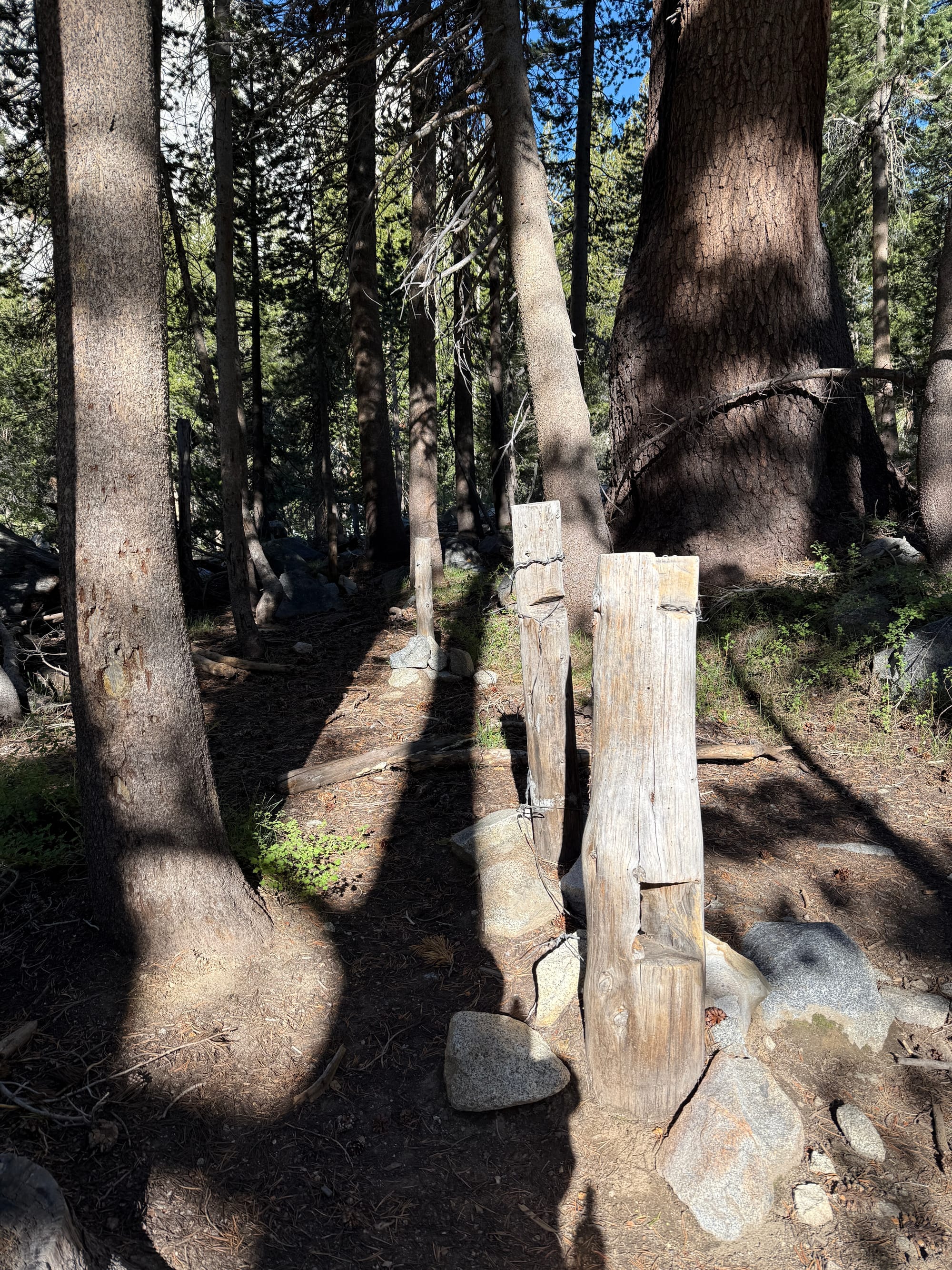 Old fence posts and barbed wire. I suppose an old grazing boundary. John Muir first visited the Sierra as part of a sheep herding outfit referring to sheep as “hoofed locusts”.