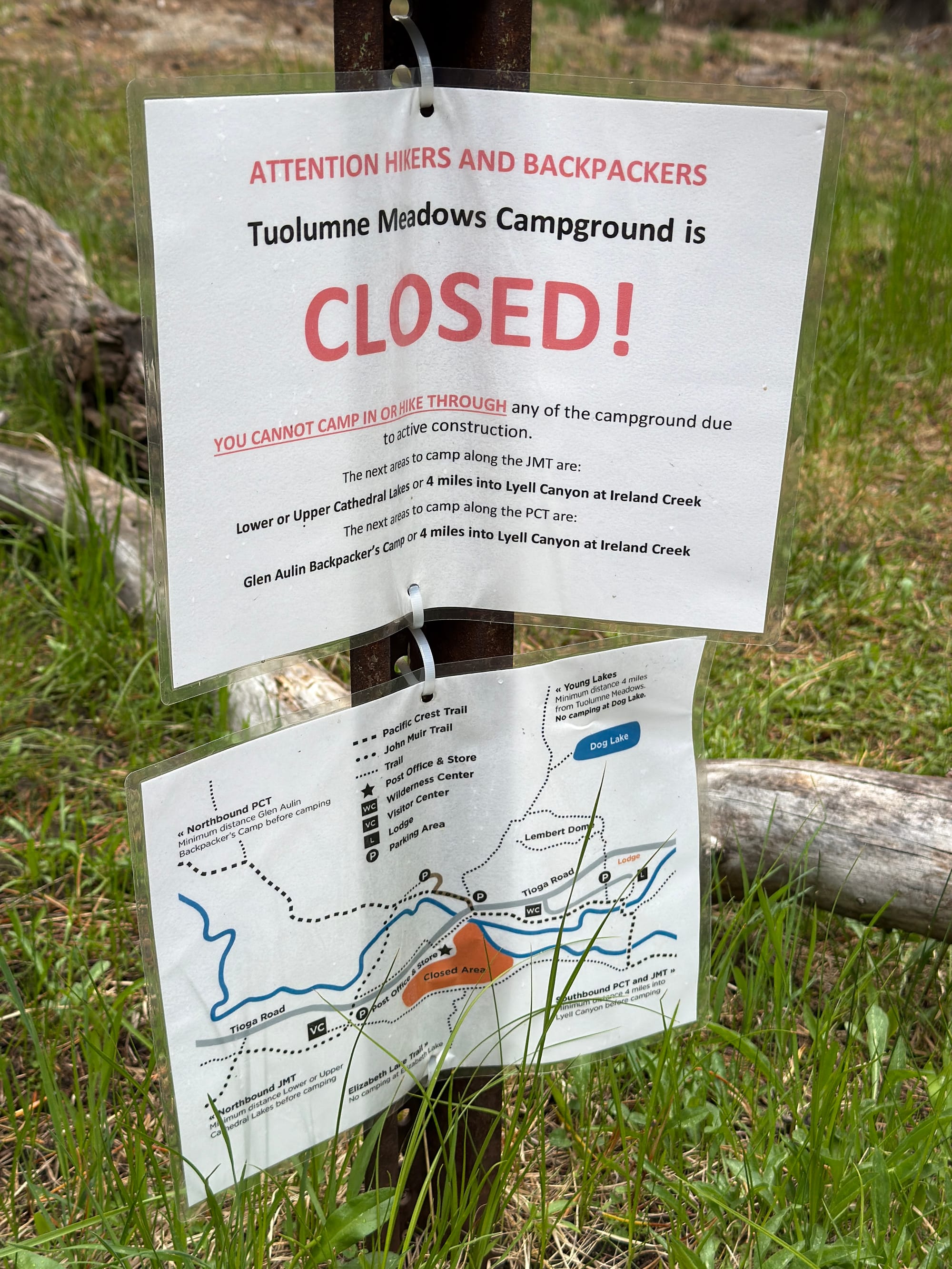 The Tuolumne Meadows Campground was closed for massive septic system repairs which left us with a 14 mile stretch in Yosemite without a place to sleep.