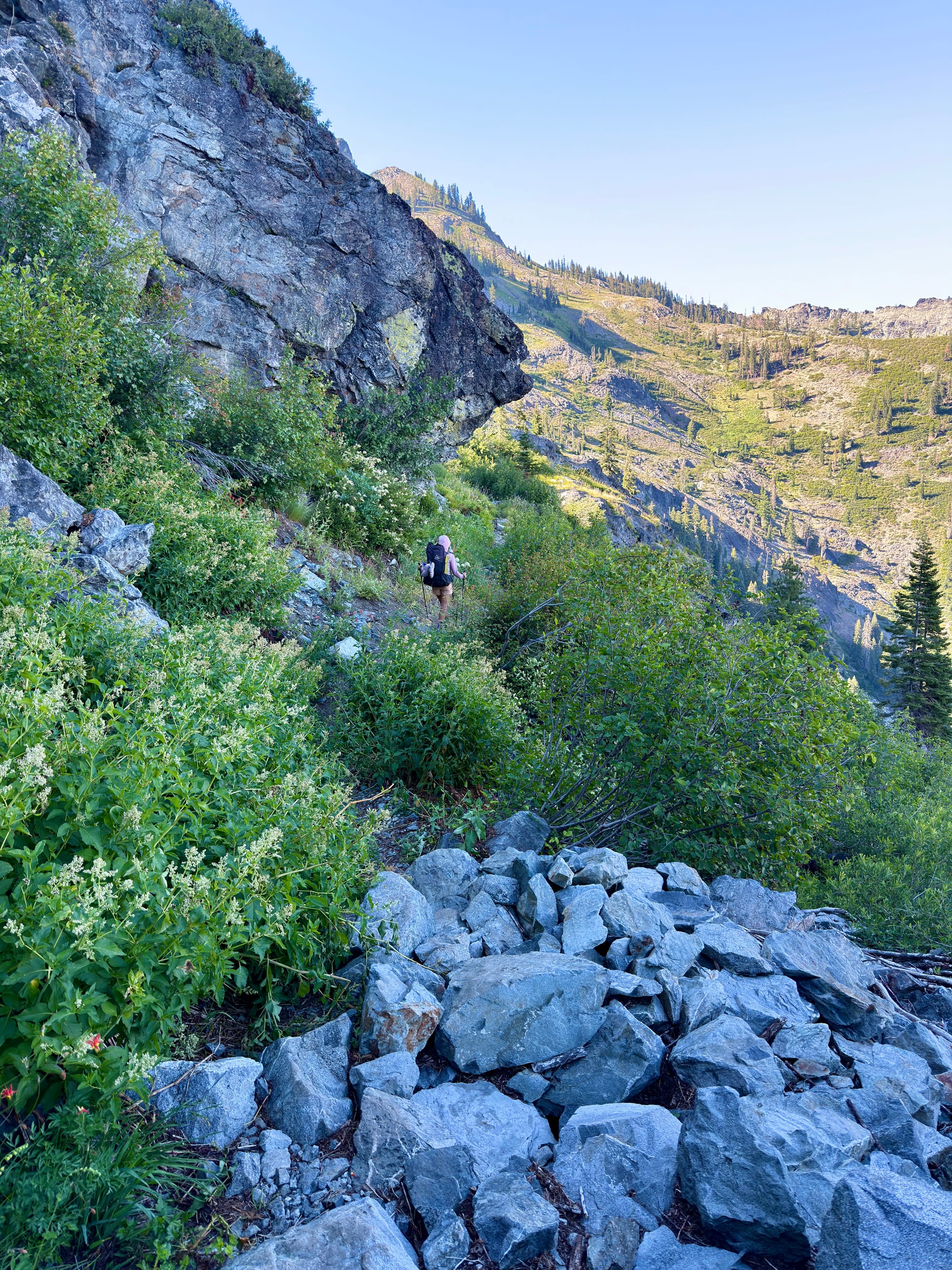 Making our way through a rough rocky stretch of trail with water from springs dripping down from above.