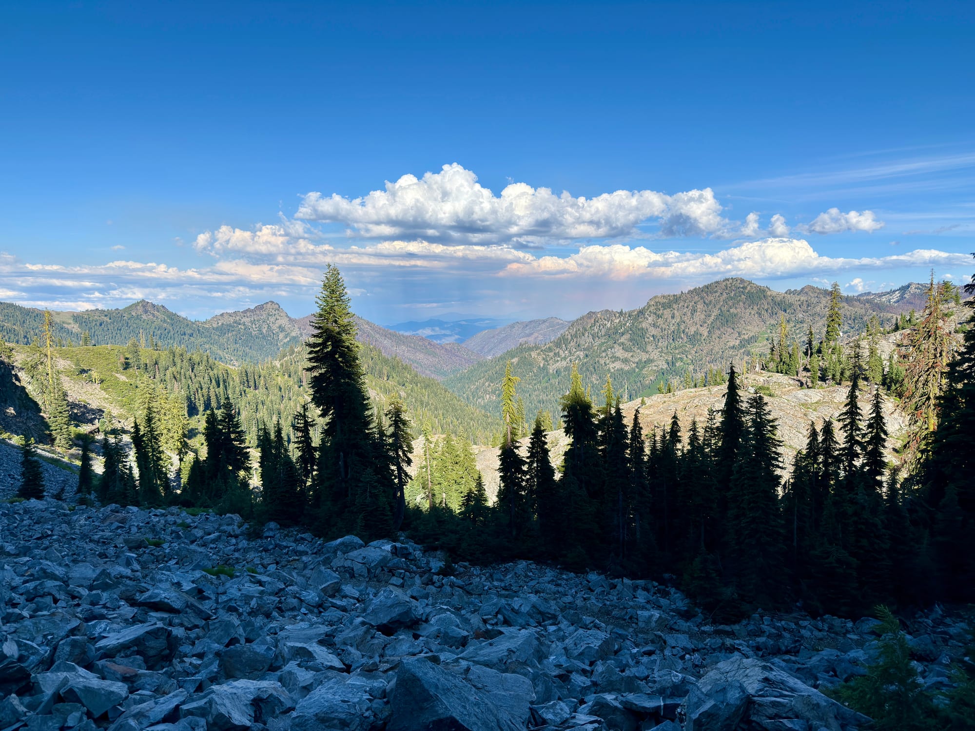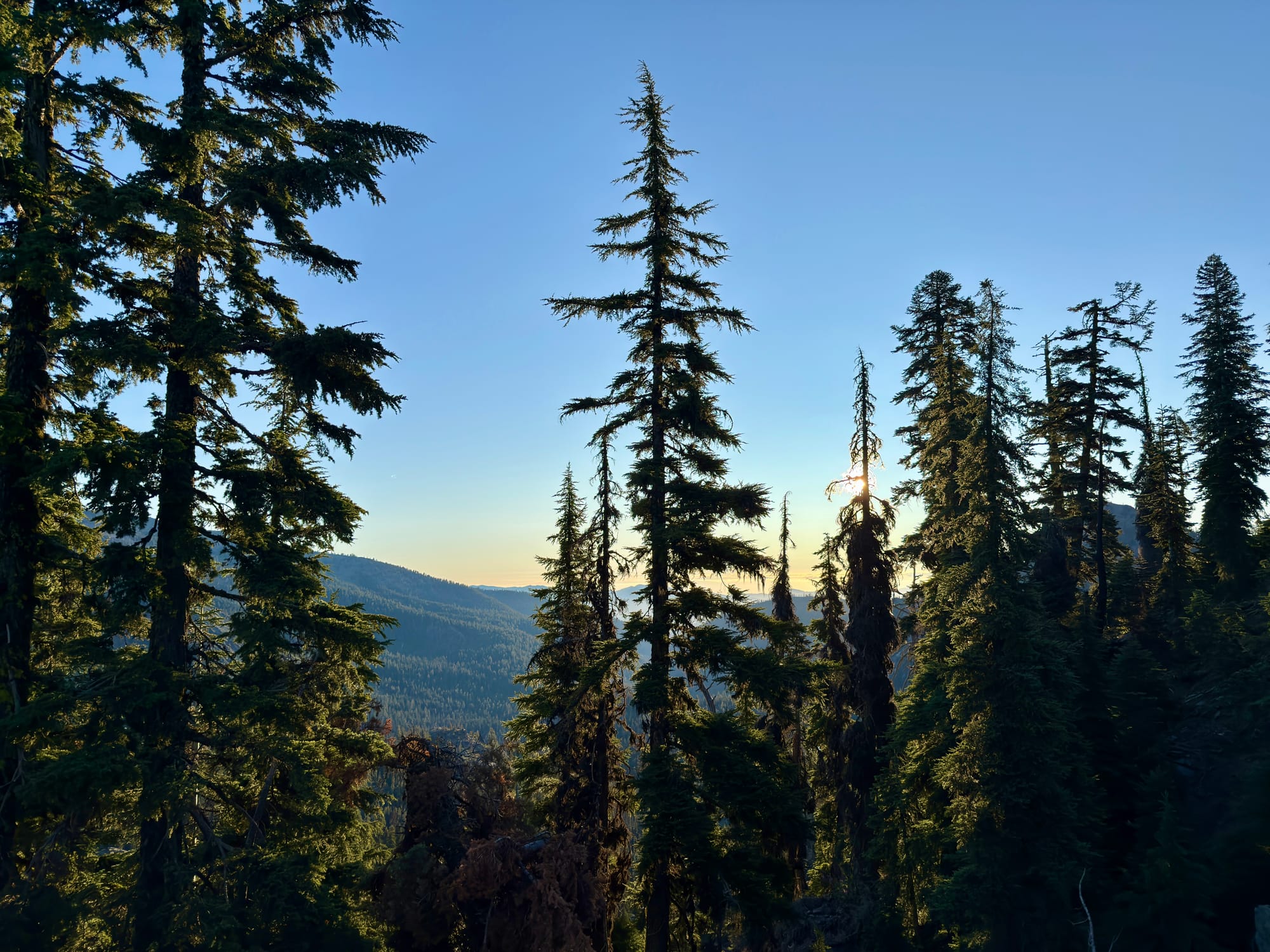 We found a campsite in a stand of live green trees on a windy ridge. It was a long strenuous day.
