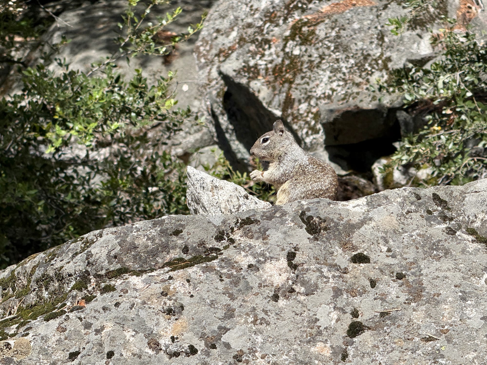 This squirrel was politely eating his dinner off a little rock table.